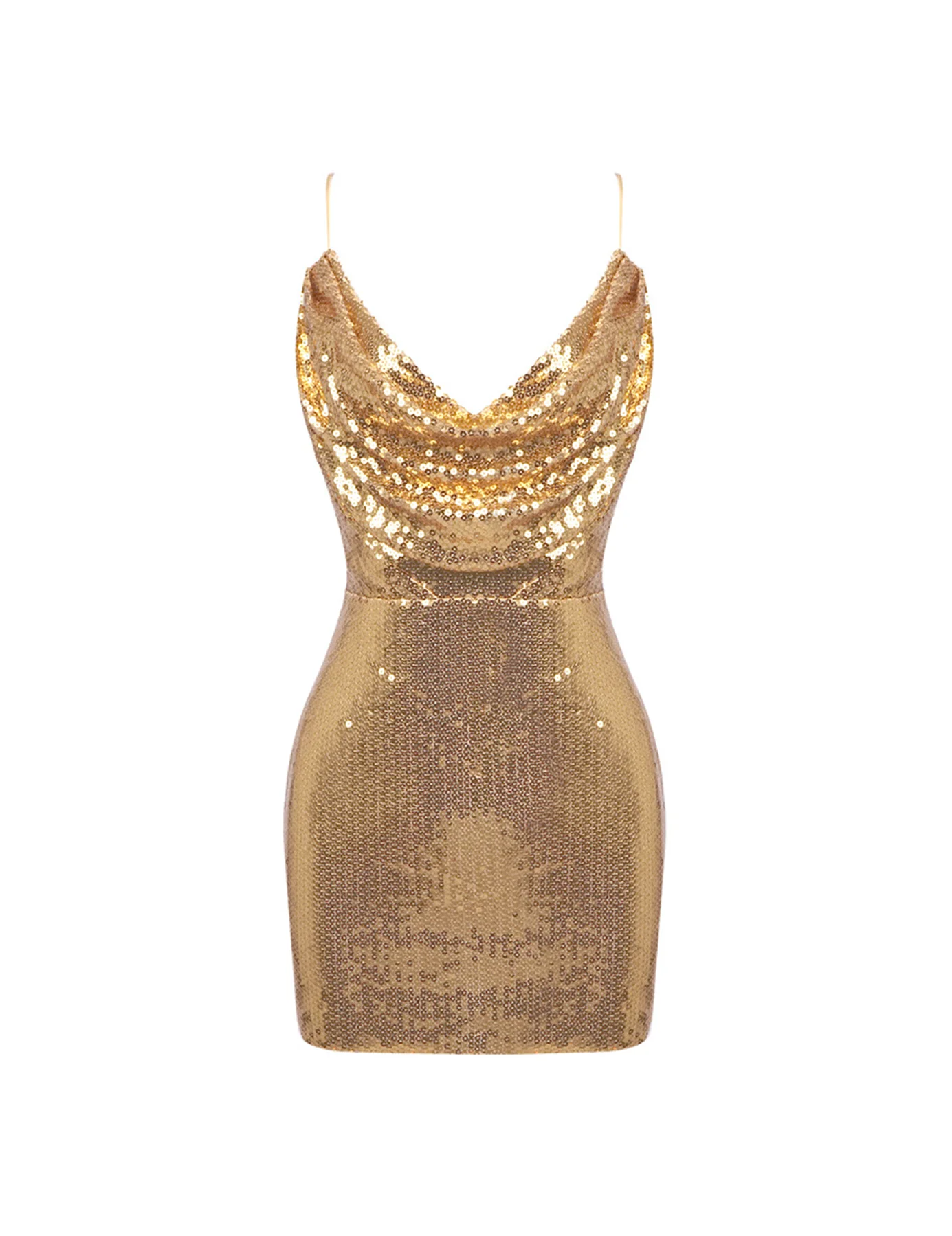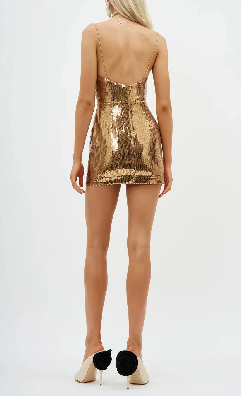 Elevate your style with our gold sequined tulle mini dress. The intricate sequins and draped design create a stunning silhouette that will make you shine all night long. Feel confident and wow the crowd in this dazzling dress. This dress features a concealed hook and zip fastening at the back, made from 95% polyester and 5% elastane with a lining of 84% acetate and 16% polyester. Dry clean only. Please note that the color may vary slightly due to lighting. The product images without models are the closest representation of the actual color. The item runs true to our size chart, ensuring the perfect fit. Do not size up or down.