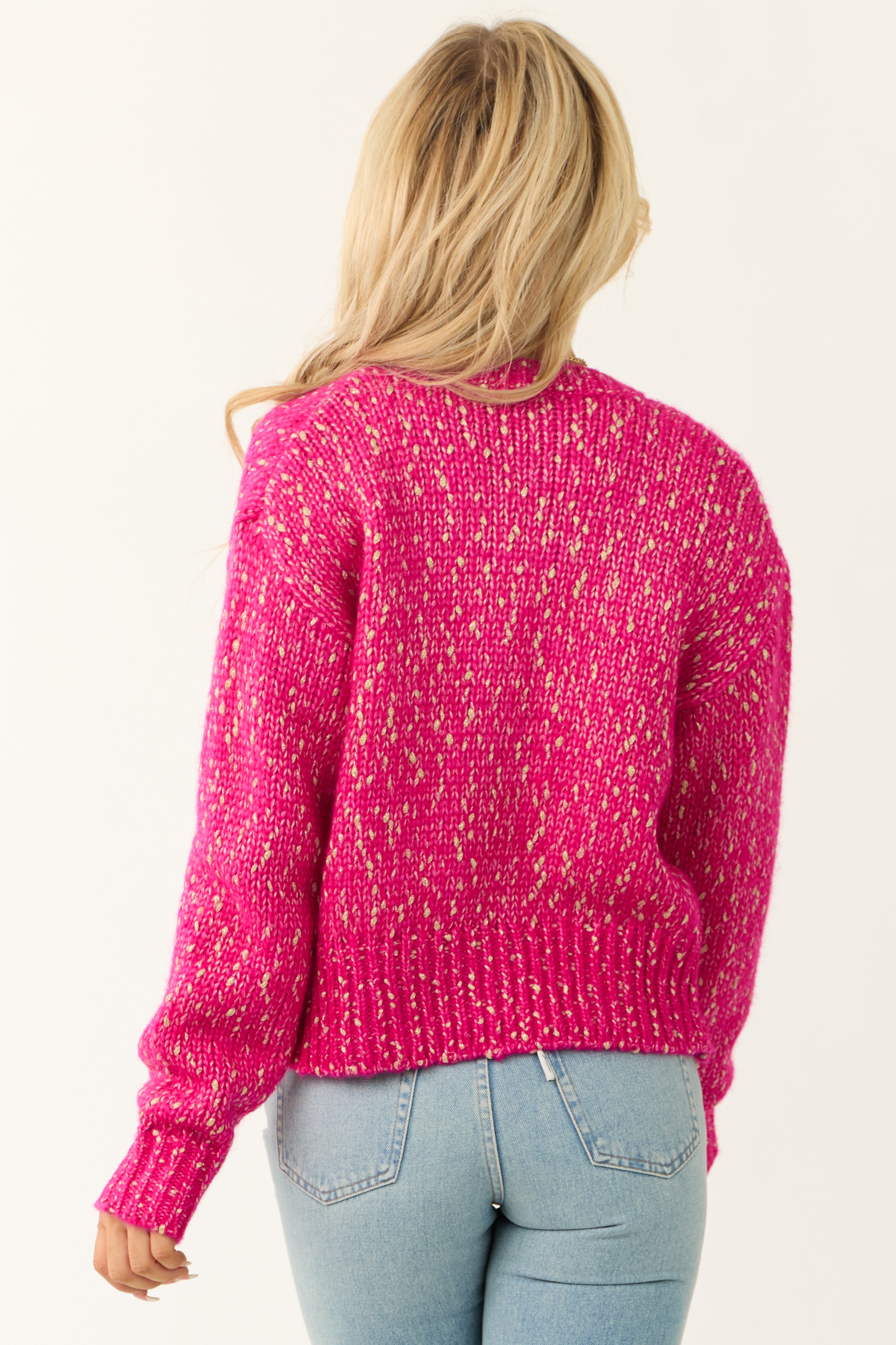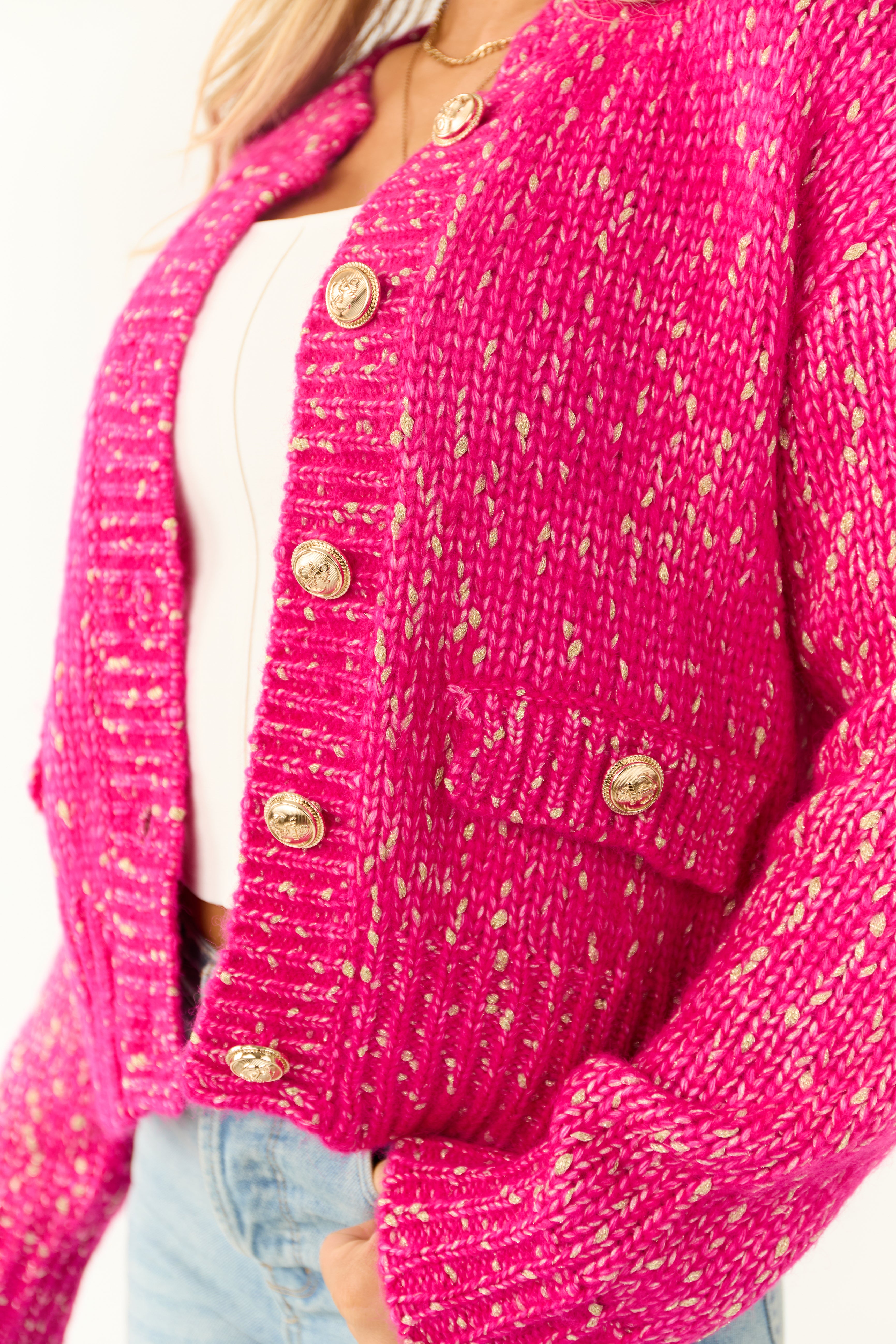 Stay stylish and cozy in this Gold Speckled Rib Knit Button-Up Cardigan. Crafted from a blend of 47% Polyester, 27% Nylon, and 26% Acrylic, this cardigan features a high neckline, faux front pockets, drop shoulder design, and ribbed banded trim. The stretchy rib knit and gold anchor medallion buttons add a touch of sophistication. Whether worn for work or daytime outings, this cardigan is a versatile addition to your wardrobe. Hand wash cold, line dry. Available in sizes S, M, L, and XL.