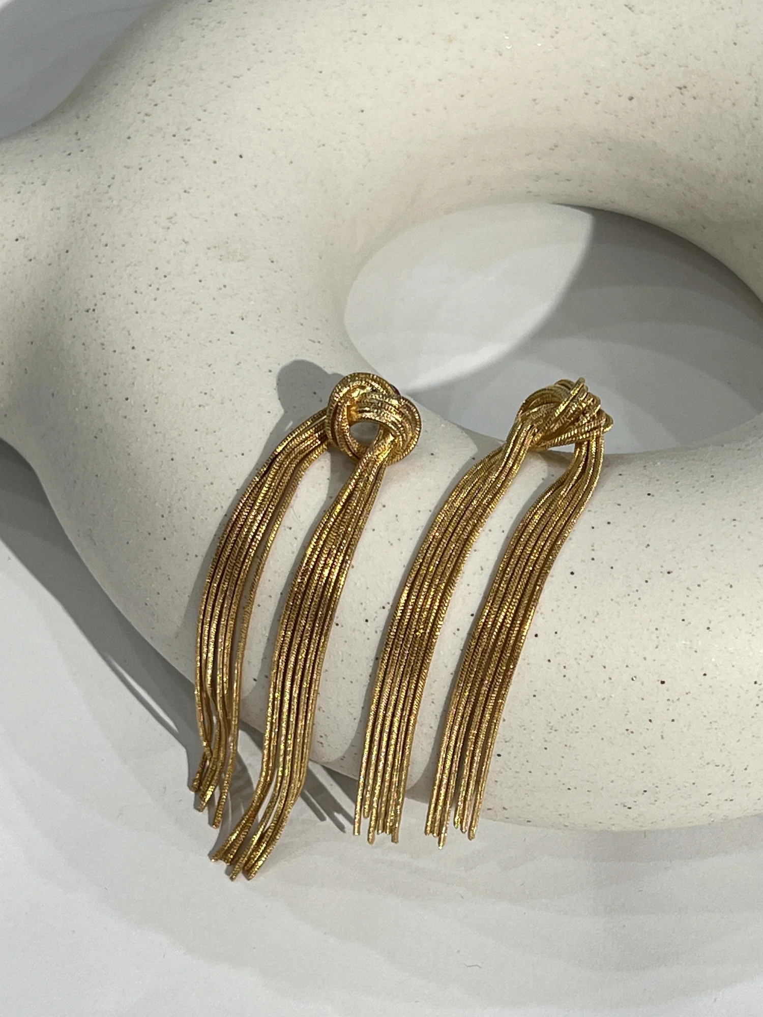 Indulge in luxury with these stunning Golden Tassel Drop Earrings by Night Novas. The intricate design features delicately tied tassels in a lustrous gold plating that exudes sophistication and charm. Elevate your style with these statement earrings that effortlessly blend elegance and glamour, perfect for any occasion.