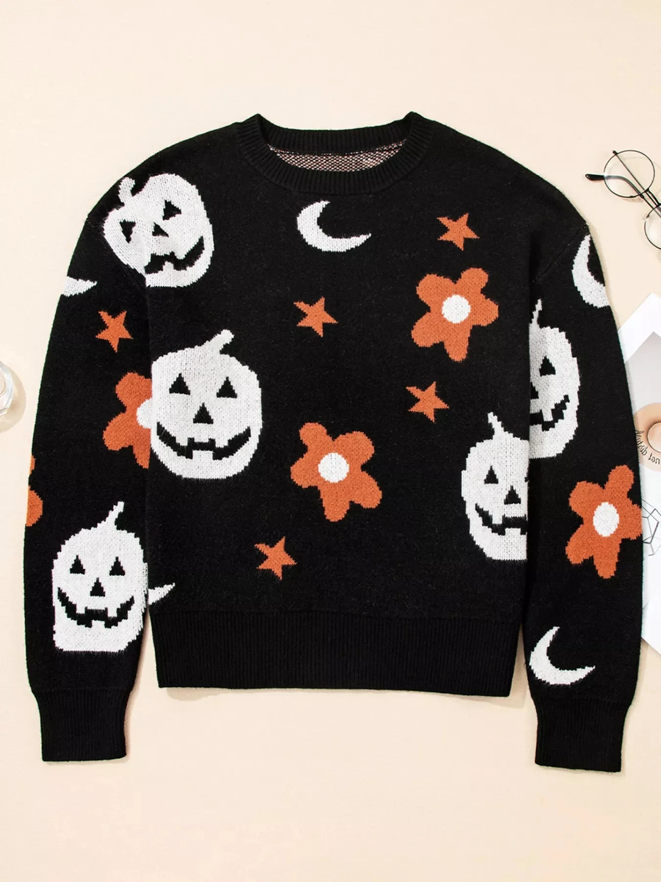This Halloween Gothic Pattern Long Sleeve Sweater in black offers a basic style with a slight stretch for comfort. Made of 52% viscose, 26% polyester, and 22% polyamide, this sweater is machine washable for easy care. Imported with top length and bust measurements, this trendy sweater is a must-have for the season.