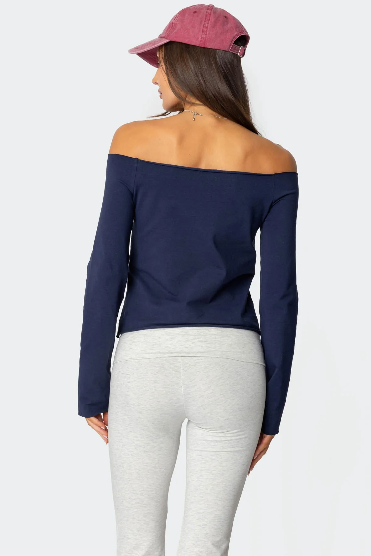 Indulge in style and comfort with our Graphic Text Off-Shoulder Top in Navy. This top features long sleeves, an off-shoulder fit, raw neckline, and hem for a trendy look. Crafted from a blend of premium quality cotton and spandex, it offers a perfect blend of softness and stretch. The model showcases the top in size S with a height of 59. Care for this chic piece by machine washing at a maximum of 30ºC, avoiding bleach, tumble drying low, ironing at a maximum of 110ºC, and steering clear of dry cleaning. Elevate your casual wardrobe with this versatile and stylish top.