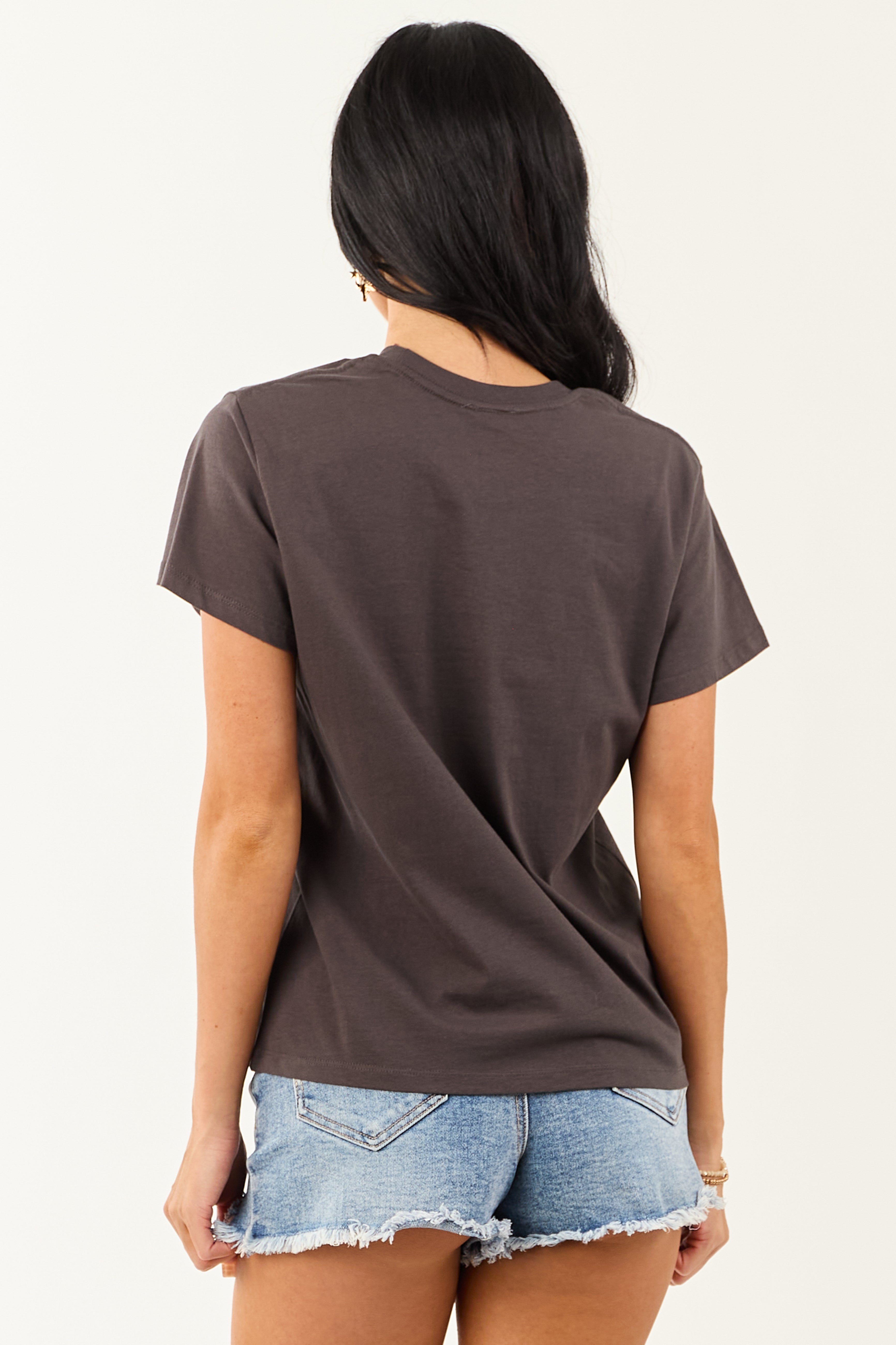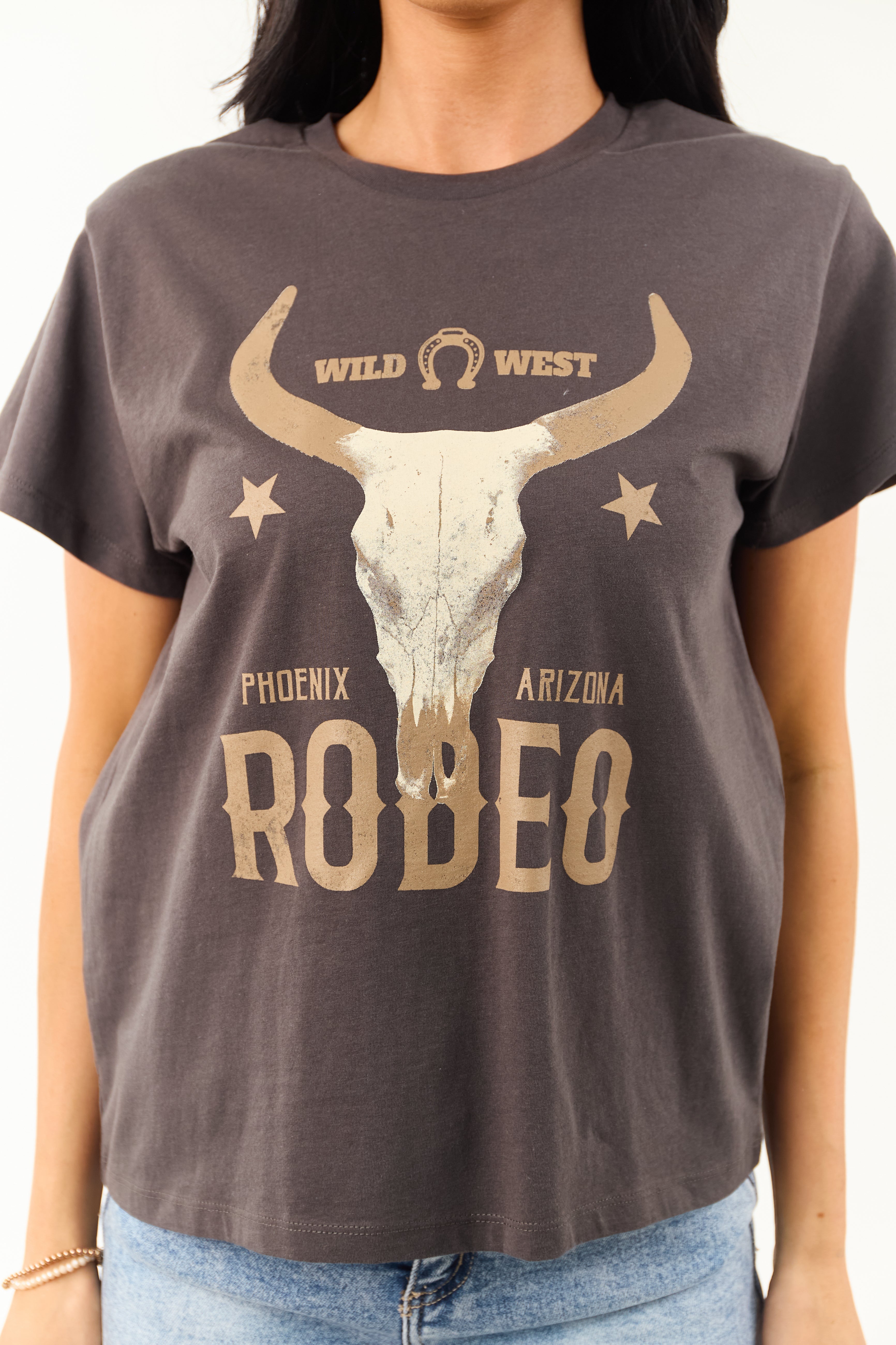 Embrace the rough and rowdy charm of our Graphite Cotton Graphic Short Sleeve TopRodeo. This versatile top features a playful graphic in Peanut and Vanilla shades, crafted from stretchy lightweight cotton for an oversized yet cozy fit. Available in sizes S, M, and L with bust measurements ranging from 40″ to 44″. The length varies from 26″ to 27″, while the sleeve length spans from 6″ to 8″. Perfect for a casual yet stylish look. Model is wearing a size Small.