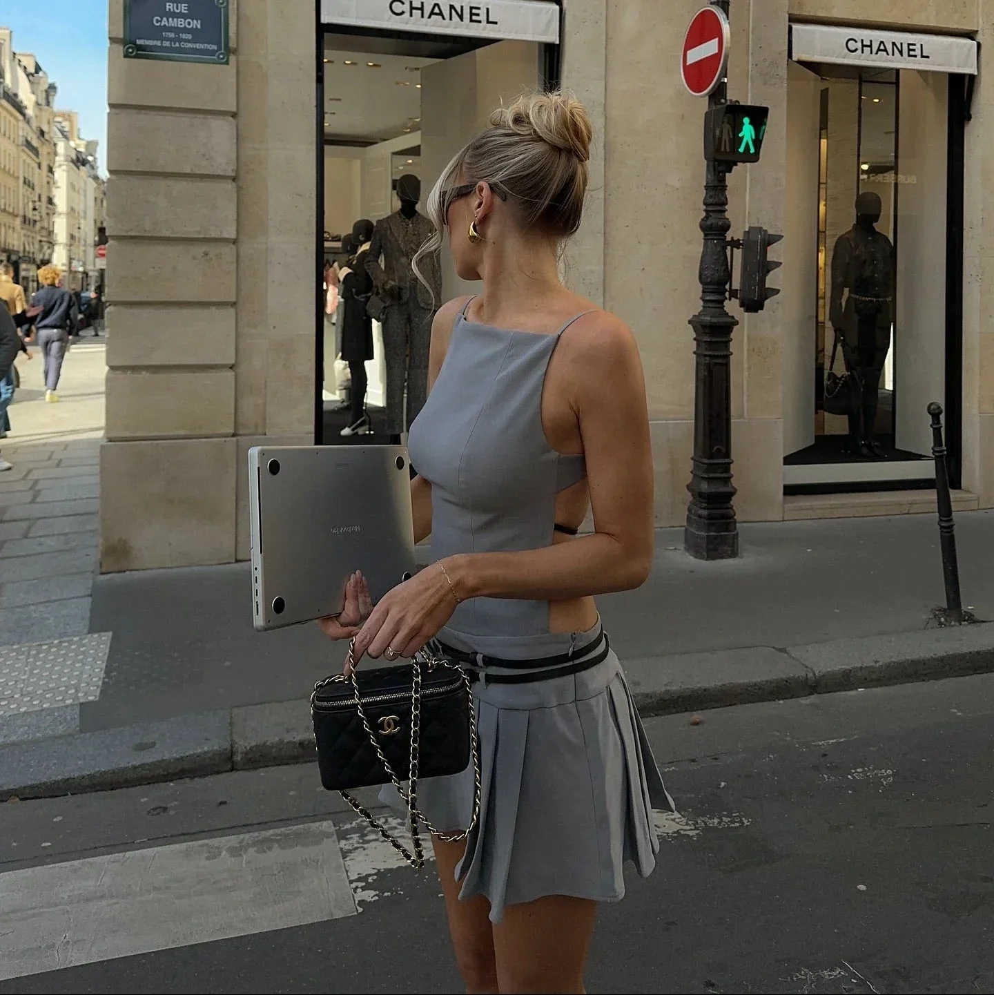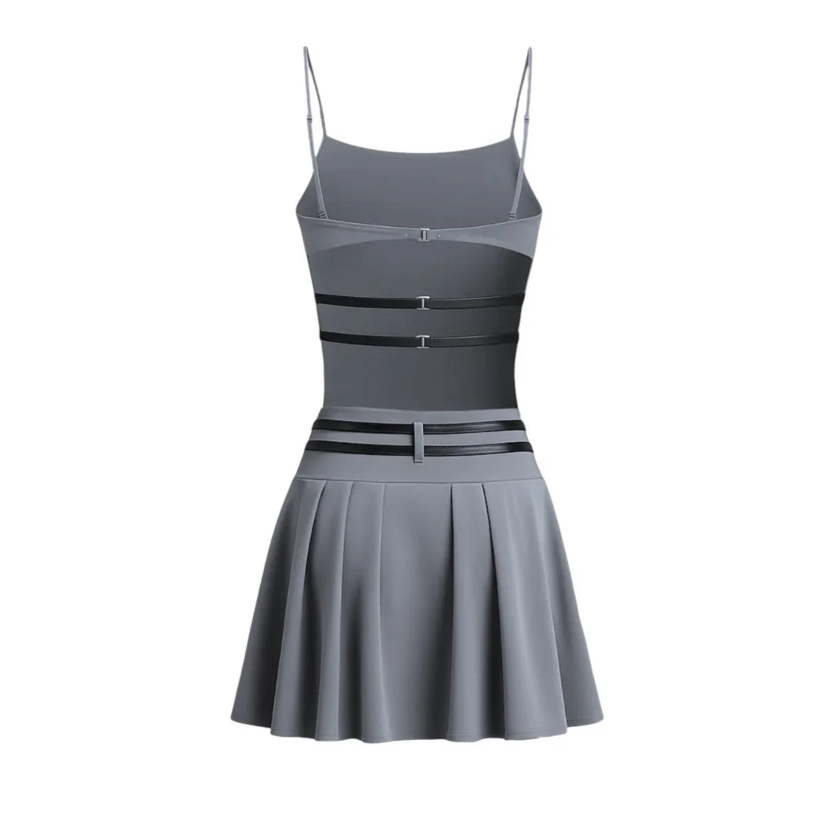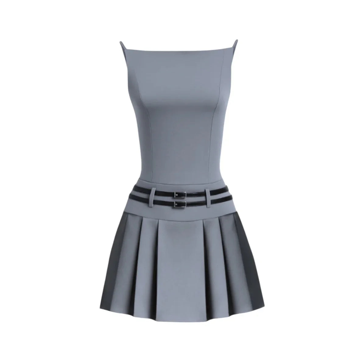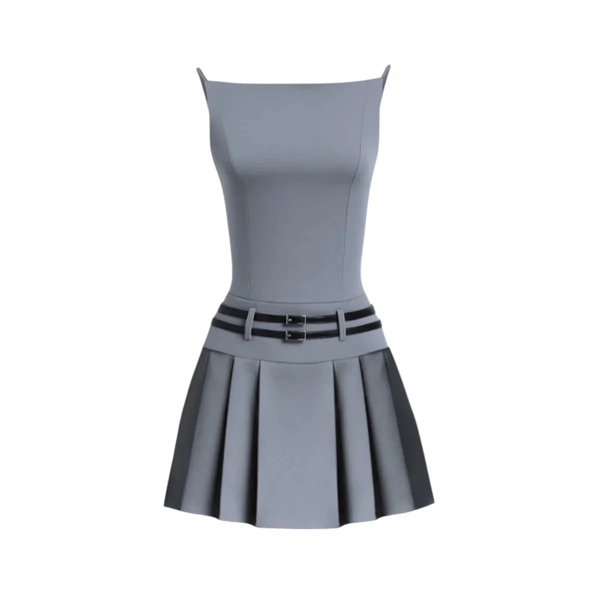 Embrace modern elegance with the Gray Belted Pleated A-Line Mini Dress . Crafted from a sculpting, slightly stretchy suiting fabric, this dress features a sharp boat neckline, a contoured bodice, and a crisp box-pleat skirt. The double belt detailing at the front accentuates the waist, while the open back adds a touch of allure. Perfect for elevated evenings and standout events, this dress seamlessly blends boldness and refinement. If sizing is not perfect, we offer complimentary size exchanges.