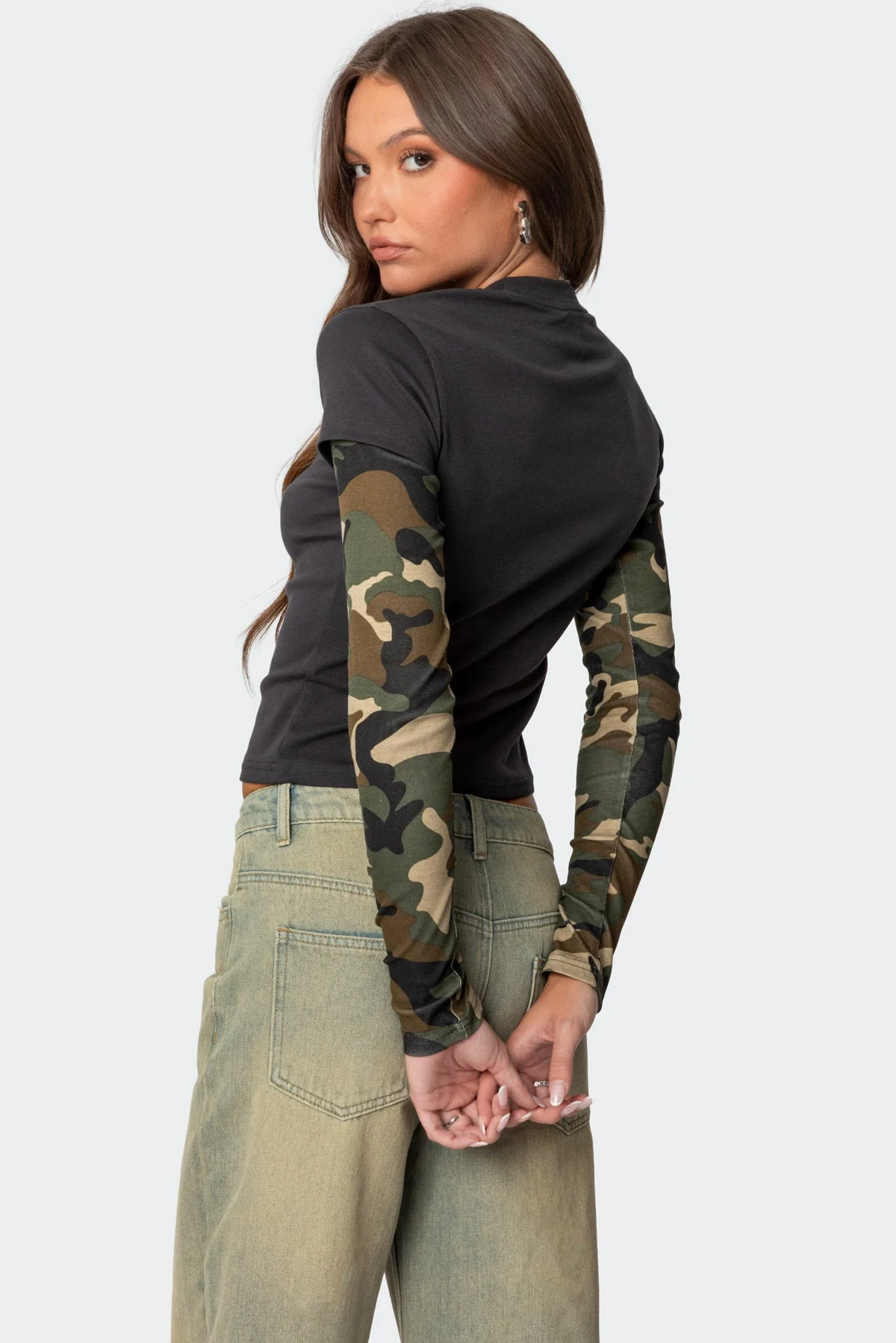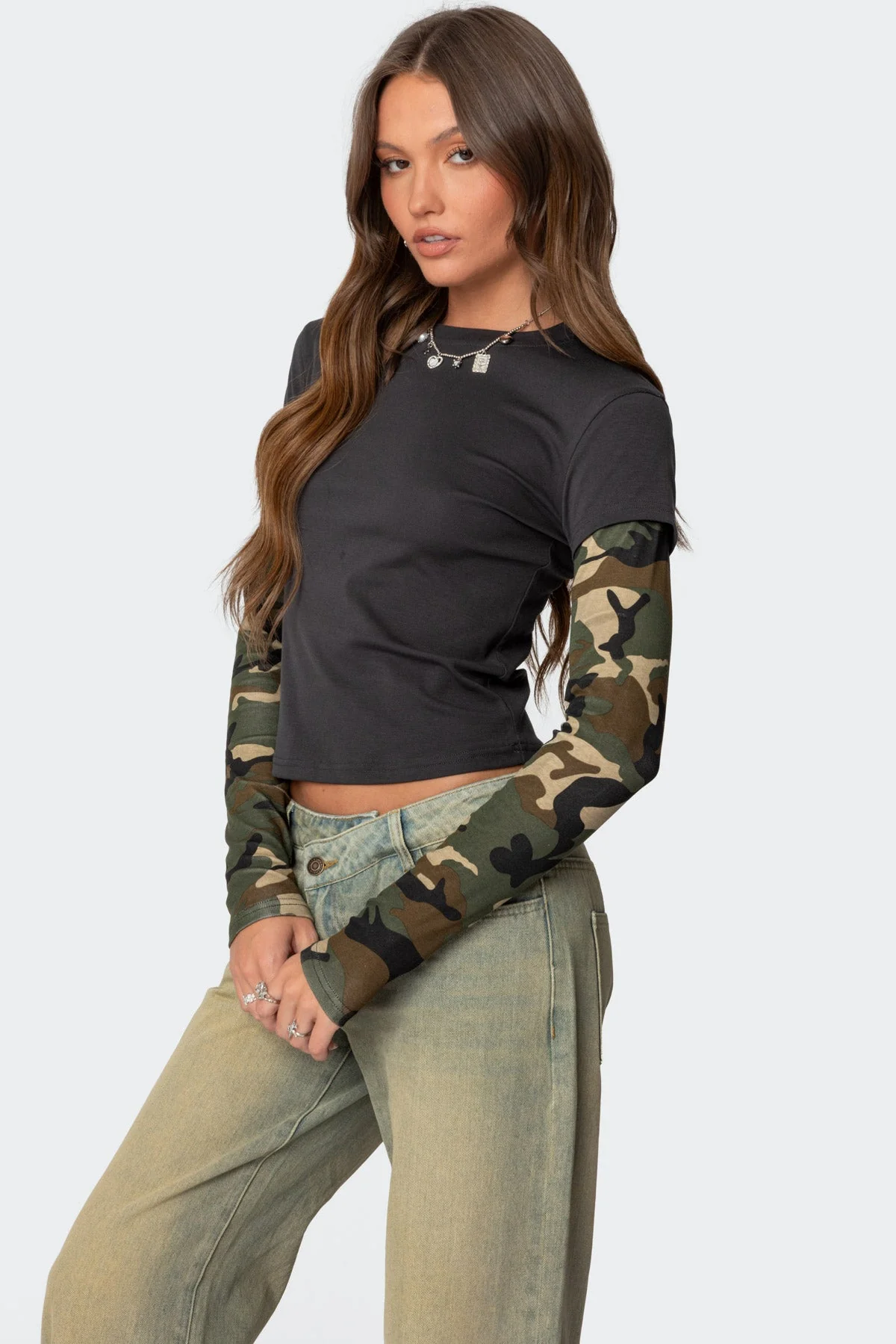 Elevate your style with our Gray Camo Layered Long Sleeve Shirt. This trendy t-shirt features a unique layered design with contrasting camo sleeves. Made of comfortable cotton and spandex blend, it offers a perfect balance of style and comfort. Ideal for everyday wear, this shirt is a versatile addition to your wardrobe. The model is wearing size S and is 58 tall. Care instructions: Machine wash at max 30ºC, do not bleach, tumble dry low, iron at max 110ºC, do not dry clean.