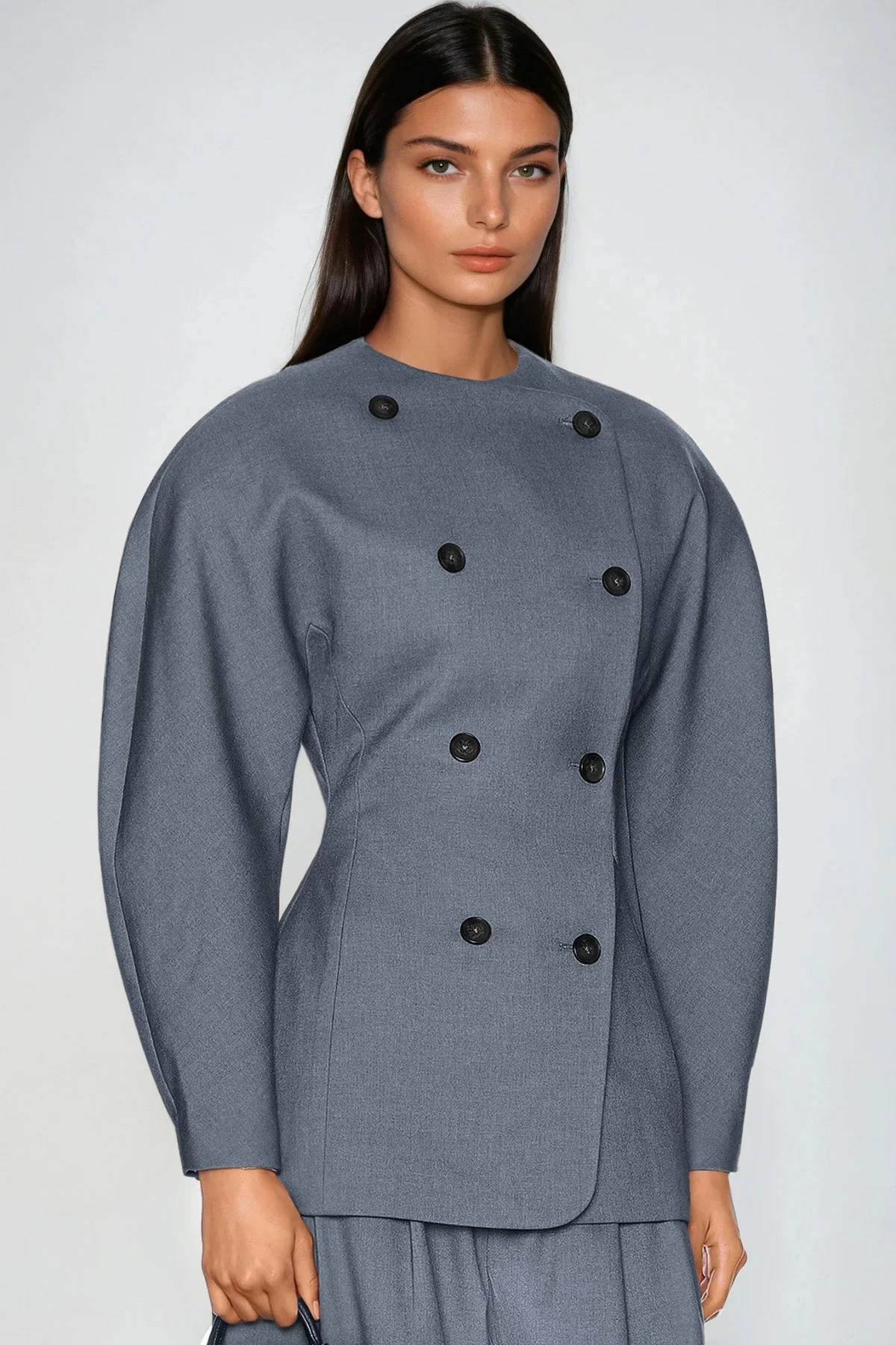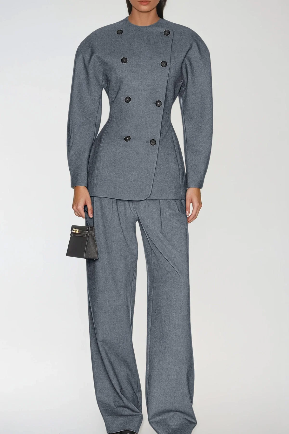 The Gray Double Breasted Tailored Pants Set offers a sophisticated look with its double-breasted jacket and tailored pants. Ideal for professional settings or upscale events, this set combines classic tailoring with modern sophistication. Designed to enhance confidence and sharpness, it delivers comfort and style in one versatile ensemble. Please note that the jacket and pants are sold separately. Order both for the complete set. Stretch Factor: Non Stretch. Care Instructions: Gentle machine wash recommended. Color may vary due to lighting in images.