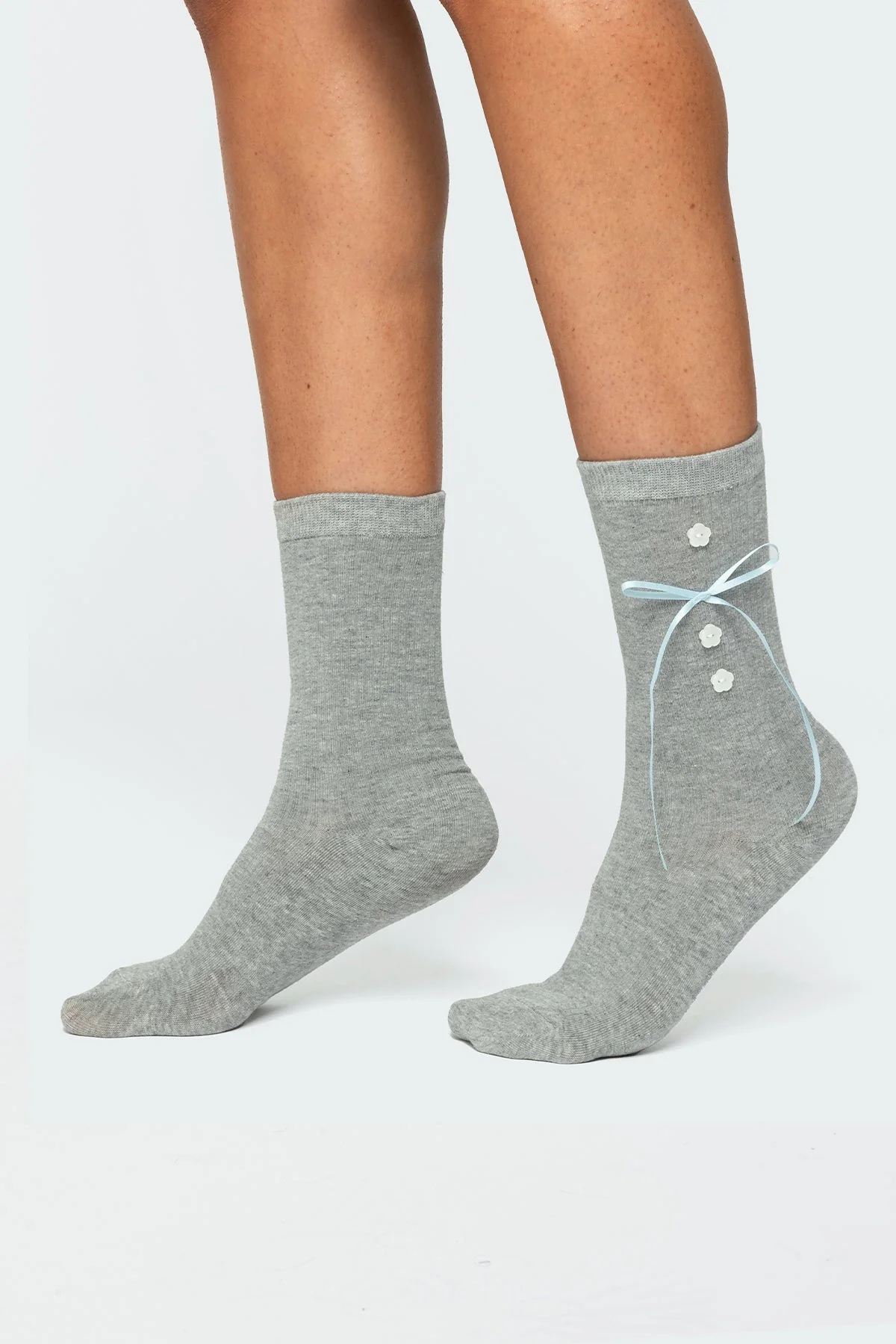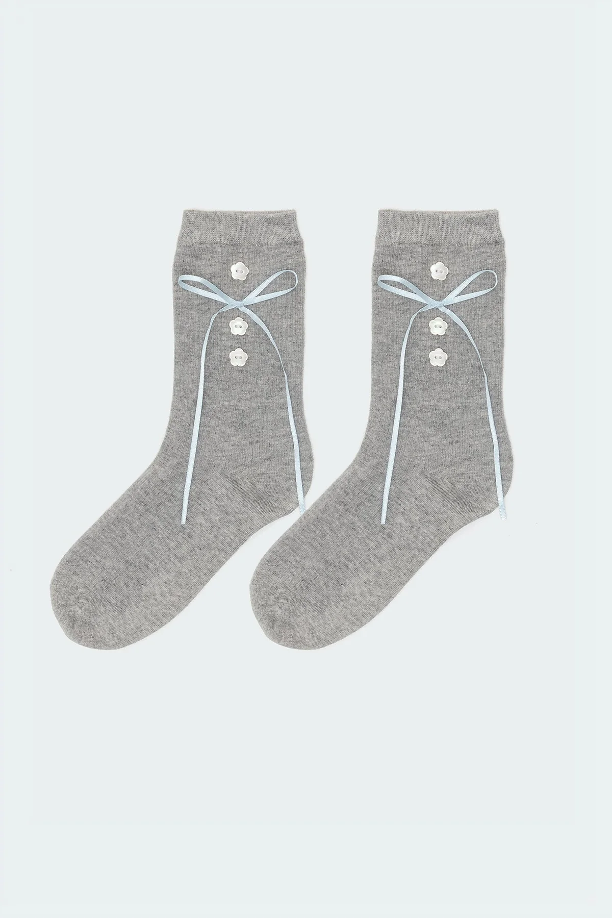 These Gray Ribbon Bow Socks feature charming flower button detailing, made of cotton and polyester for comfort. With a length of 12.2 inches, these socks are machine washable for easy care. Stay stylish and cozy all day long with these fashionable socks.