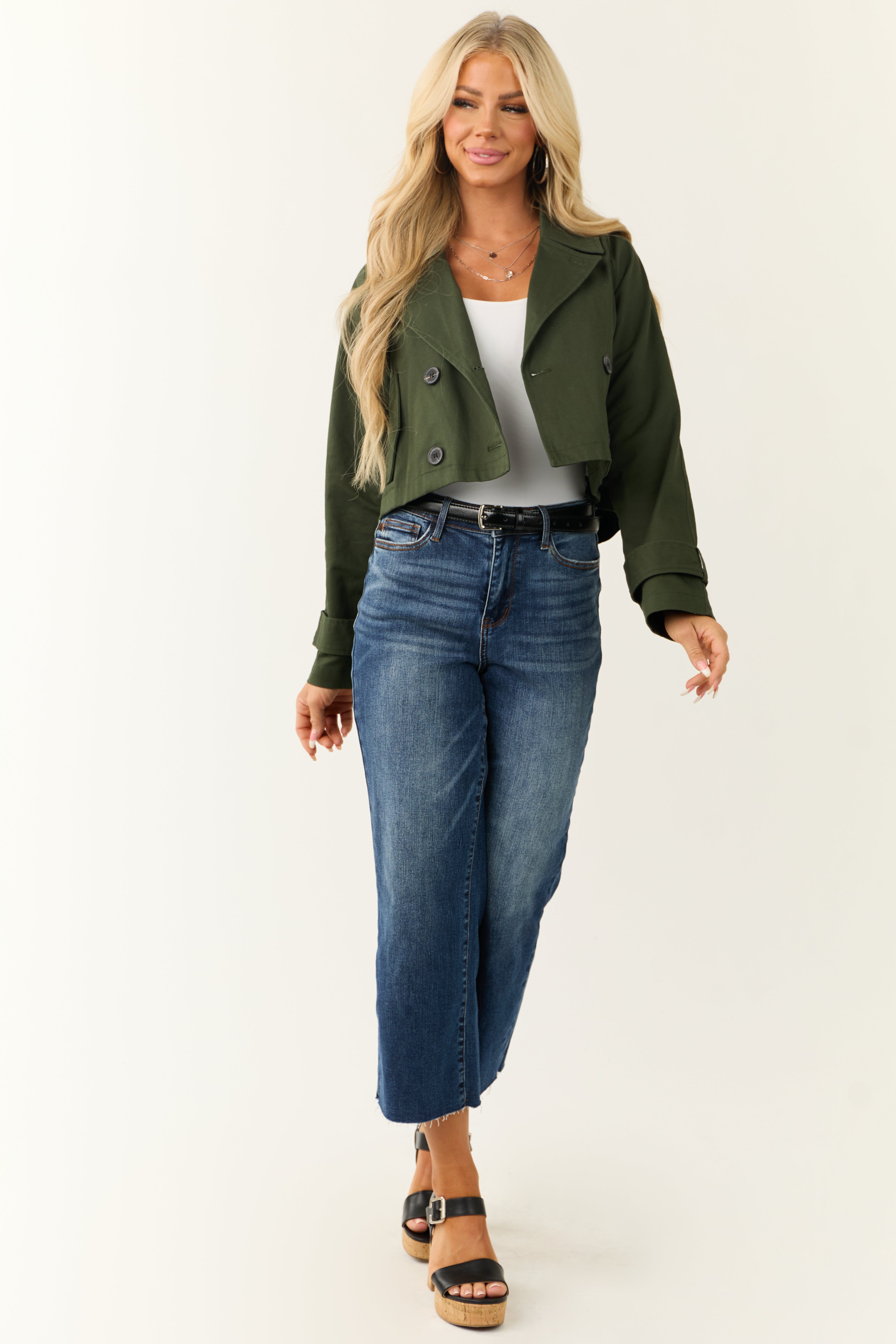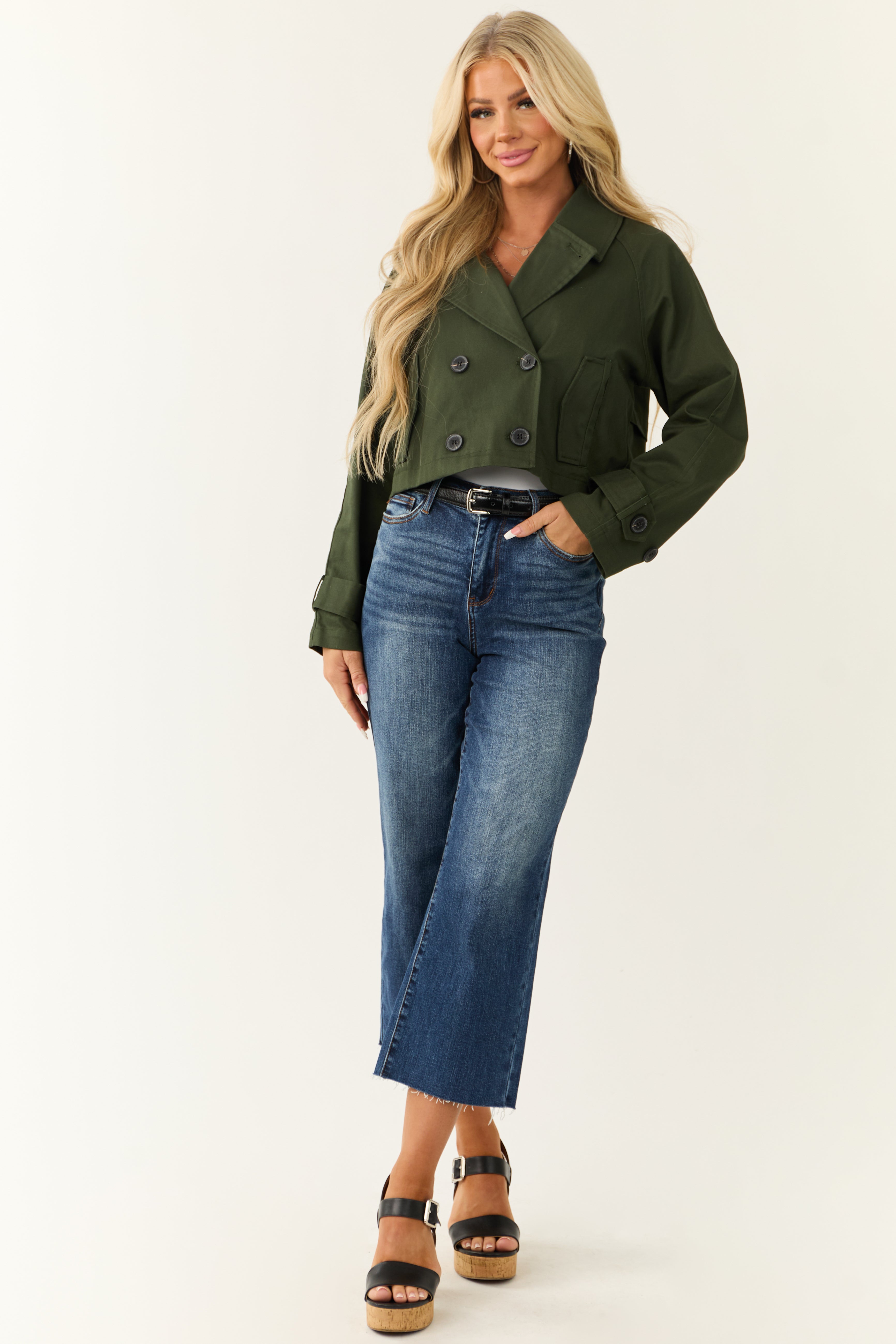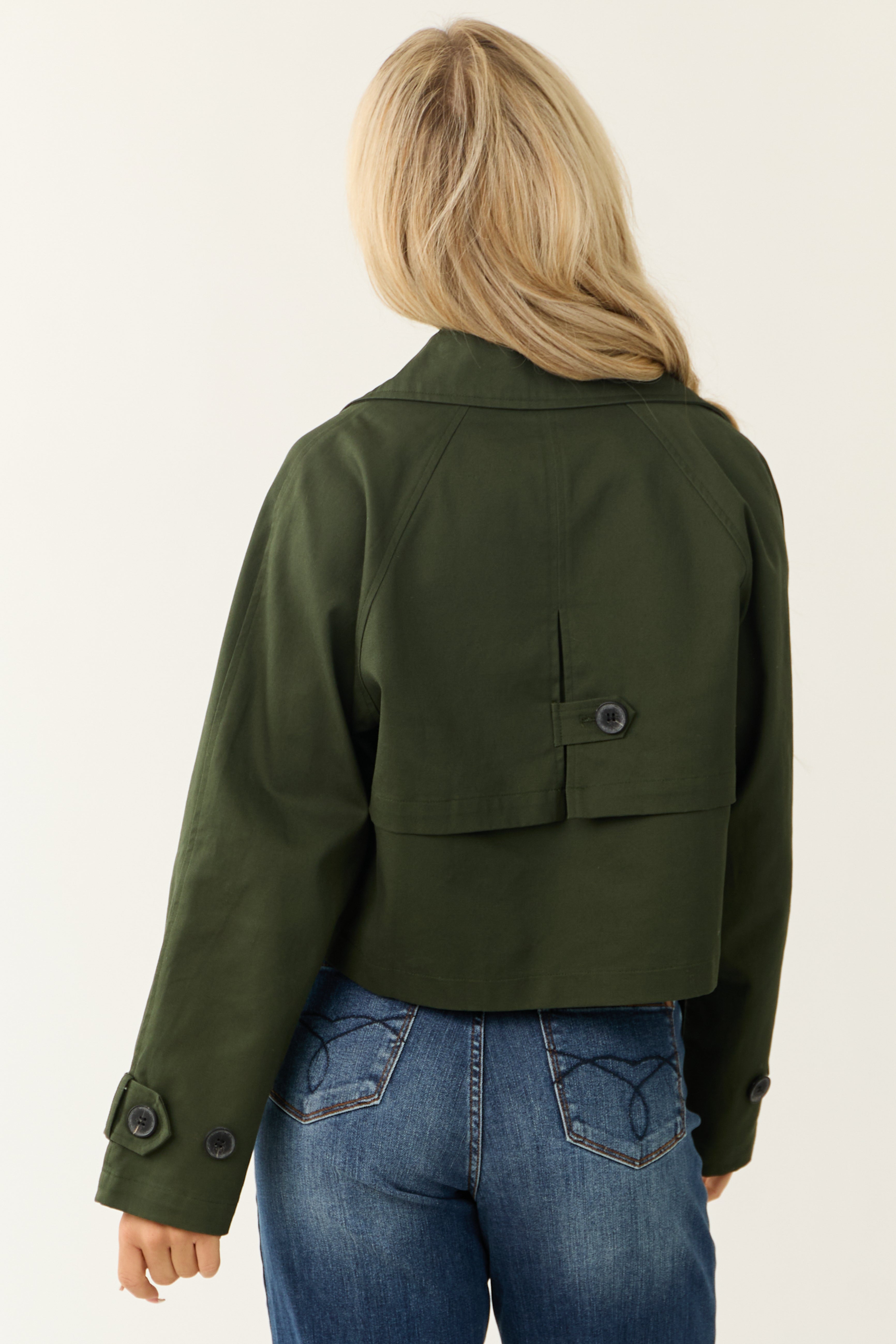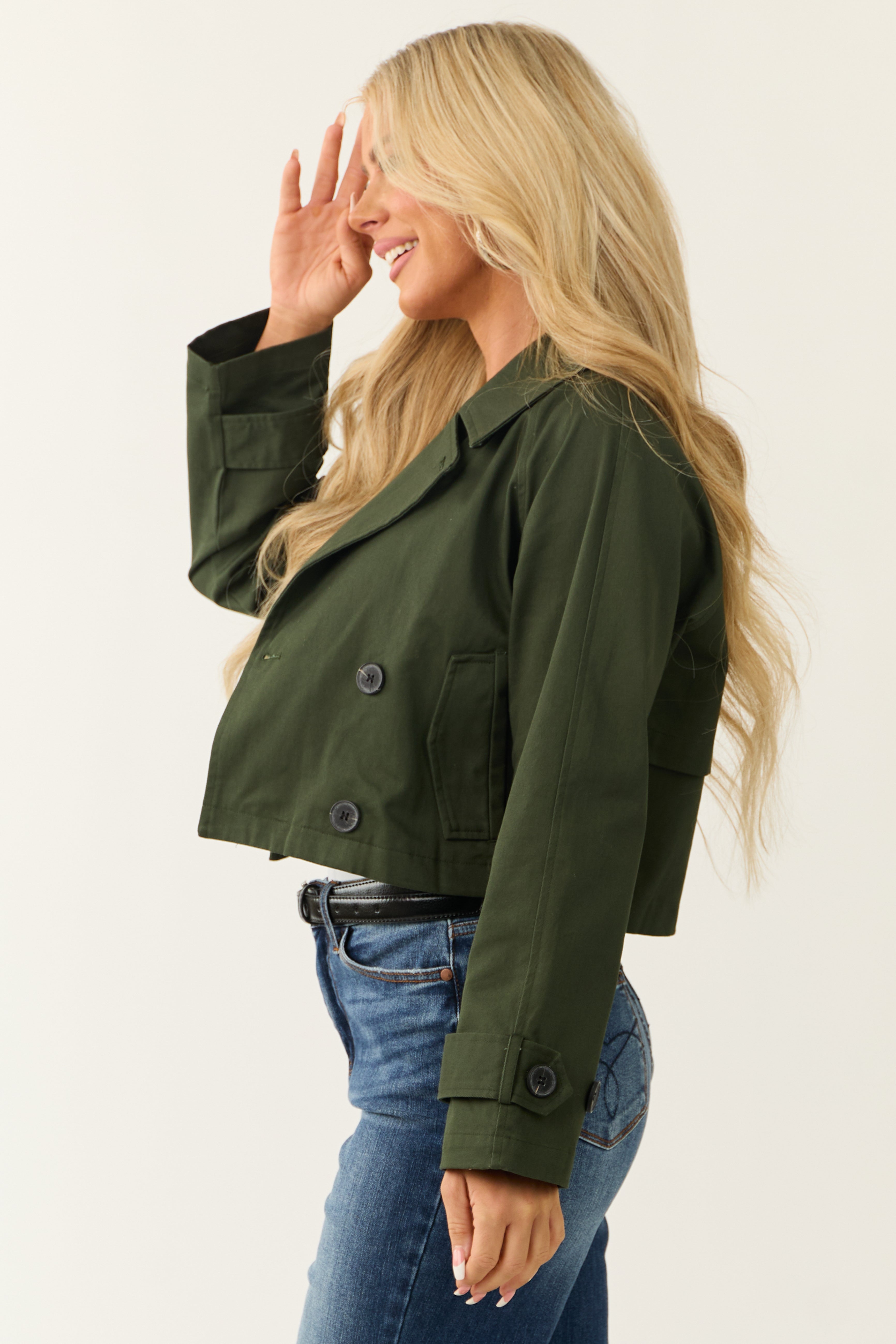 Stay stylish and warm with our Green Buttoned Crop Long Sleeve Trench Jacket. Featuring a collared neckline, double button down closure, and side pockets, this jacket is perfect for daytime or work outfits. Crafted from 100% Polyester, this non-stretchy woven jacket offers a flattering silhouette. With button straps on the cuffs and an unlined design, it adds a trendy twist to your fall and winter wardrobe. Care instructions: Hand wash cold, wash colors separately, hang to dry. Model is wearing a size Small. Non-returnable item.