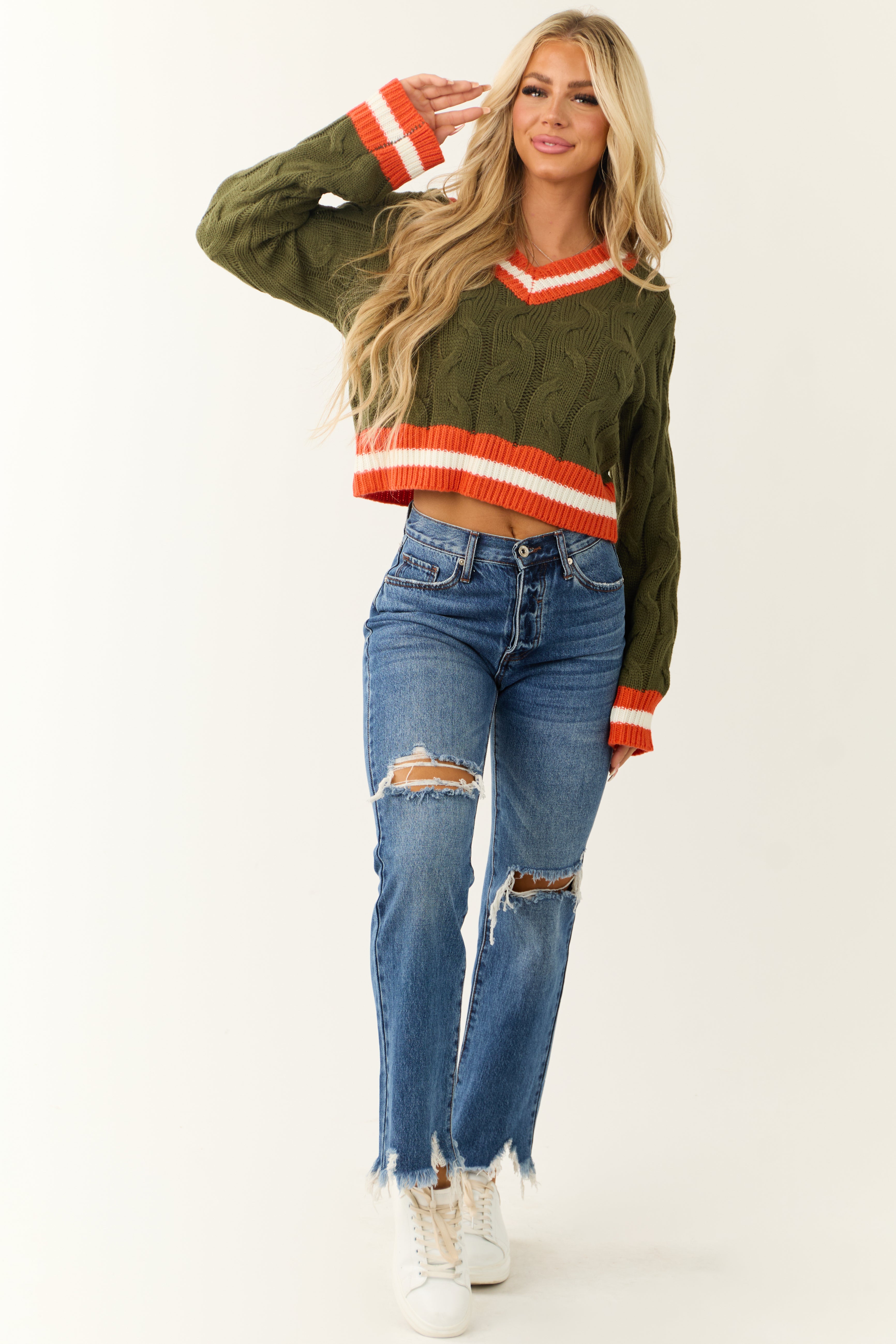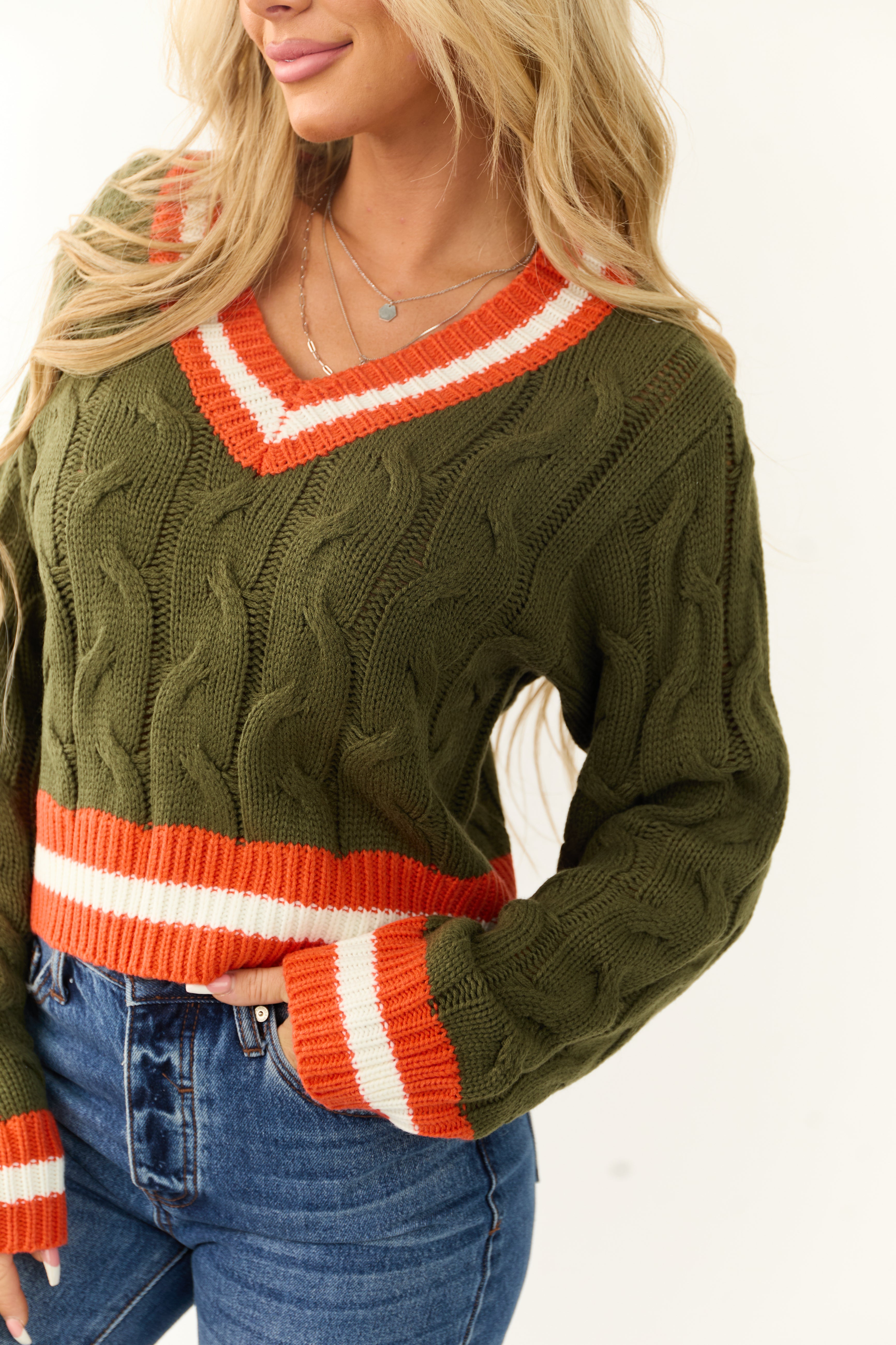 Stay stylish and cozy in this Green Cable Knit Sweater with Stripe Trim! Made of 100% Acrylic, this sweater features a stretchy cable knit construction, V neckline, and long sleeves. The striped trim in Ivory and Fire adds a chic touch. Ideal for various occasions, this mid-length sweater offers comfort and style. Available in sizes S, M, L. Perfect for fall, pair it with your favorite jeans for a trendy look. Dry clean only.