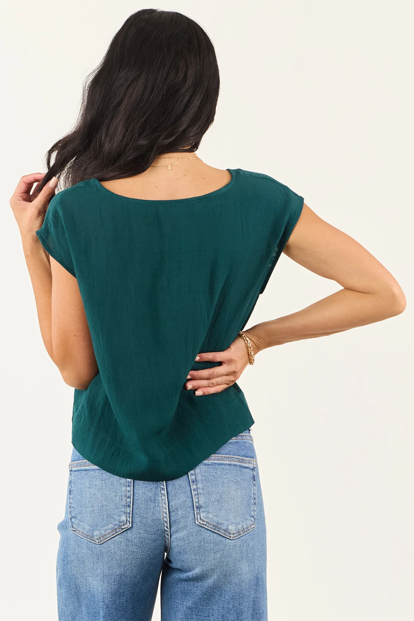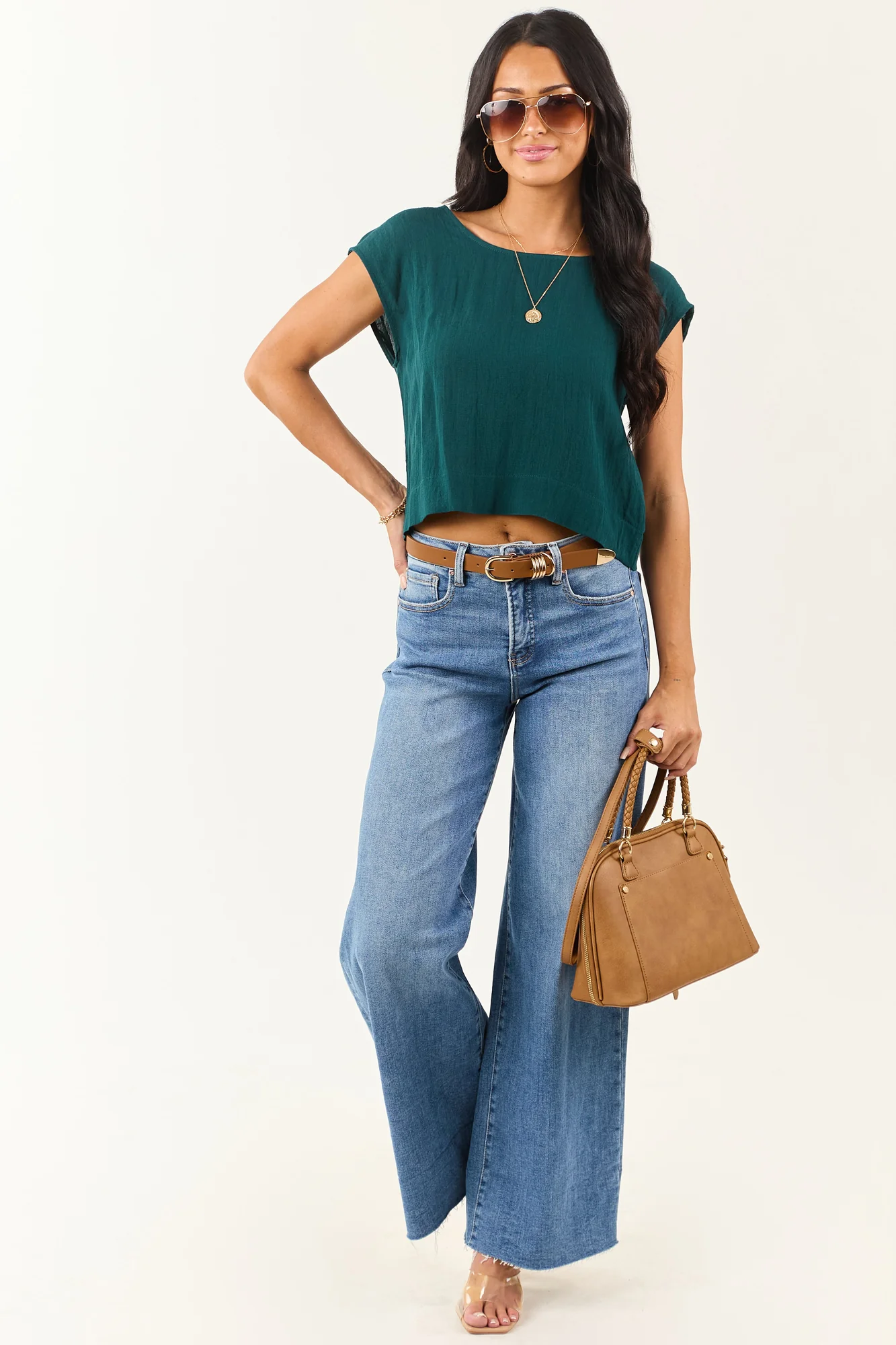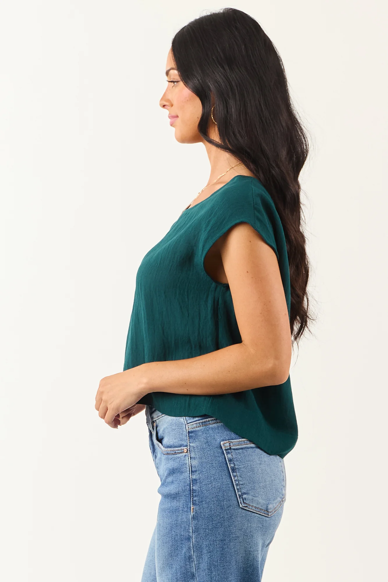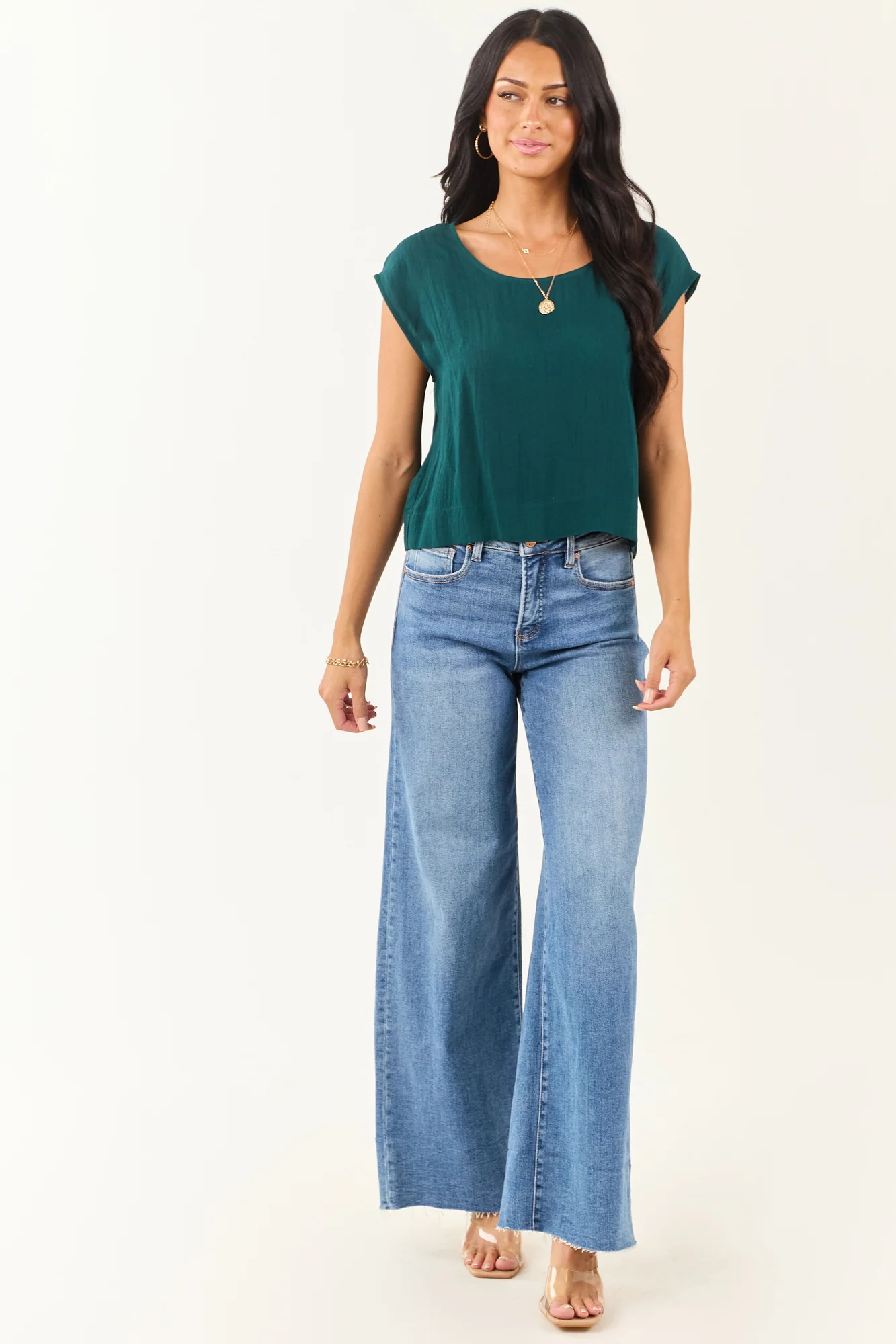 This pine green cap sleeve top features a boxy fit for a relaxed and versatile look. Made in the USA with 95% Rayon and 5% Nylon, this top is slightly sheer, semi-cropped, and suitable for various occasions. Stay fashion-forward with this oversized piece that complements any outfit effortlessly. Available in sizes S, M, and L. Model is wearing a size Small. Models measurements: Size 1, Height 59″, Bust 34″, Waist 26″.