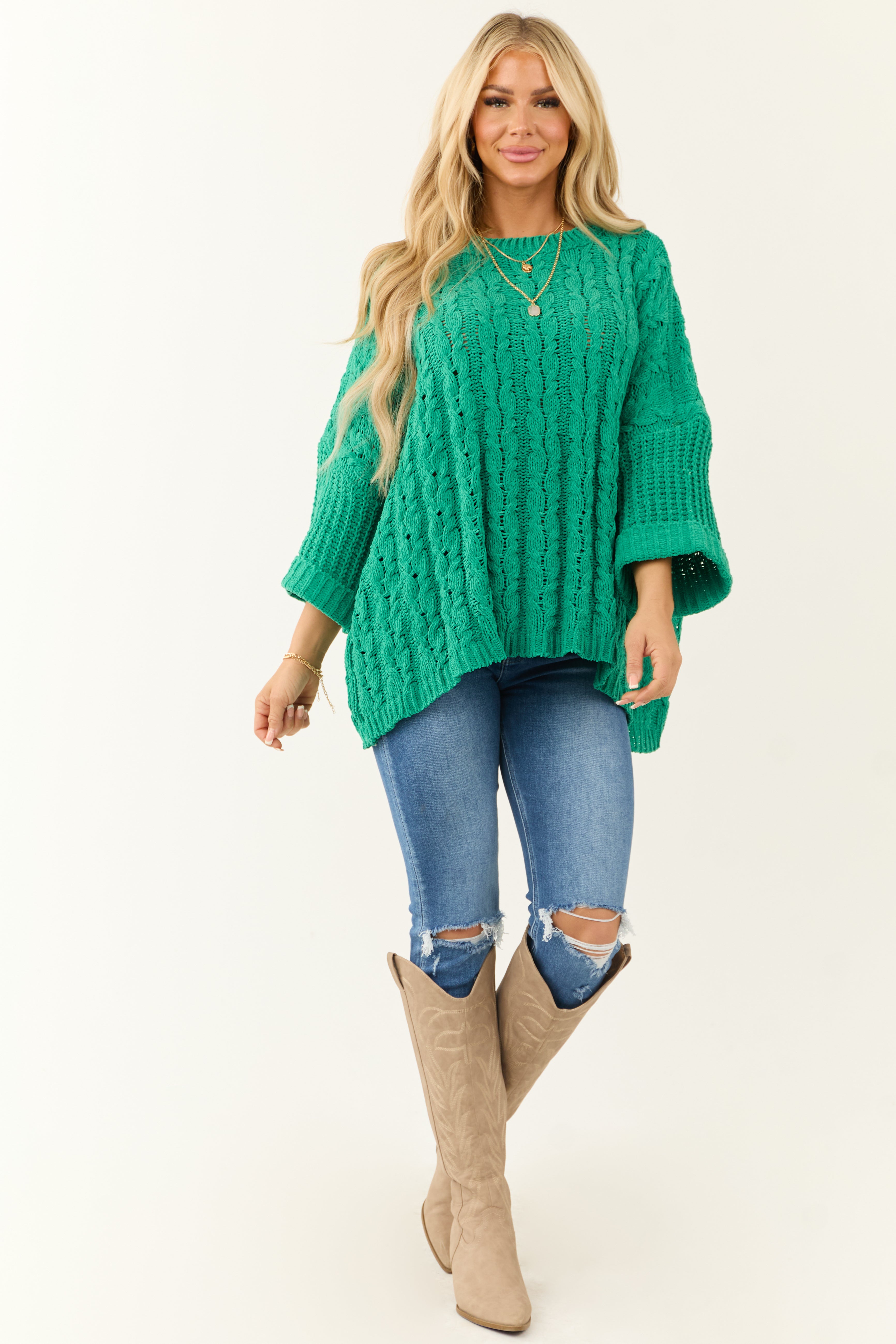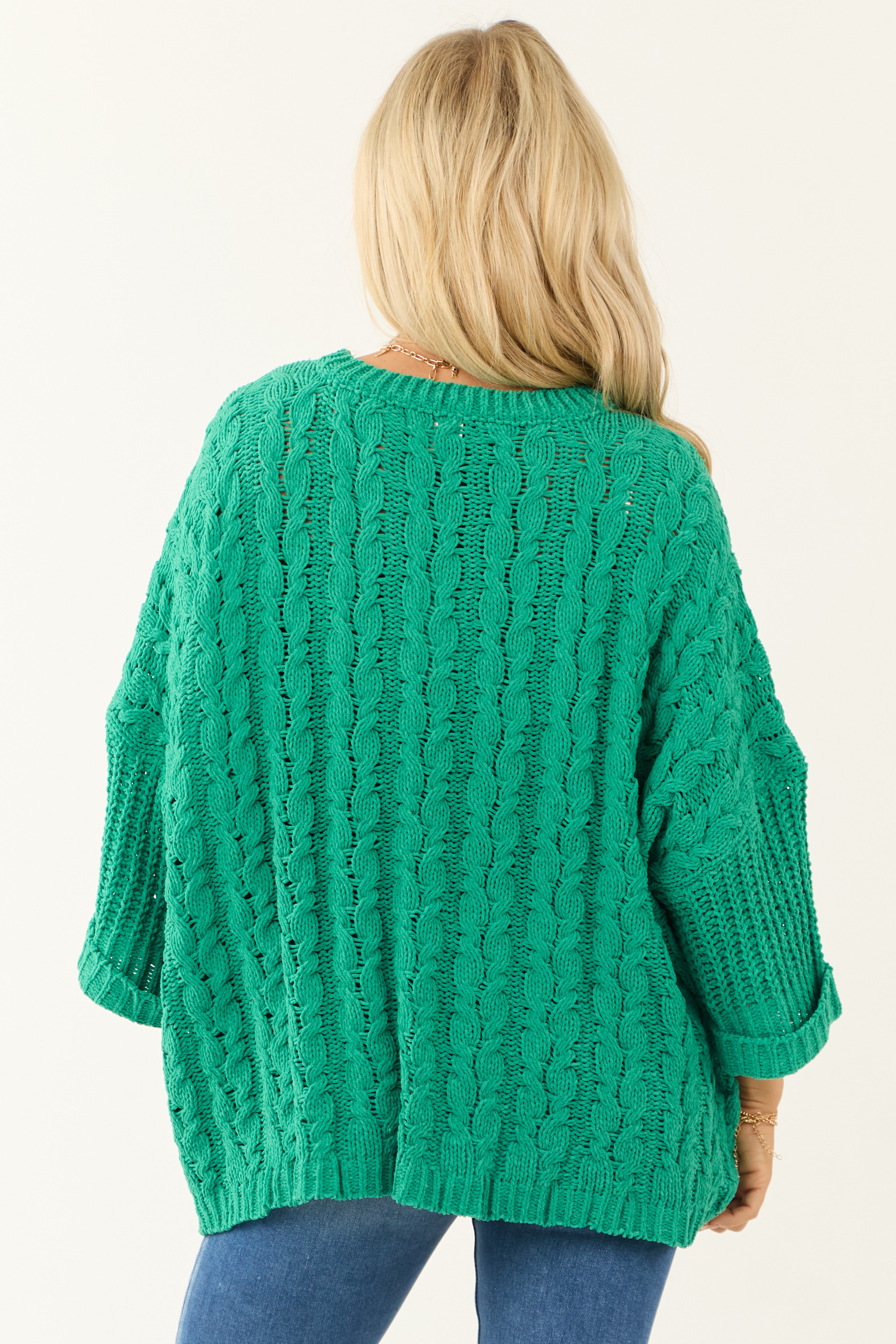 Indulge in the luxurious comfort of our Green Chenille Cable Knit Sweater. Crafted from stretchy chenille, this oversized sweater features ribbed trim, drop shoulders, and 3/4 length wide sleeves. The handkerchief hemline and rolled cuffs add a stylish touch, perfect for casual outings. With an unlined design and crew neckline, this sweater offers both warmth and fashion. Available in sizes S, M, and L.