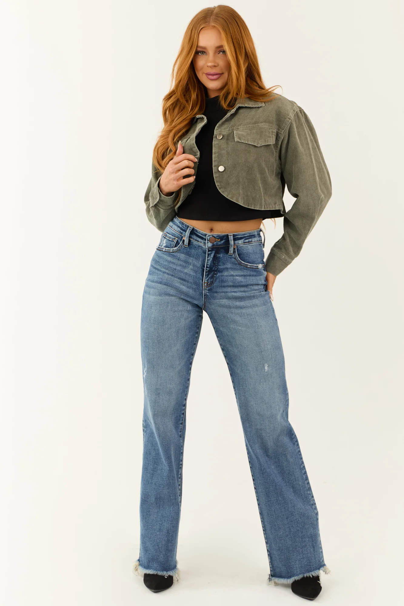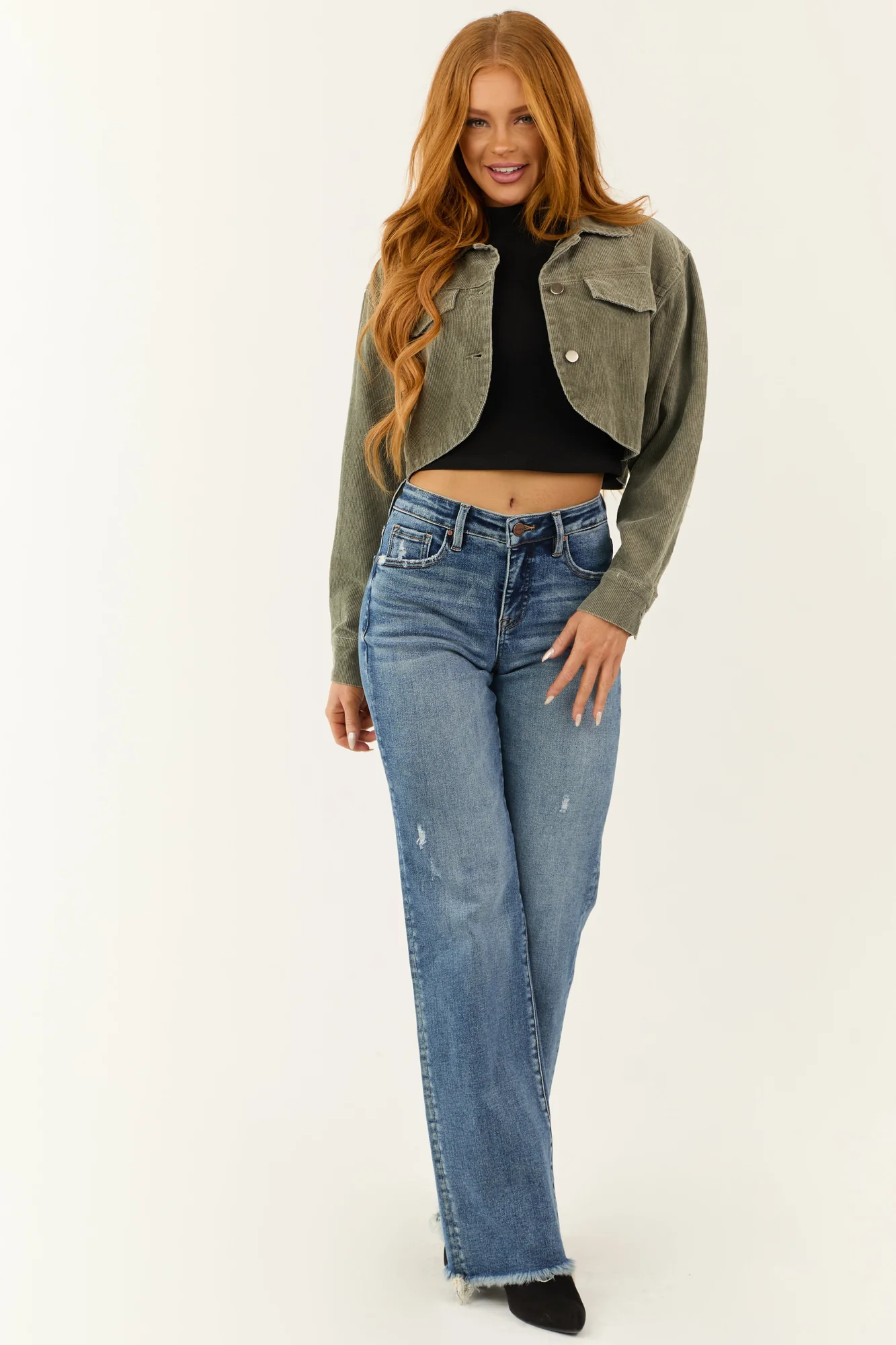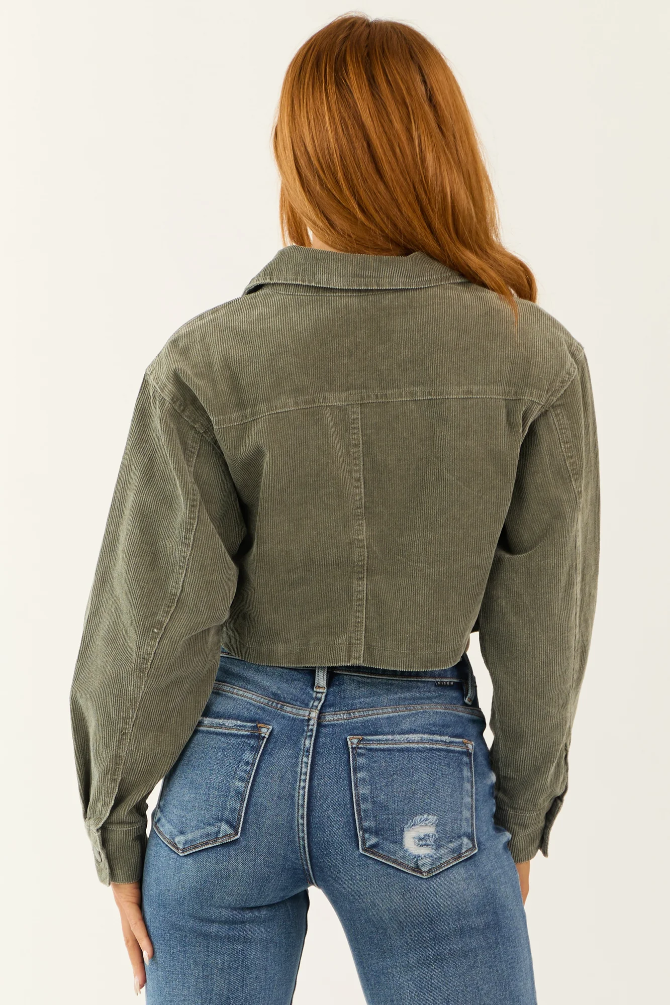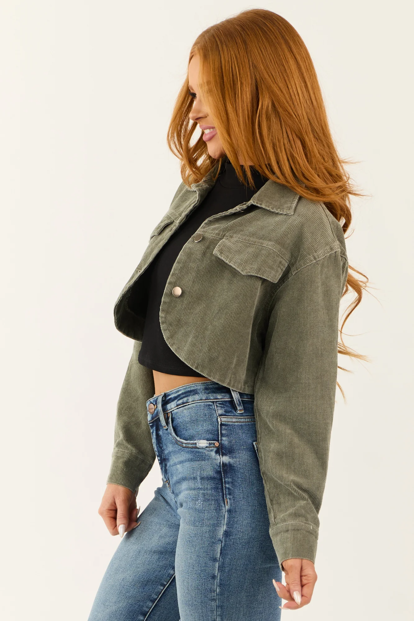 Stay fashionable and cozy with our Green Corduroy Button Down Cropped Jacket. Made from a non-stretchy woven fabric with a mineral wash finish, this jacket features long sleeves with banded button cuffs, non-functional chest pockets, a spread collar, and a rounded hemline. Perfect for daytime outings, this jacket is unlined and crafted from 75% Cotton and 25% Viscose. Hand wash cold separately to preserve the vibrant color. Model is wearing a size Small. Model’s Profile: Size 1, Height 55″, Bust 33″, Waist 24″.