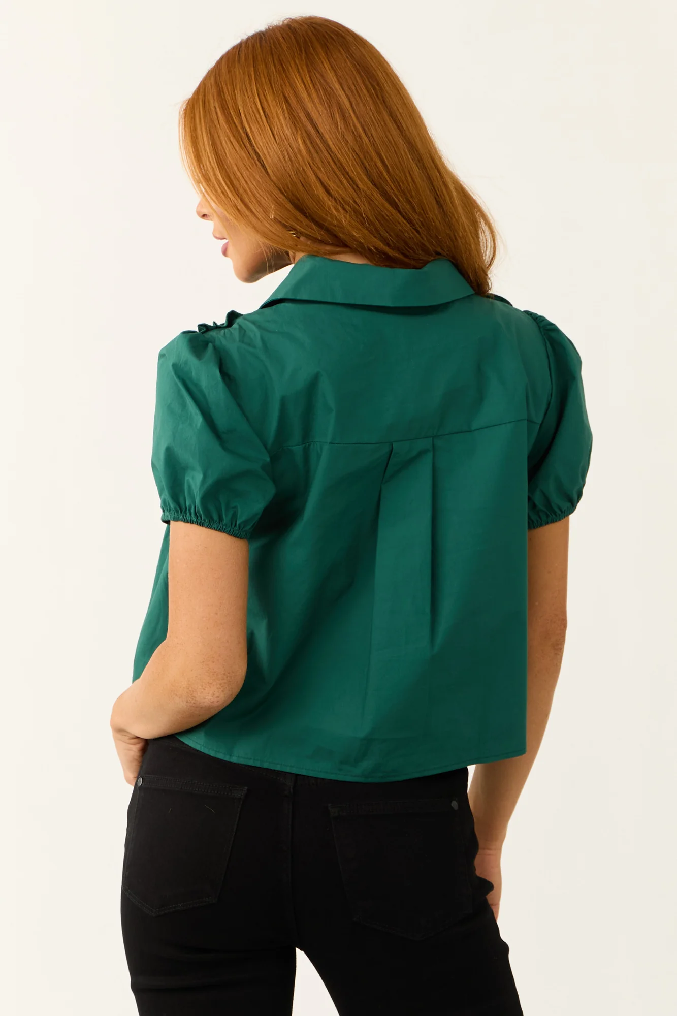 Indulge in the charming allure of nature with our Forest Green Ruffle Short Sleeve Top. Crafted from 100% cotton in a babydoll style, this top features non-stretchy woven fabric, elegant short puff sleeves, a collared V neckline, and an unlined design for a chic and refreshing look. With a length ranging from 21 inches to 22 inches and available in sizes S, M, and L, this charming piece ensures a comfortable and stylish fit. Hand wash cold and hang dry to maintain its quality. Ideal for daytime outings or date nights. Elevate your wardrobe with this enchanting top today!