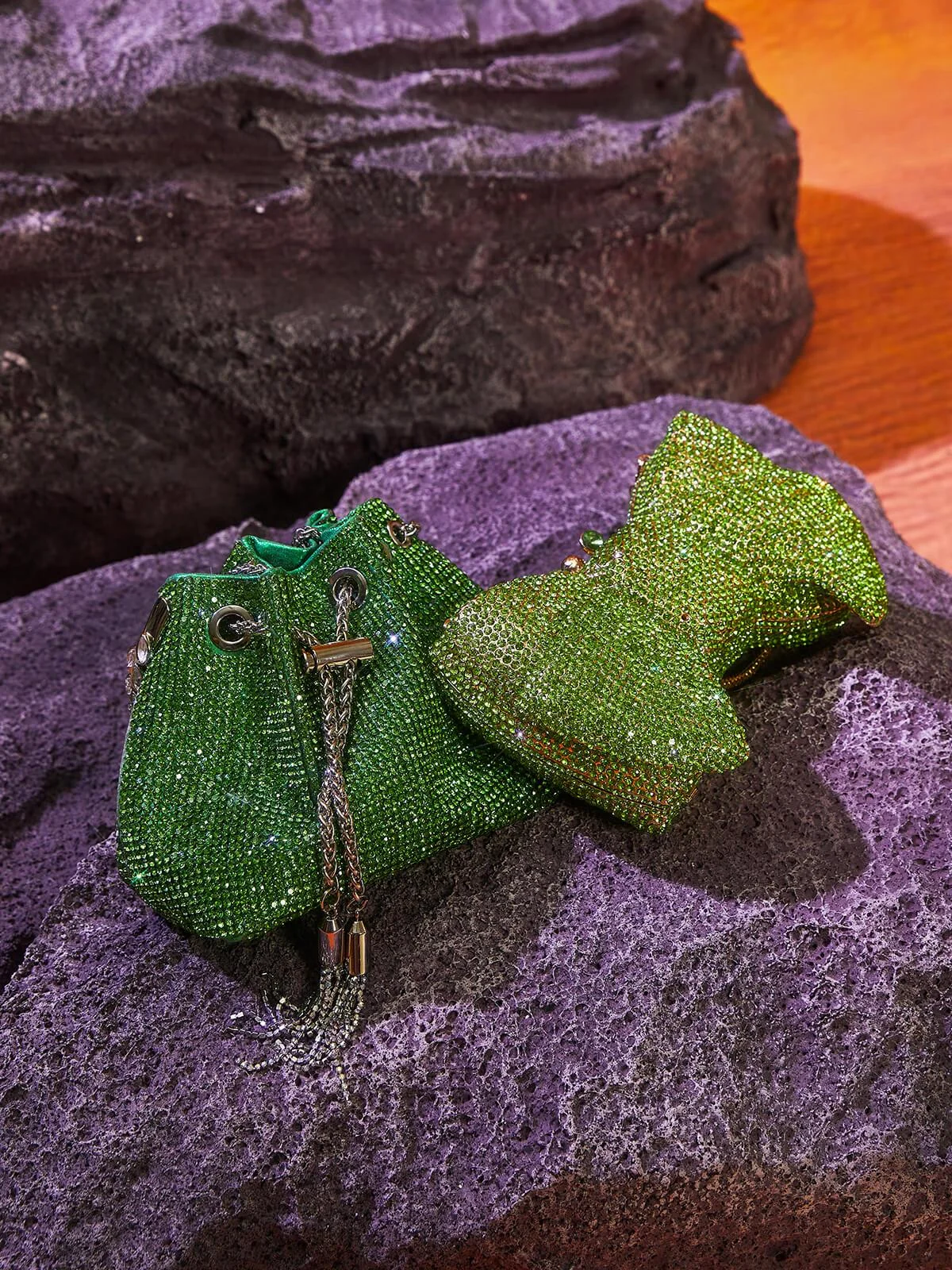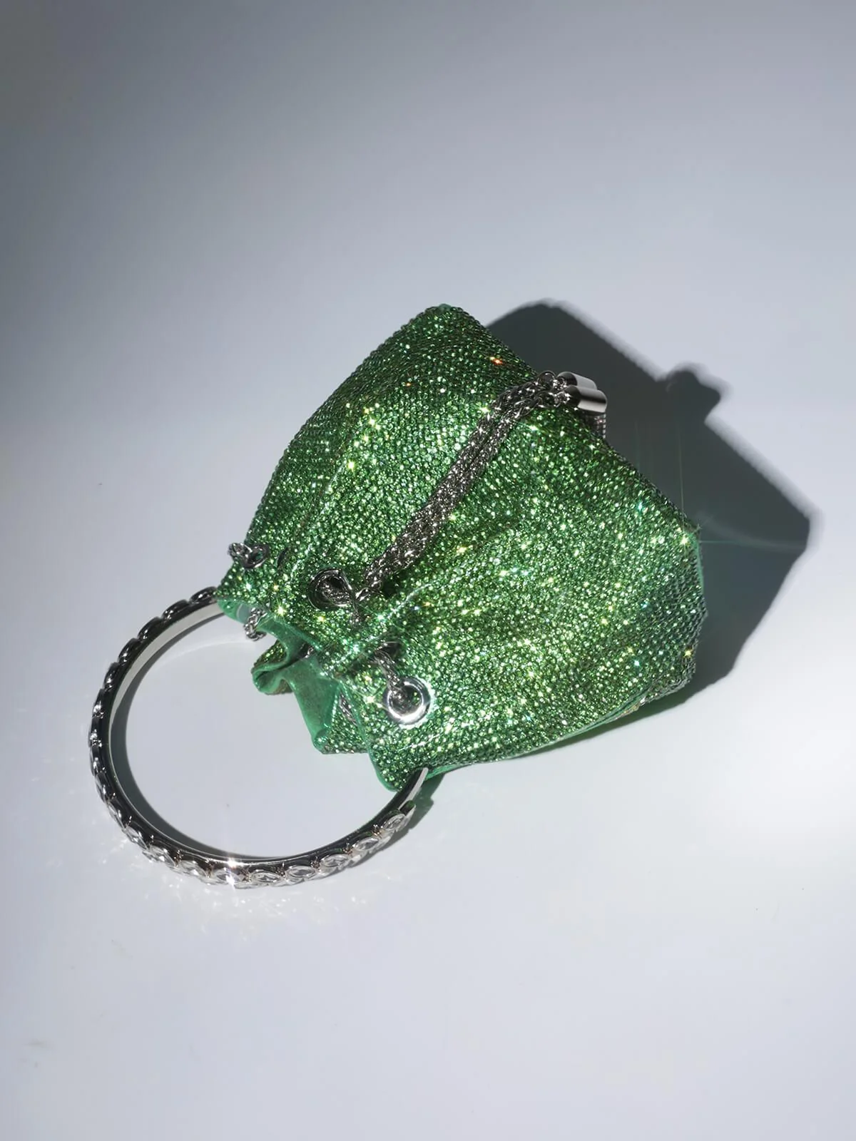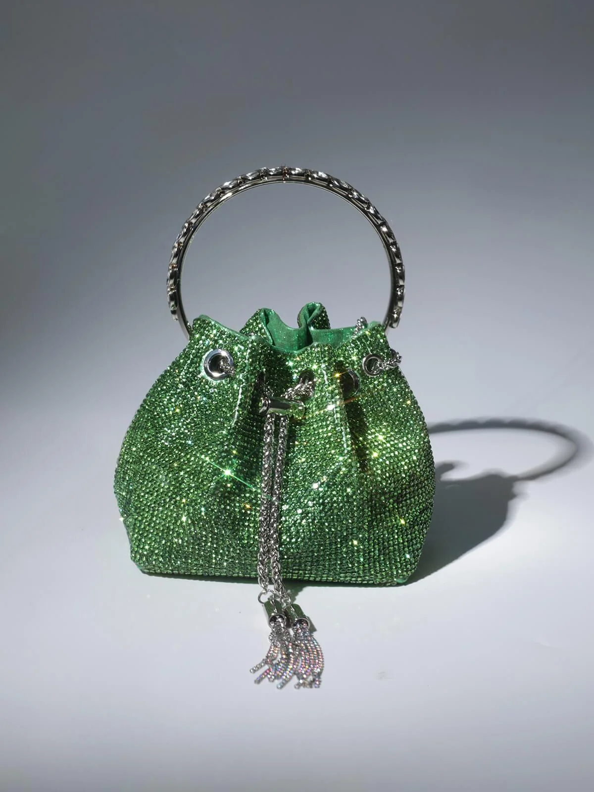 Elevate your look with our sought-after green Crystal Embellished Bucket Bag. Indulge in the sparkling crystal top handle and sleek drawstring chain that define its charm. Handcrafted from PU material, this bag exudes elegance and style. The supple shape offers ample space for essentials, making it perfect for any occasion. Add a touch of glam to your outfit with this stunning accessory that is sure to turn heads. Dimensions approximately 5.9 inches (15cm) in diameter.