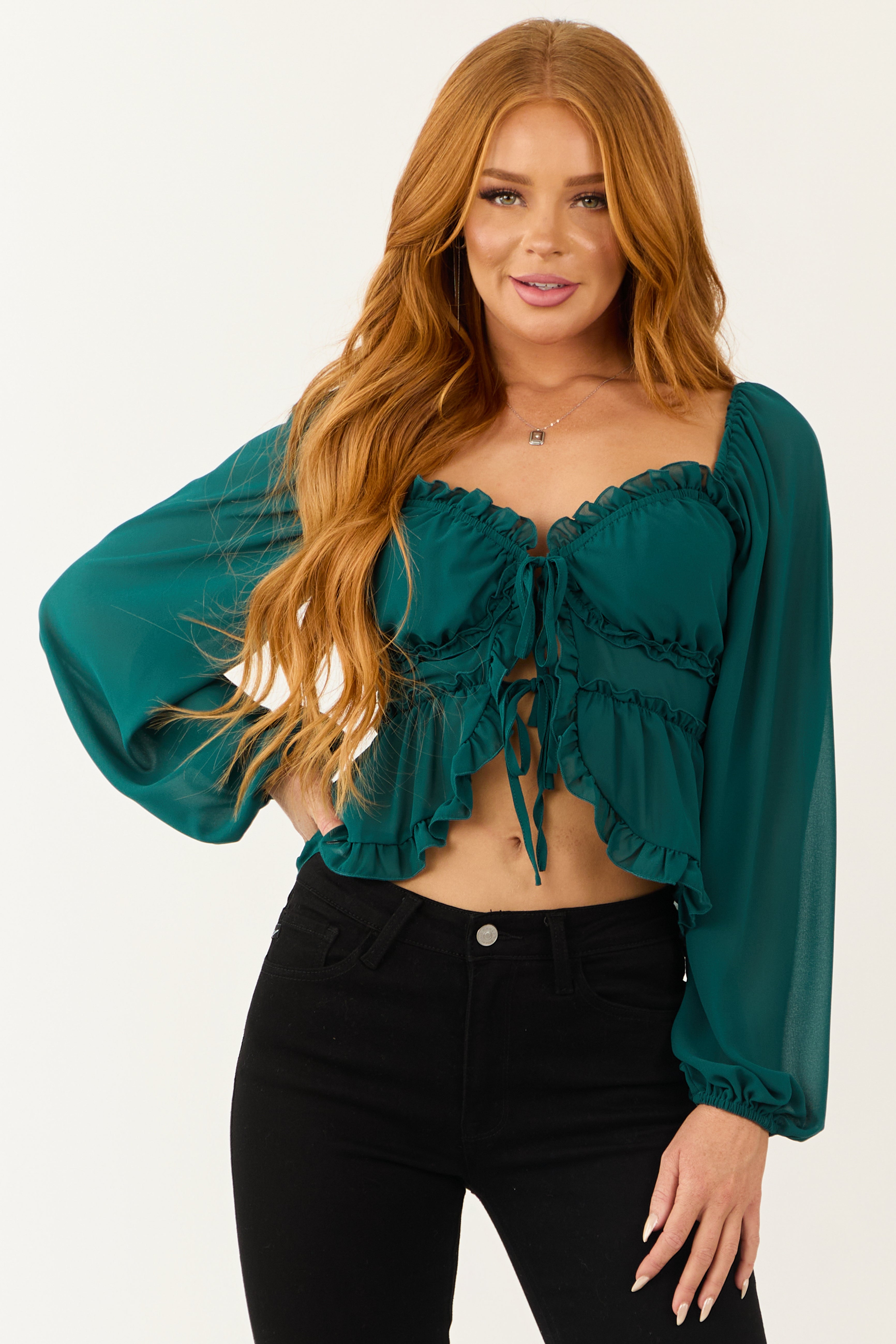 Elevate your style with our Green Frill Trim Sweetheart Neckline Blouse! Made from non-stretchy woven fabric featuring elegant frill details. This cropped blouse boasts an open front with 2 adjustable ties, long sheer bubble sleeves with elastic cuffs, and a charming sweetheart neckline. The curved hemline adds a flattering touch. Crafted from 100% Polyester with a 96% Polyester, 4% Spandex lining, this blouse exudes sophistication. Hand wash cold, separately colored; no bleach. Lay flat to dry, low iron when needed. Available in XS, S, M, and L sizes.