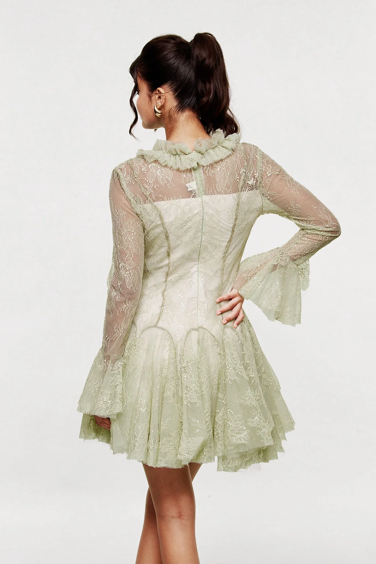 Elevate your wardrobe with the Green Lace Embroidered Ruffle Mini Dress. Expertly crafted with delicate lace embroidery and playful ruffle details, this dress combines elegance with a fresh, vibrant hue. The mini length offers a modern silhouette perfect for both daytime events and evening occasions, ensuring you stand out with refined style and confidence. This non-stretch dress can be gently machine washed. Note: Color may vary due to lighting on images.