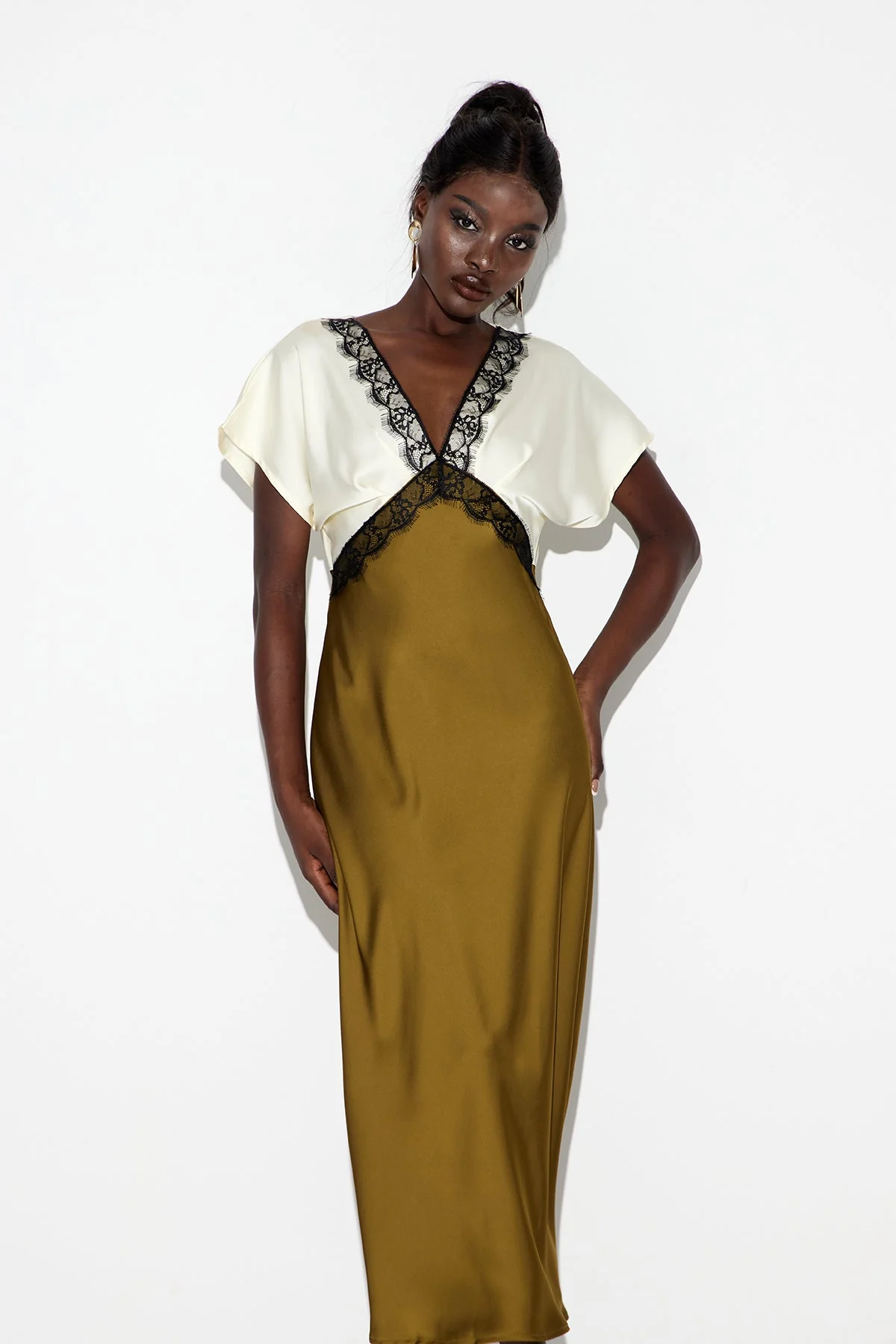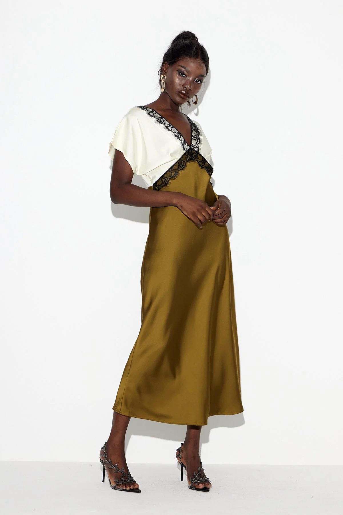The Green Lace V Neck Maxi Dress exudes timeless elegance and comfort. Crafted with delicate lace and a flattering V-neckline, this maxi dress offers sophistication and ease. Its flowy silhouette allows for graceful movement, perfect for formal events or daytime affairs. Tailored to perfection, this dress blends classic charm with a contemporary flair. Enjoy the non-stretch fabric that is easy to maintain with a gentle machine wash. Please note, color may vary slightly due to lighting effects in images.