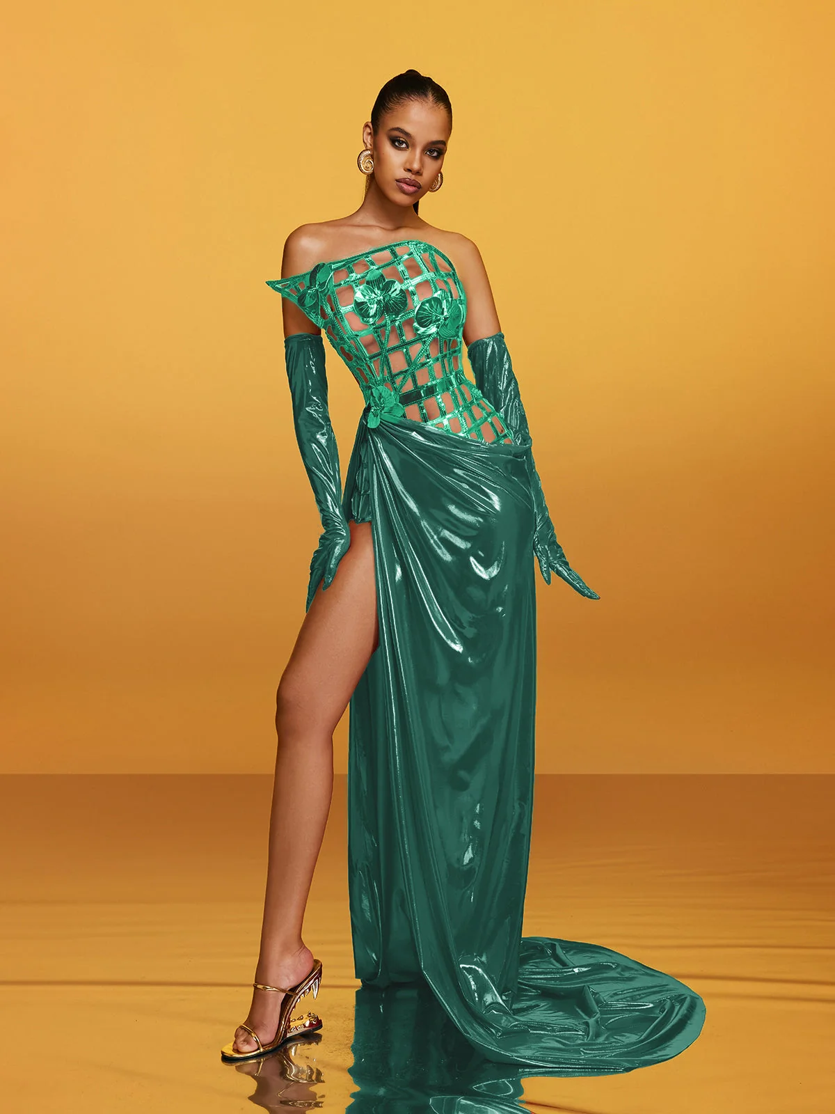 Green Metallic Flower Strapless Maxi Dress – Elegant Special Occasion Wear