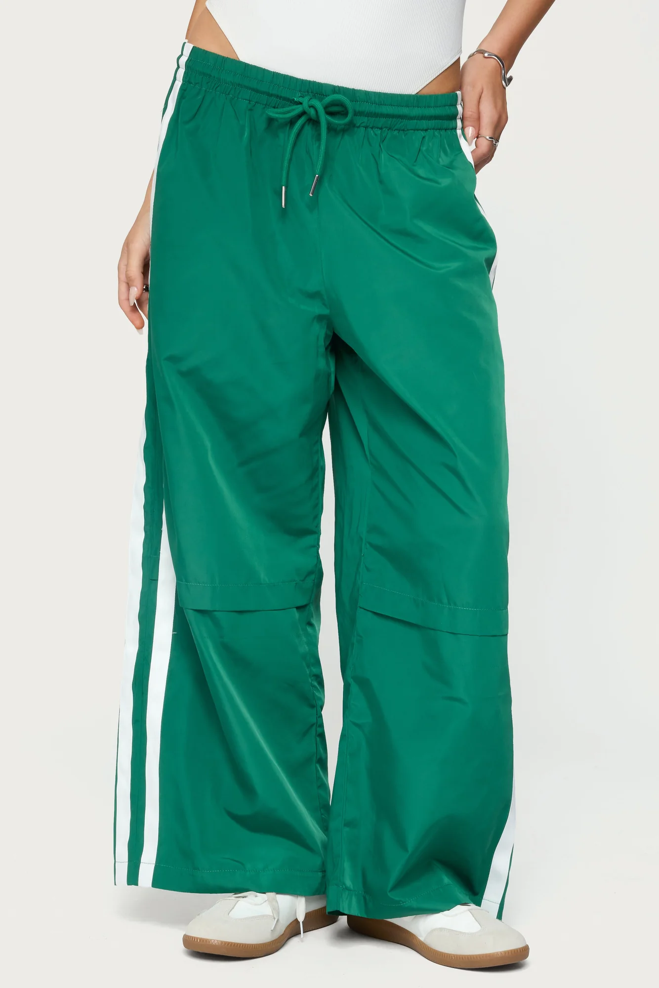 Upgrade your athleisure wardrobe with these trendy green nylon track pants featuring a side stripe detail and a drawstring waistband for a perfect fit. Made from high-quality nylon fabric with a touch of polyester, these pants offer both style and comfort. Ideal for everyday wear, stay fashionable effortlessly. This model wears size S and stands at 56 tall. Care instructions: Machine wash at maximum 30ºC, avoid bleach, tumble drying, iron at a maximum of 110ºC. Say goodbye to dry cleaning hassles. Discover the regular fit version by clicking the link provided.