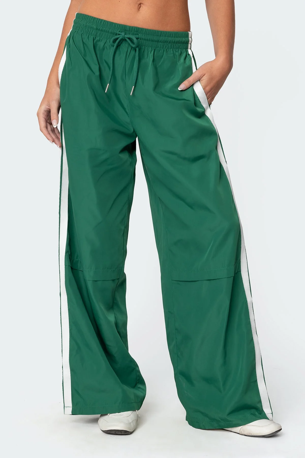Stay comfortable and stylish in these green nylon track pants featuring side stripe details. Crafted from nylon fabric with a drawstring waistband for a perfect fit. Ideal for everyday wear, these pants are versatile and easy to care for. Available in sizes XS to XL. Model wears size S and is 58 tall.