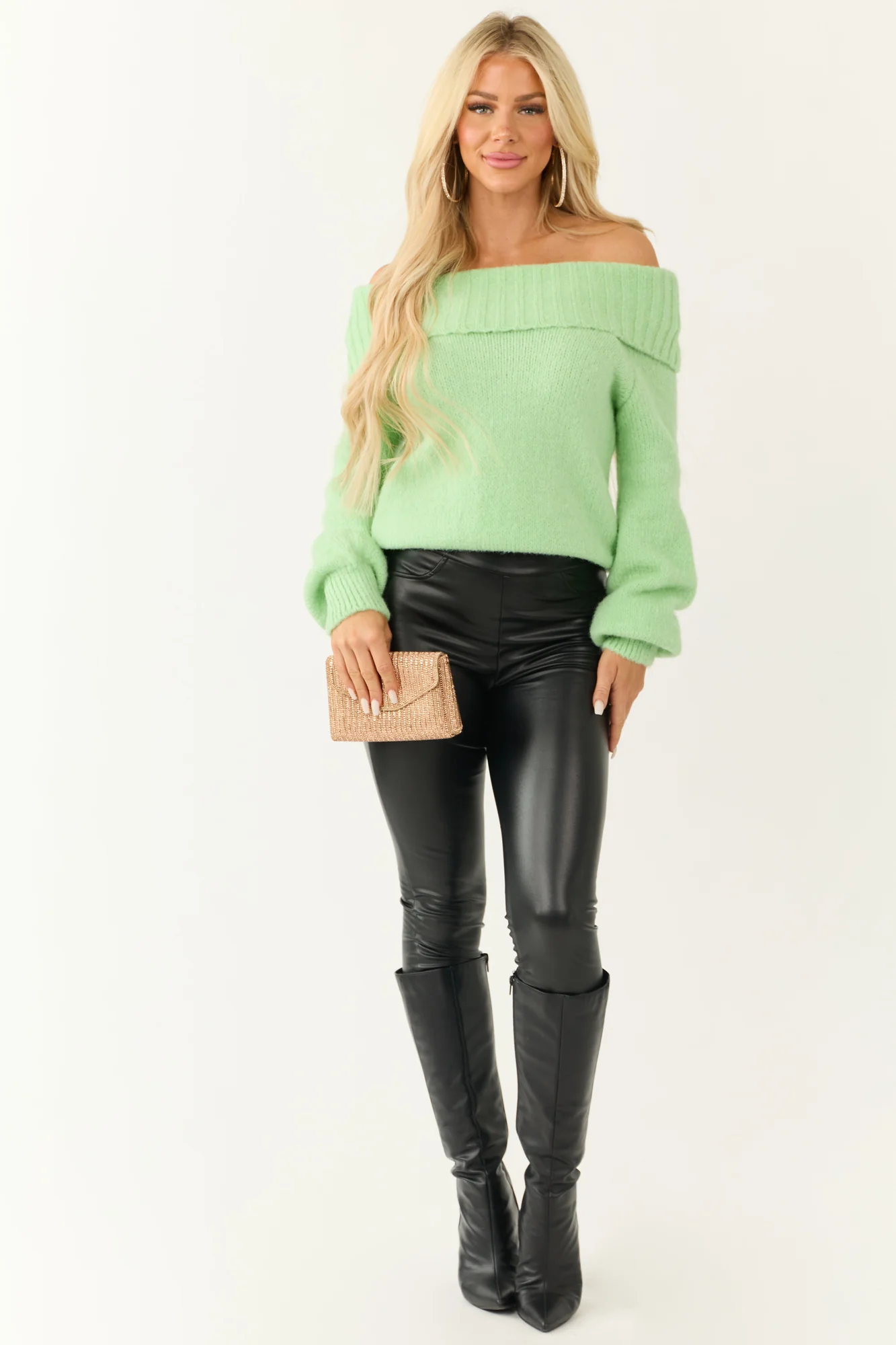 Elevate your style with our Green Off Shoulder Knit Sweater featuring stretchy rib knit fabric for a comfortable fit. The long raglan bubble sleeves and banded ribbed trim add a trendy touch. Care Instructions: Hand wash with cold water, flat dry. Model is wearing size Small.