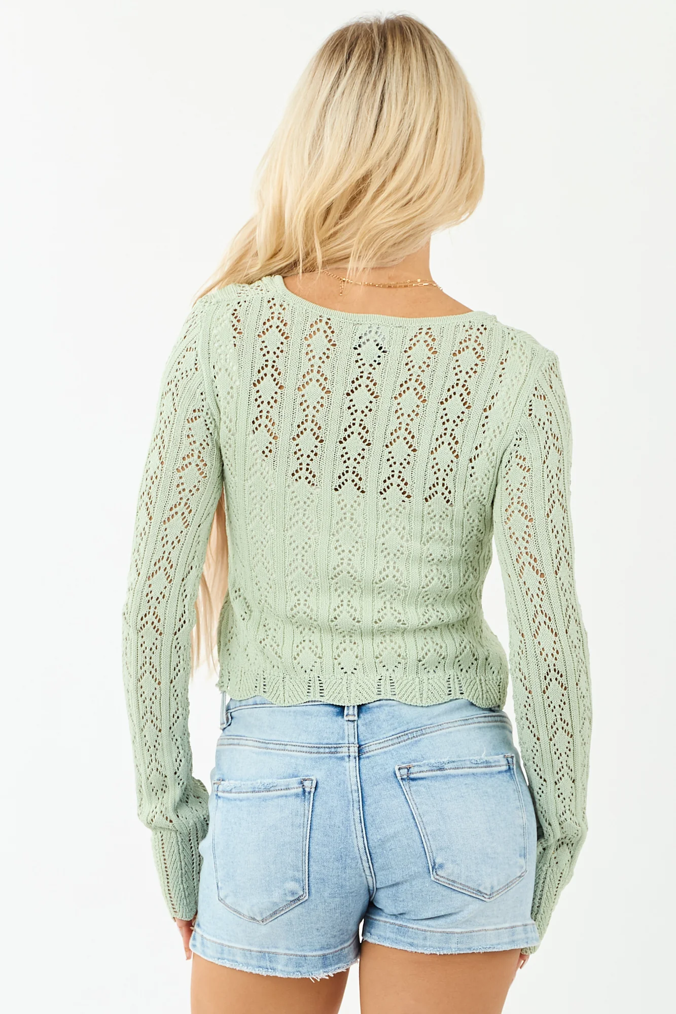 Experience ultimate comfort and style with this green Pointelle knit cardigan. Perfect for layering, lounging, or everyday wear, this cardigan features an adjustable front tie, scalloped trim, and is made of 63% Viscose Rayon and 37% Nylon. Embrace the soft hue and stretchy fabric that ensures a cozy fit. Available in sizes S, M, and L. Add this versatile piece to your wardrobe today!
