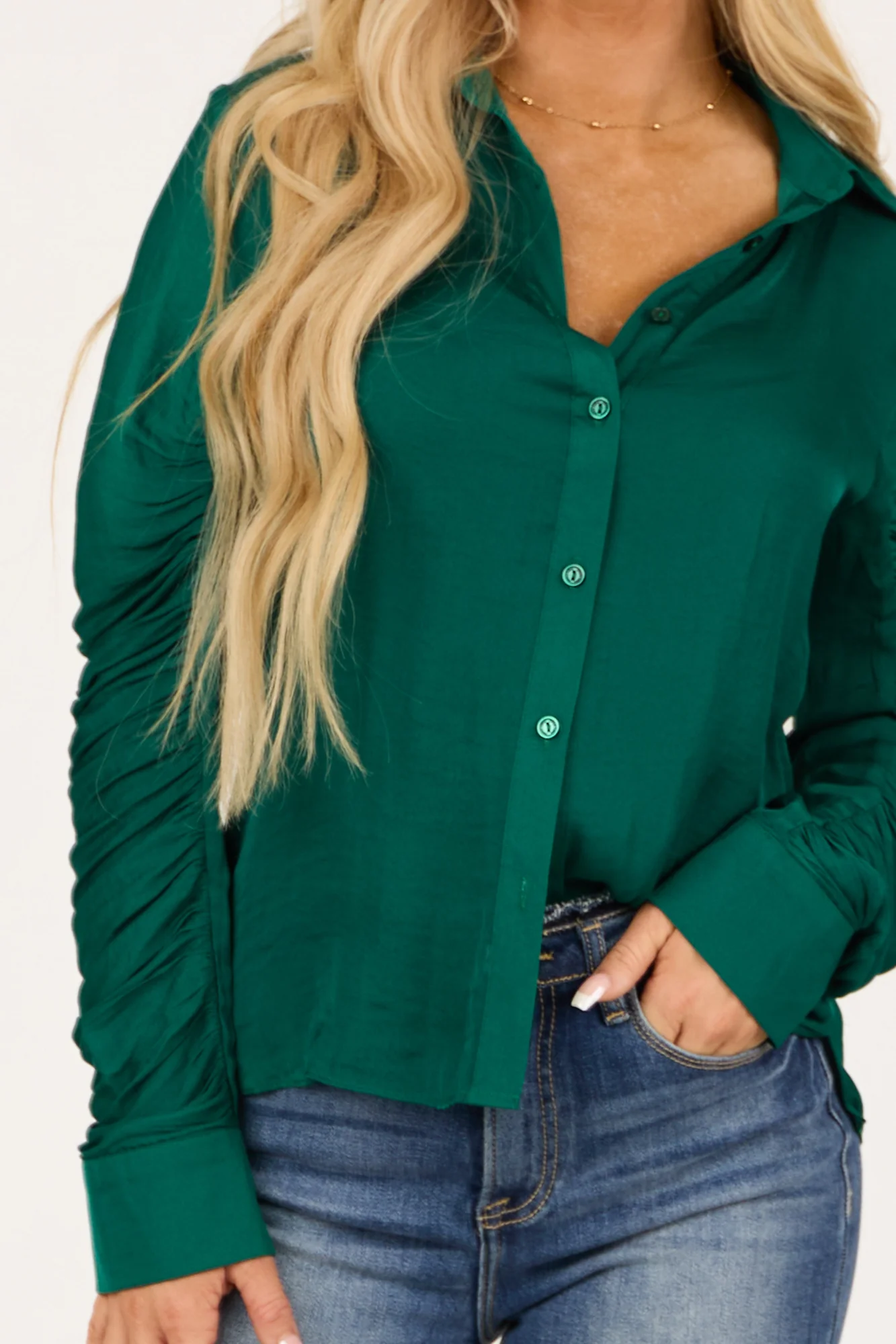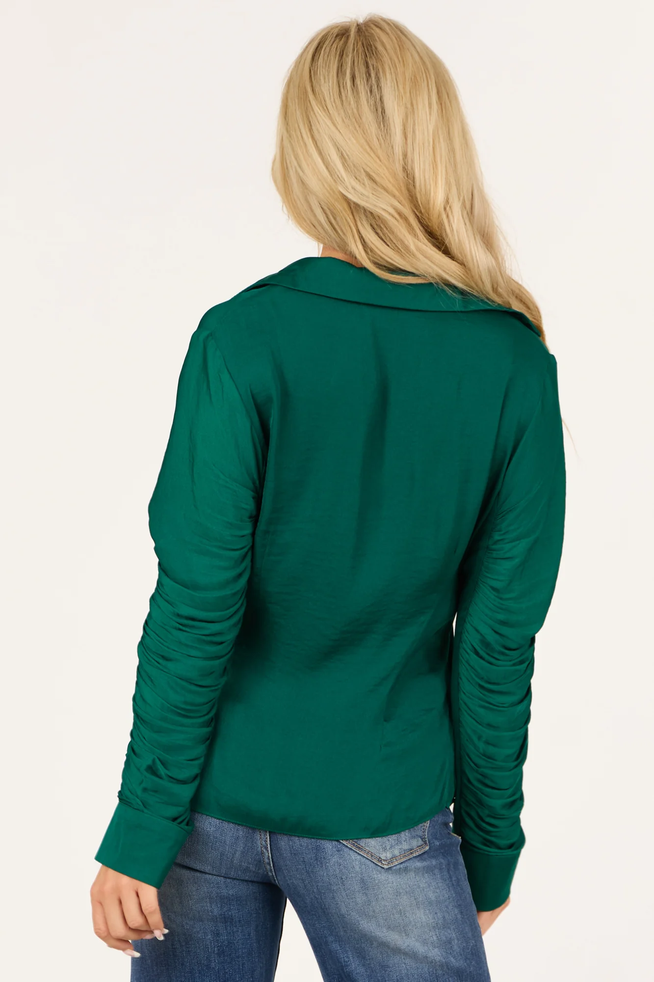 Elevate your wardrobe with our chic Green Ruched Button Down Top. Crafted from 100% Polyester, this non-stretchy woven top features ruched detailing, a collared neckline, and a flattering rounded hemline. The button-down front adds a touch of sophistication, while the long sleeves provide a versatile look suitable for any season. Whether you pair it with jeans for a casual outing or dress it up with slacks for the office, this top is a must-have staple. Care instructions: Hand wash cold, line dry, iron on low heat. Available in sizes S, M, and L.