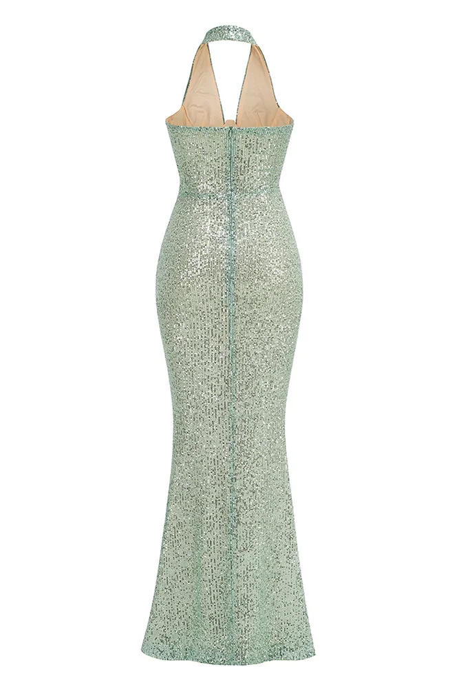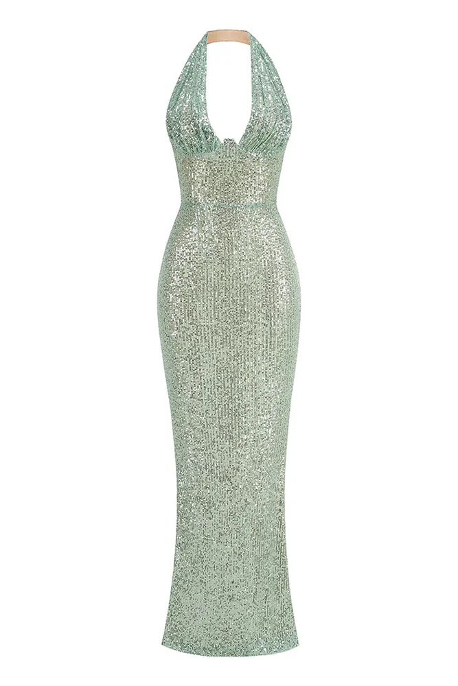 Elevate your style with our chic Green Sequin Embellished Halter Maxi Dress. This stunning dress features a halter neckline and sparkling sequin details that will make you shine at any event. The flowing maxi silhouette flatters all figures, boosting your confidence and beauty. Feel glamorous and stand out effortlessly with this must-have dress. Crafted from 100% polyester. Available in sizes S, M, and L. Perfect for special occasions. Make a fashion statement with this head-turning piece.