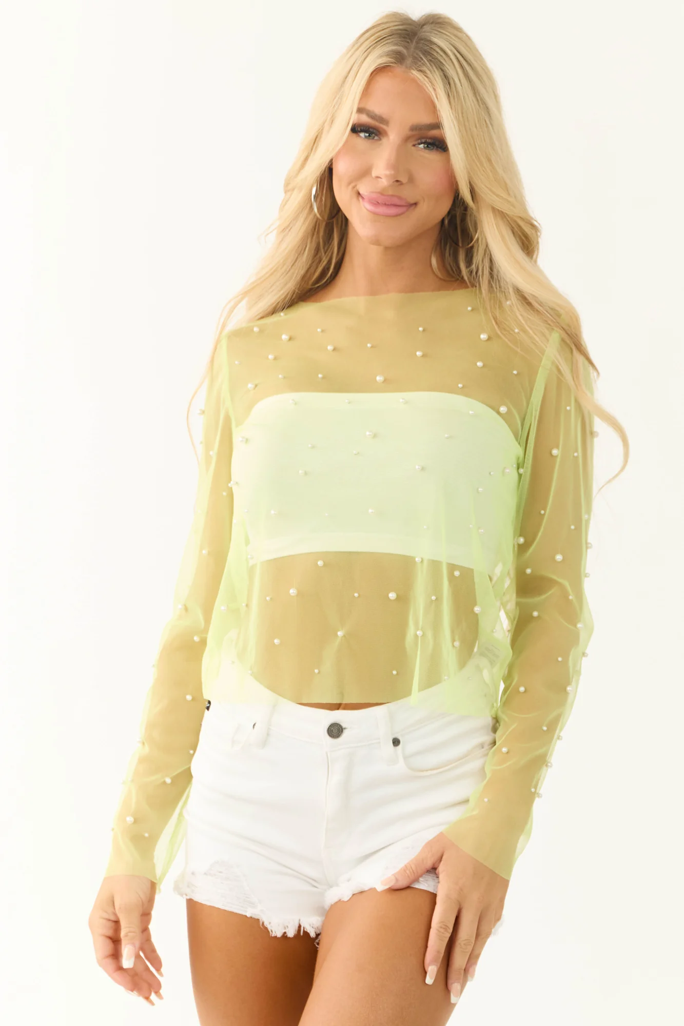 Elevate your wardrobe with our Green Sheer Mesh Pearl Detail Long Sleeve Top . This trendy top features stretchy mesh fabric, elegant pearl accents throughout, a rounded neckline, and a stylish design perfect for casual occasions. Stay comfortable in sizes S, M, L with sleeve lengths of 24″ to 25″ and bust sizes from 36″ to 38″. The length ranges from 22″ to 22.5″. This unlined top is made of 100% Polyester, ensuring both style and quality. Be fashion-forward like our model wearing a size Small. Heightening the look, pair it with our White Seamless Stretchy Bandeau Undergarment for a cohesive outfit. Imported. Care Instructions: Hand wash cold, do not bleach, line dry. Embrace this chic top that complements any style effortlessly.