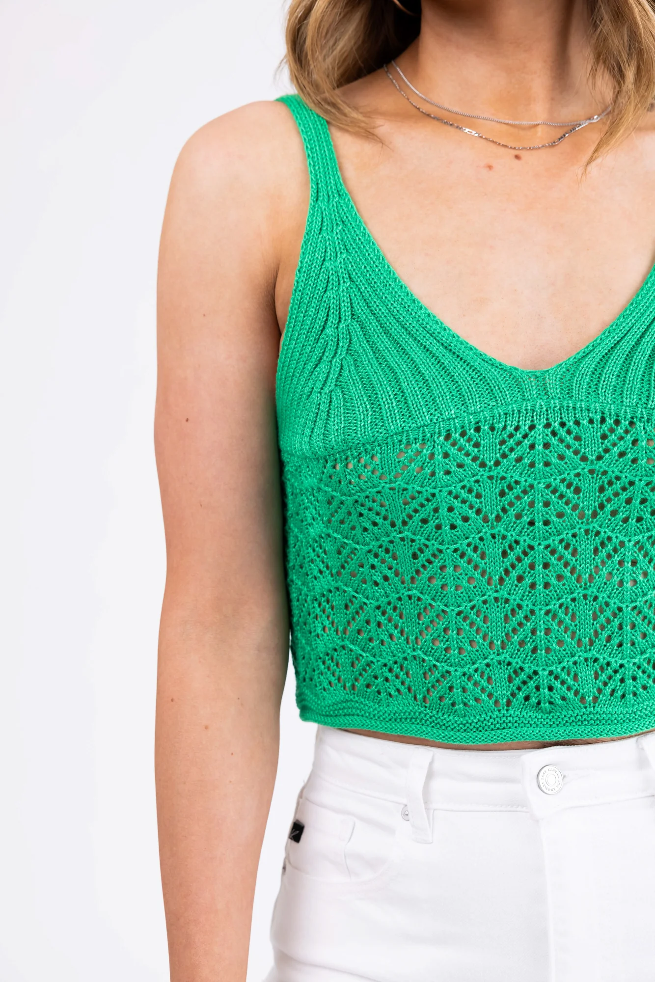 The Green Sleeveless V Neck Cut Out Knit Tank Top comes in sizes S, M, L, and XL. Made of stretchy knit with cut-out details, rolled hemline, and unlined design, this tank offers comfort and style. Imported and crafted from 100% Acrylic. Machine wash cold. Model wears size Small. Perfect for a chic and trendy look!