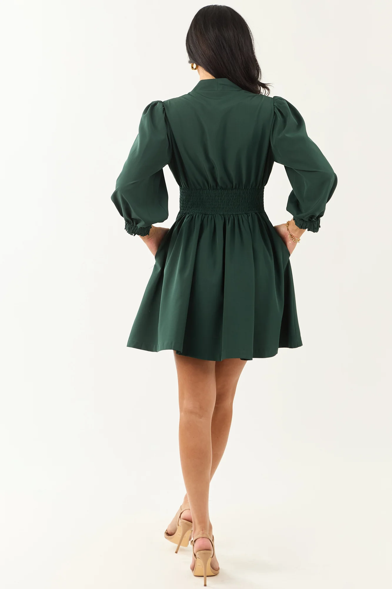 This forest green mini dress is a nature-inspired beauty with a zip-up front, flattering smocked waist, and 3/4 puff sleeves for a trendy look. Made of 85% Polyester and 15% Spandex, it features elastic cuffs, hidden side pockets, and is lined for comfort. Available in sizes XS to XL, fits true to size. Complete your wardrobe with this chic dress that offers a fashion-forward silhouette. Model Stats: Size 1, Height 59, Bust 34, Waist 26.