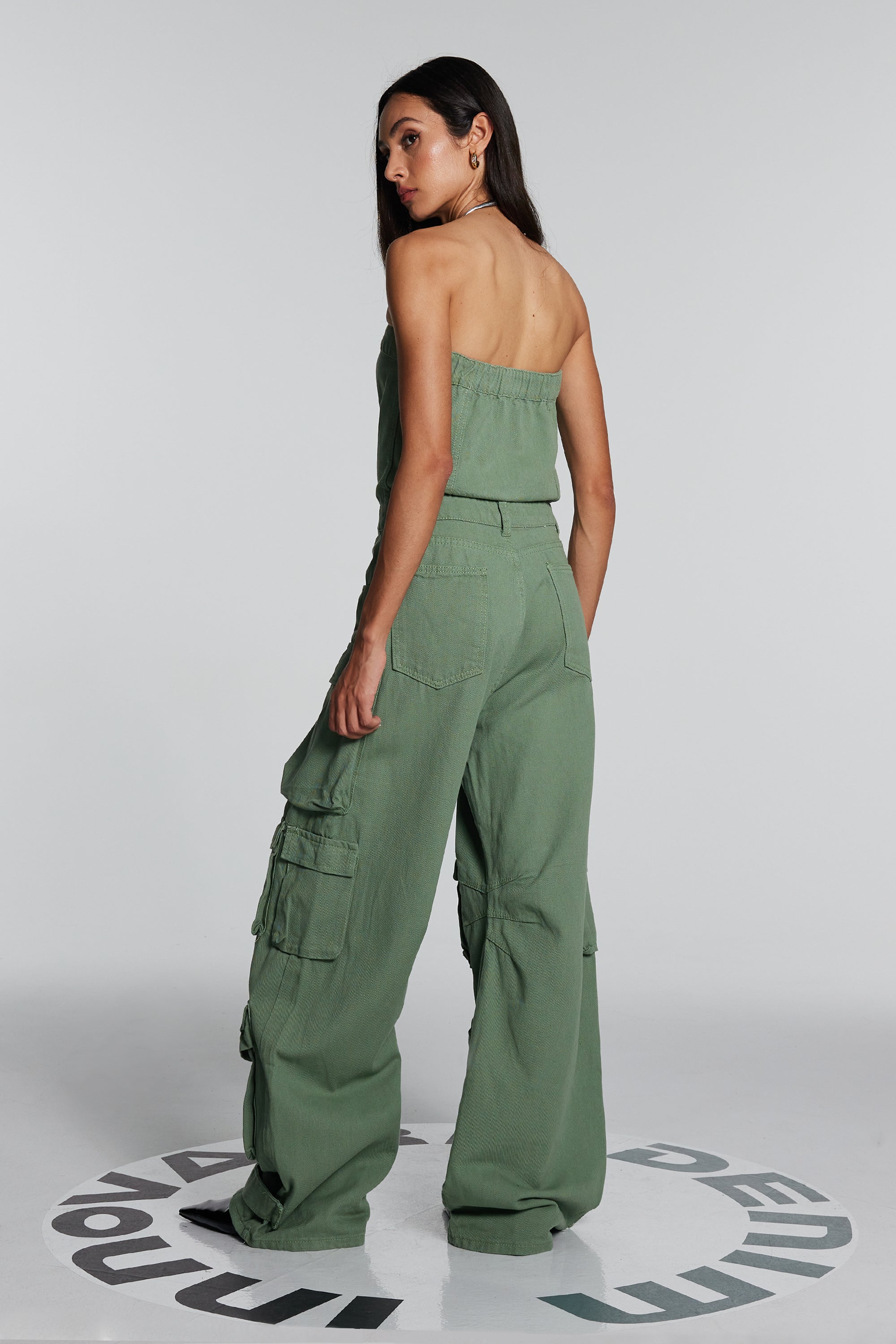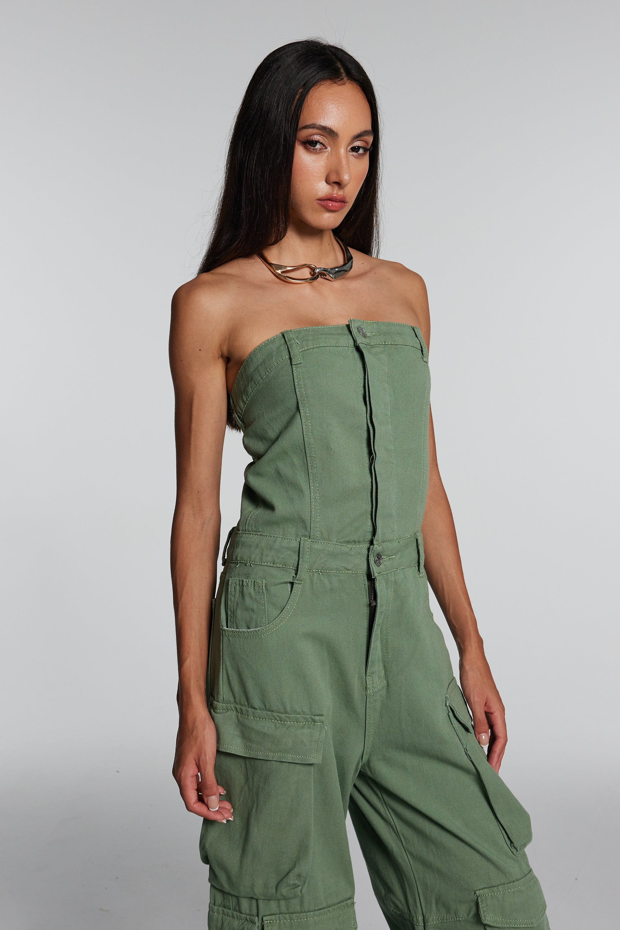 Elevate your style with the Green Strapless Cargo Jumpsuit with Cargo Pockets. Crafted from 100% Polyester for durability and comfort, this versatile jumpsuit blends fashion and utility seamlessly. The strapless design and practical cargo pockets make it perfect for any occasion. Whether youre exploring the city or attending a casual gathering, this jumpsuit is a chic choice for your wardrobe. This non-stretch jumpsuit is machine washable for easy care. Please note that the color may vary slightly due to lighting conditions in images.