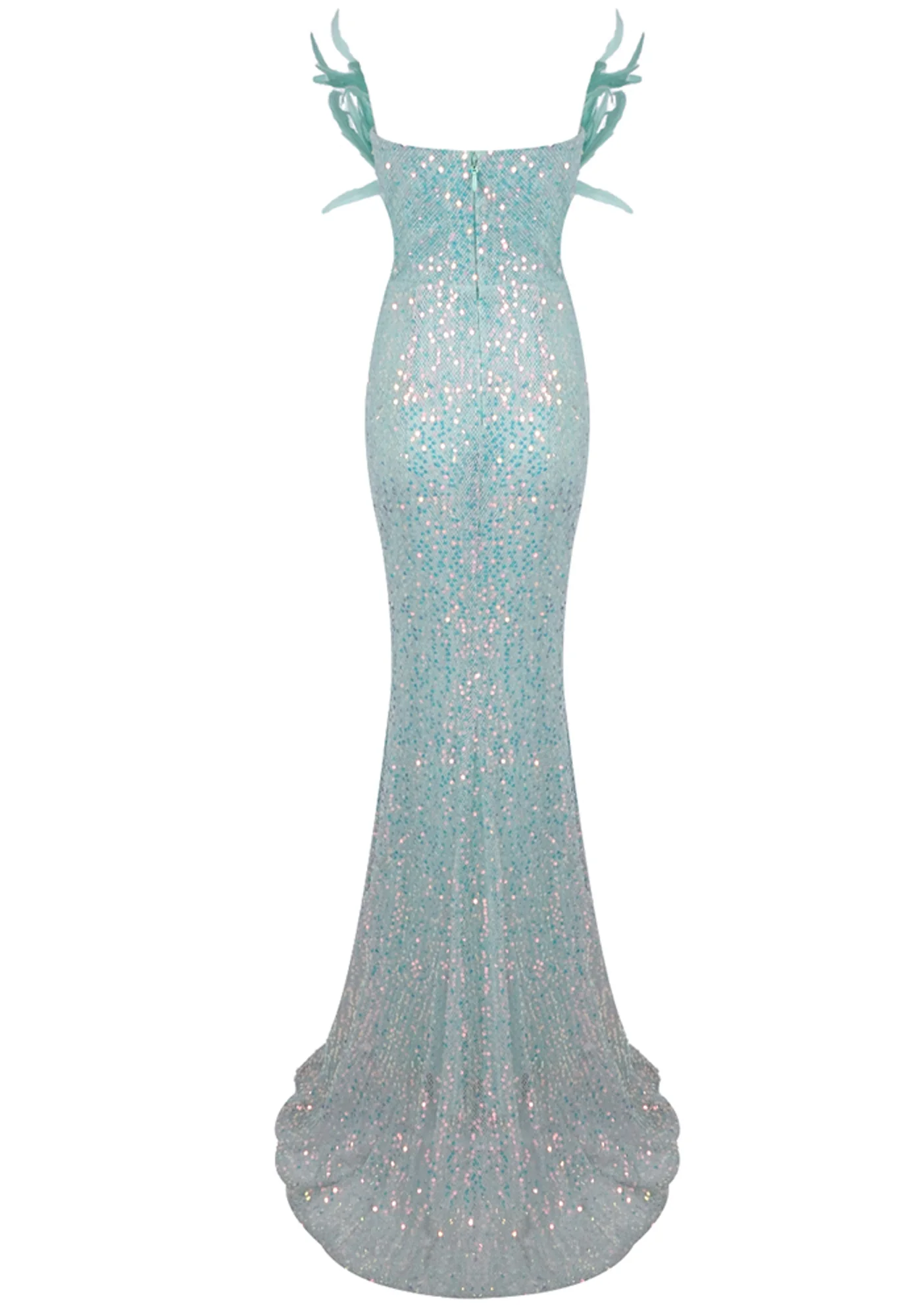 Experience elegance with our Green Strapless Maxi Dress featuring sequin and feather embellishments. This stylish piece showcases a mermaid design, rhinestone accents, and a mesh insert for a structured and glamorous look. Crafted from high-quality polyester and cotton blend, with meticulous sewing details and a YKK zipper for durability. Care instructions provided for maintenance. *Color tones may vary due to lighting effects. Shop with confidence for the perfect evening wear!