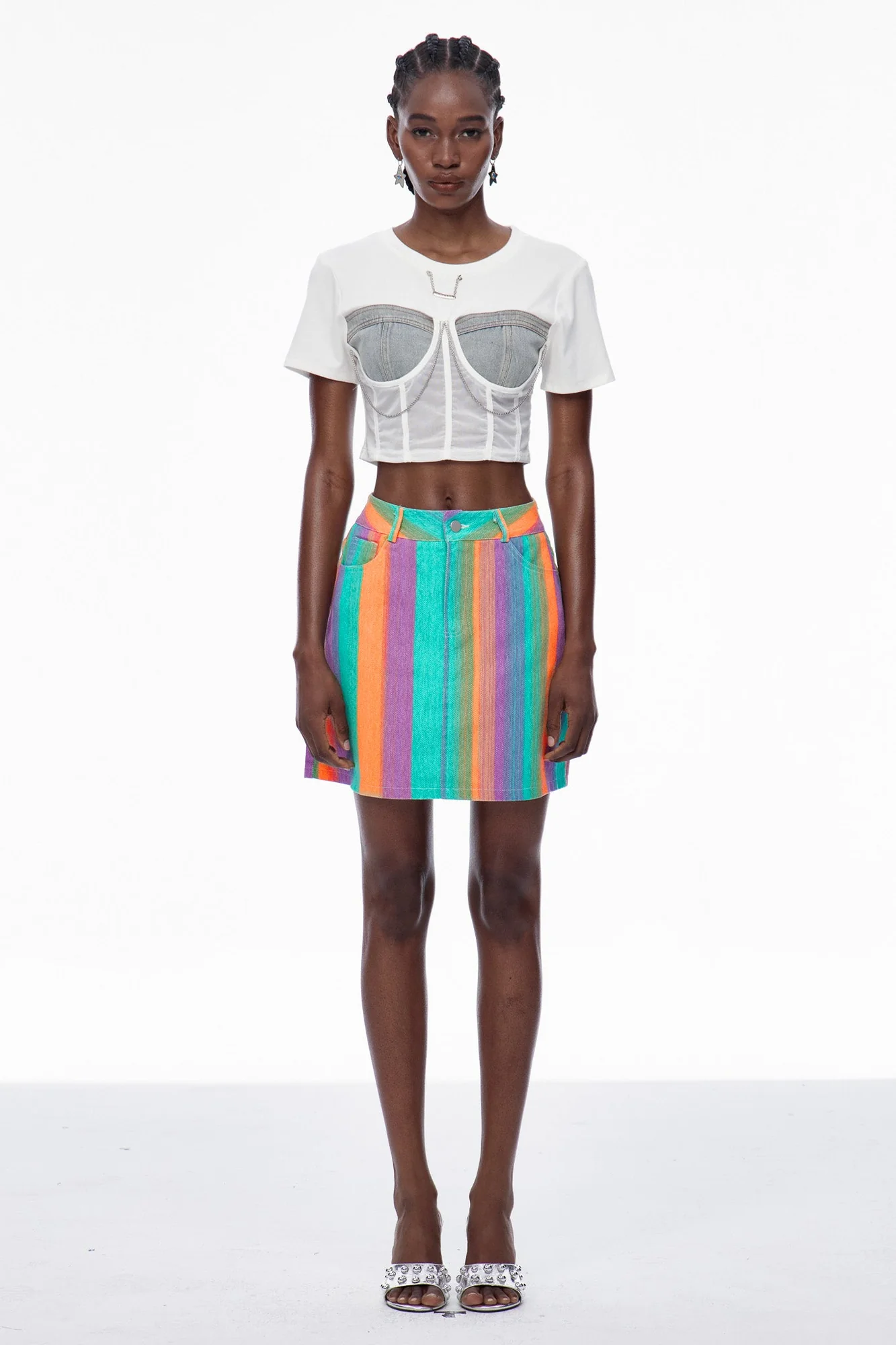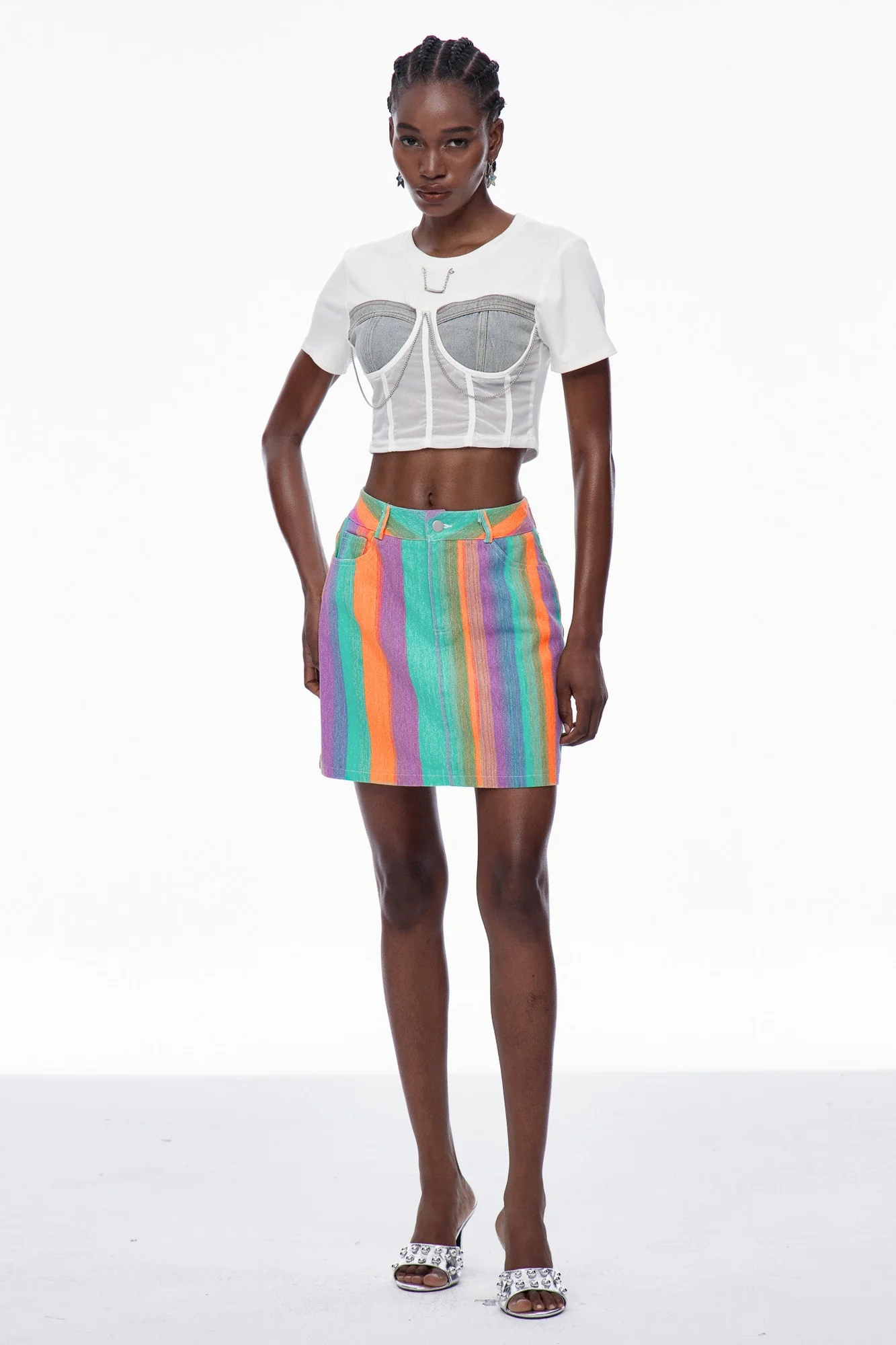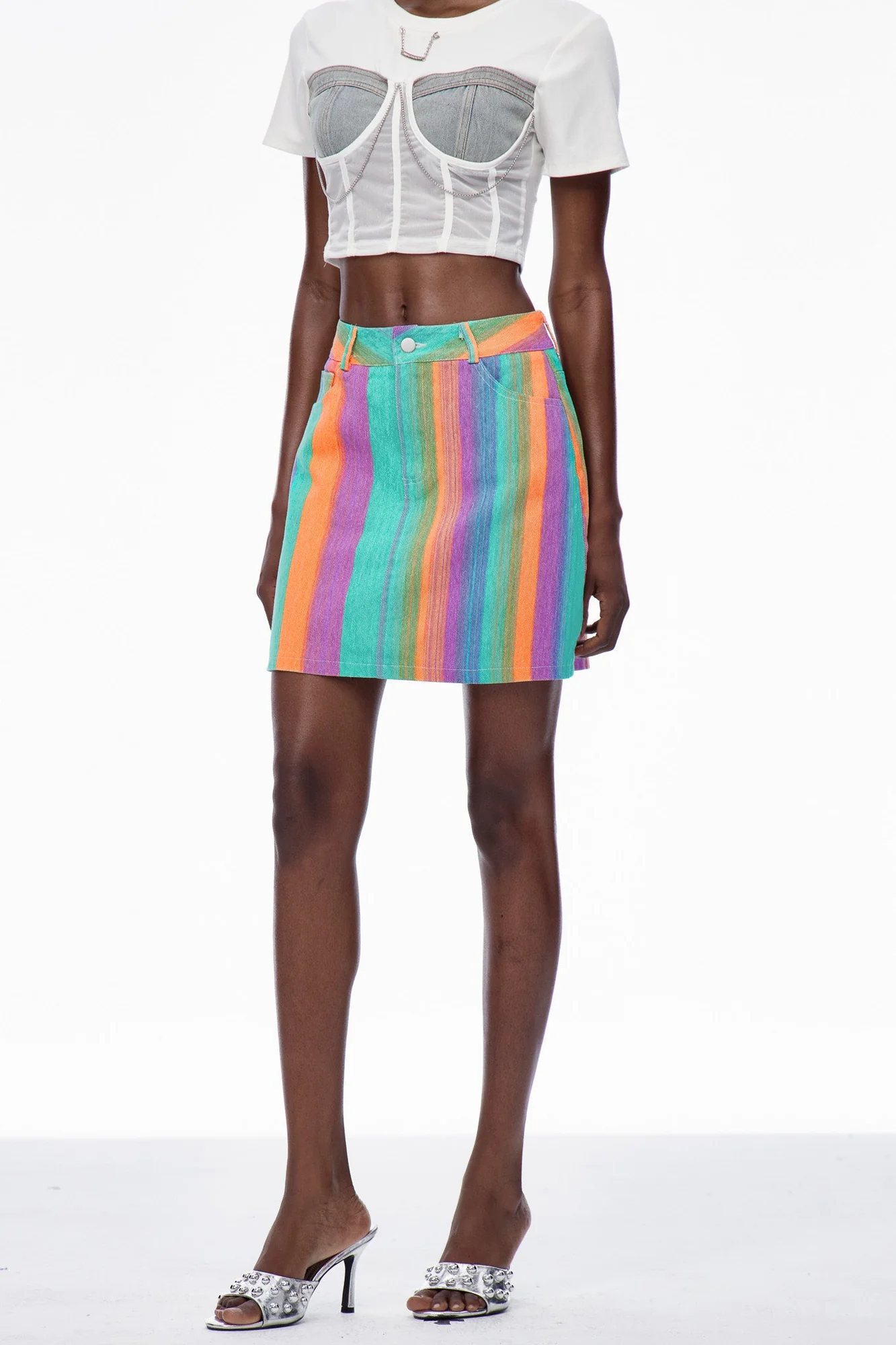 Elevate your everyday look with the Green Stripe Denim Mini Skirt. This skirt offers a fresh twist on classic denim, featuring subtle stripe detailing and a flattering mini silhouette. Crafted for comfort and style, it pairs perfectly with casual tops or dressier blouses. The durable fabric ensures lasting quality, while the contemporary green hue adds a unique touch to your wardrobe. Enjoy the expert craftsmanship and modern design that bring versatility and chic urban edge to your outfit. Stretch Factor: Non-Stretch. Care instructions: Gentle machine wash. Please note that the color may vary due to lighting effects in images.