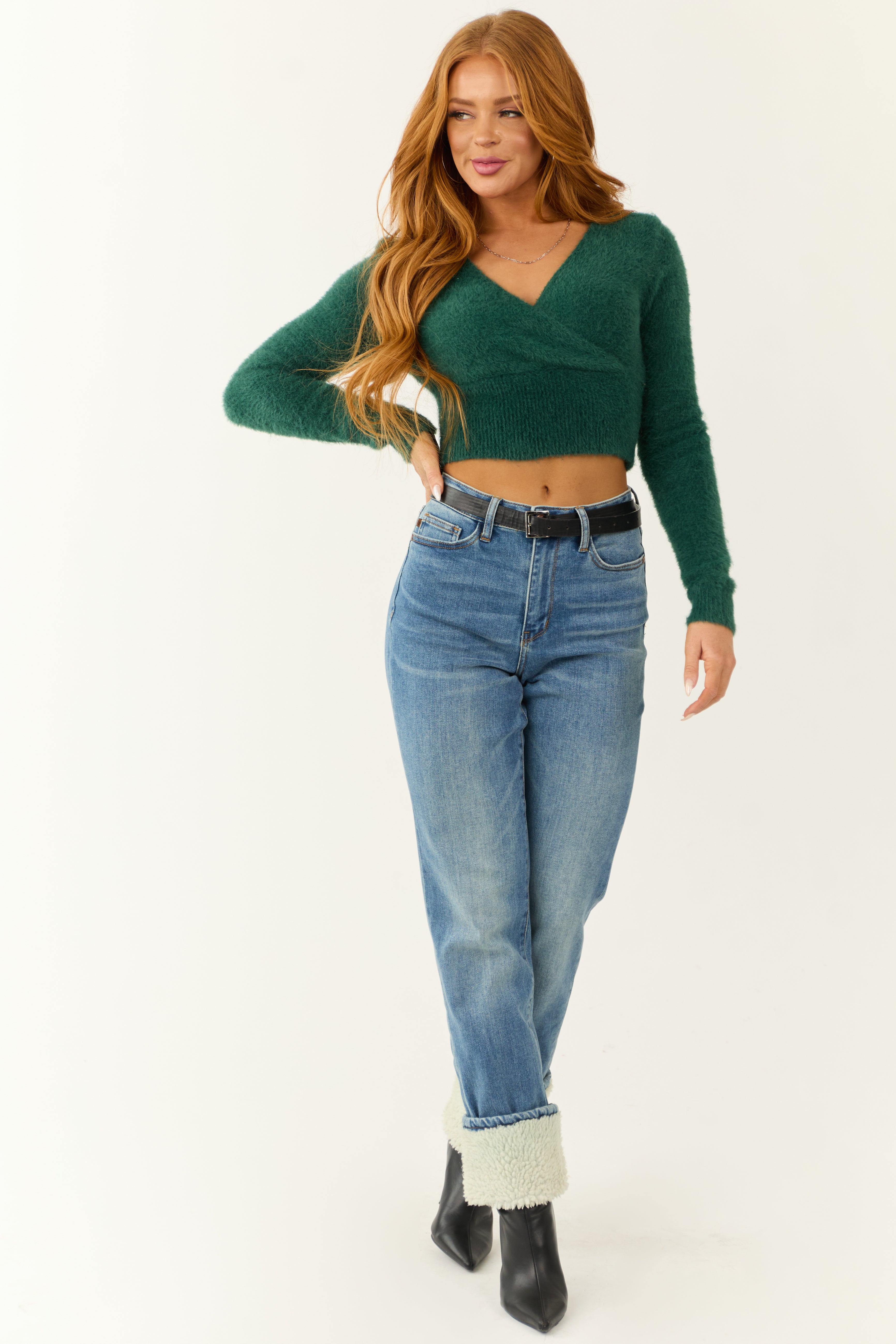 Stay cozy and stylish with our Green Surplice V-Neck Knit Sweater . This sweater features a stretchy and soft eyelash knit, ribbed banded trim, drop shoulder, and a cropped length for a trendy look. The long sleeve design and comfortable V neckline make it a perfect choice for the winter season. Crafted from a blend of 74% Nylon, 20% Acrylic, and 6% Polyester, this sweater is both warm and fashionable. Available in sizes S, M, and L. Hand wash with cold water, line dry, iron low, and enjoy the chic vibe this sweater adds to your outfit.