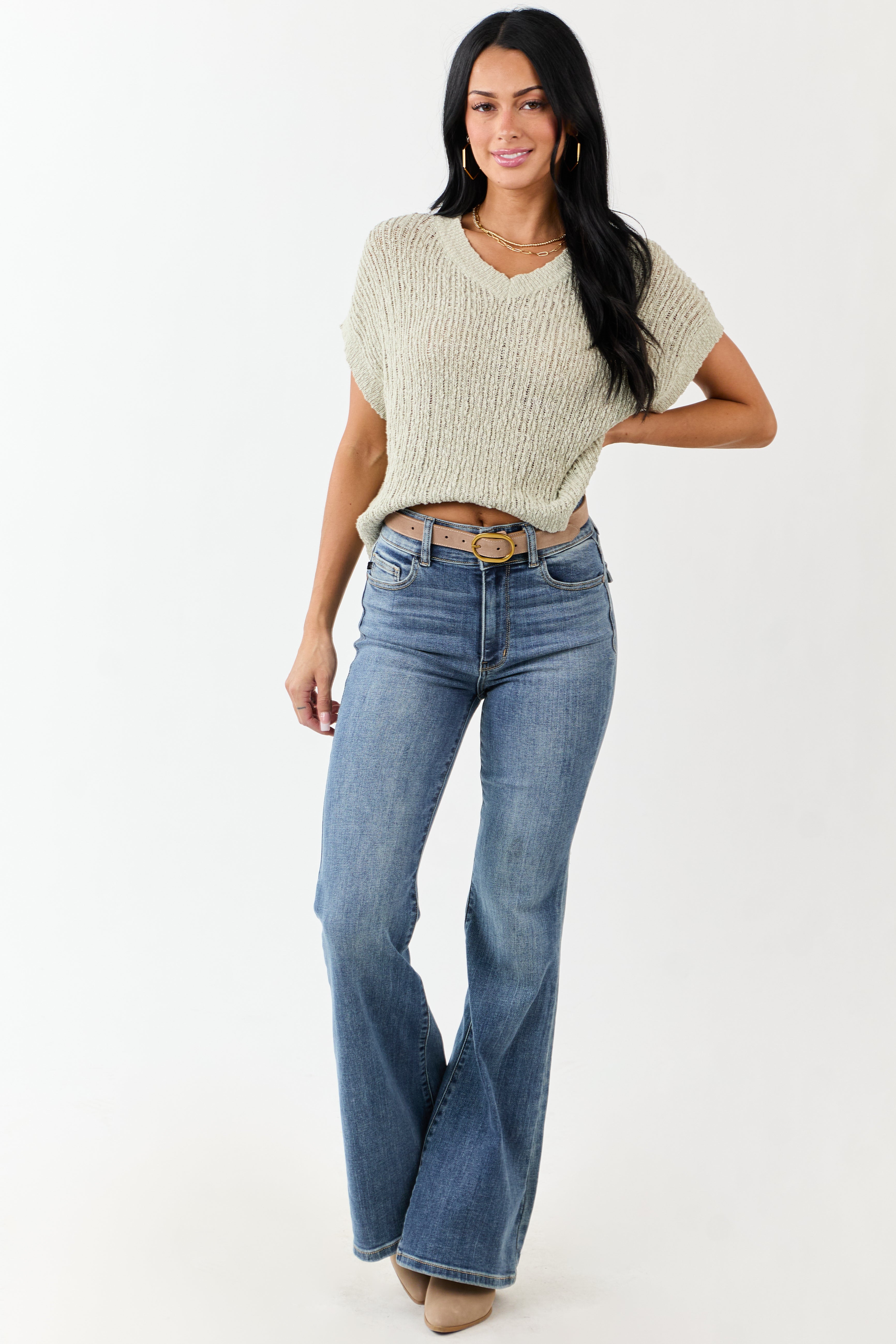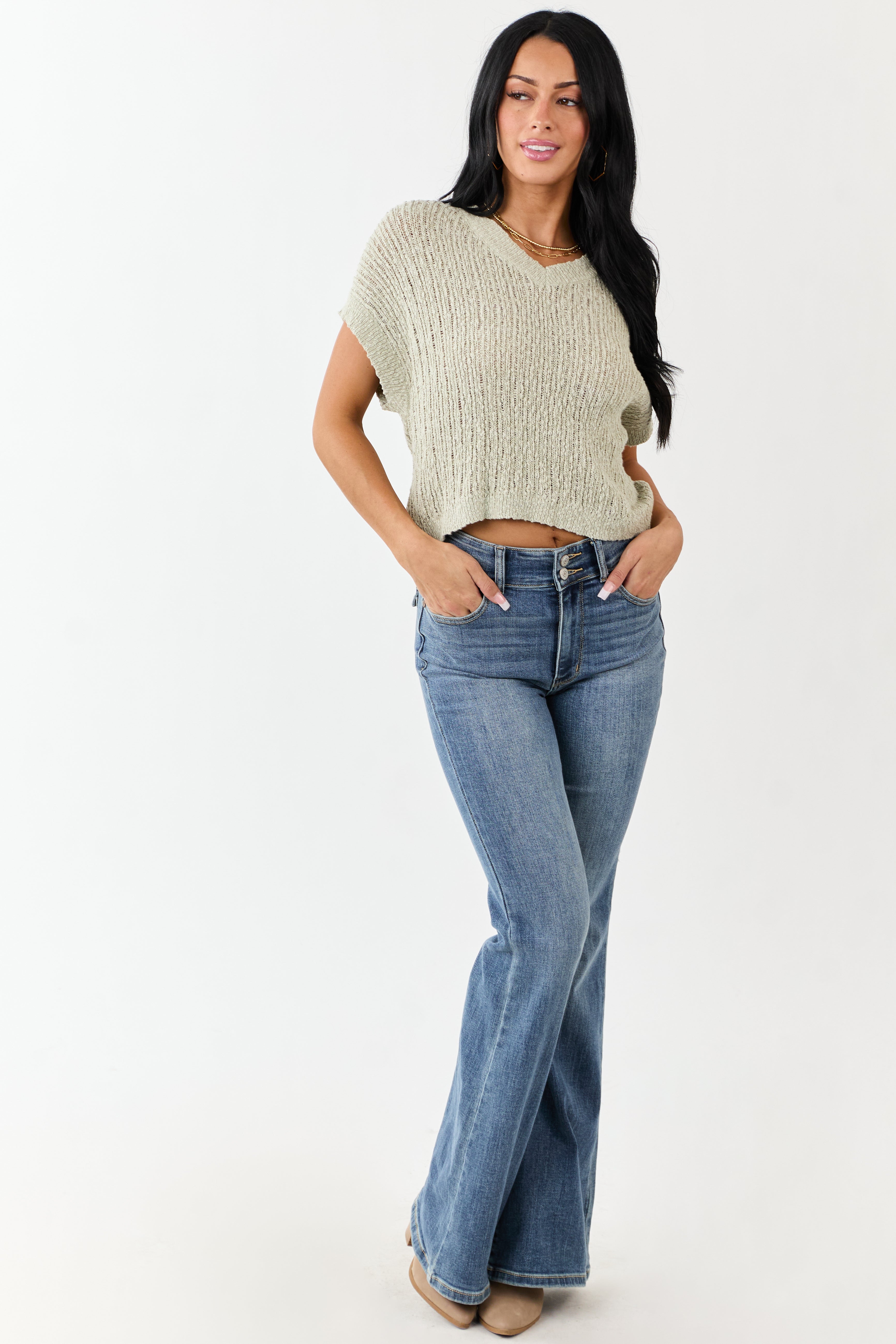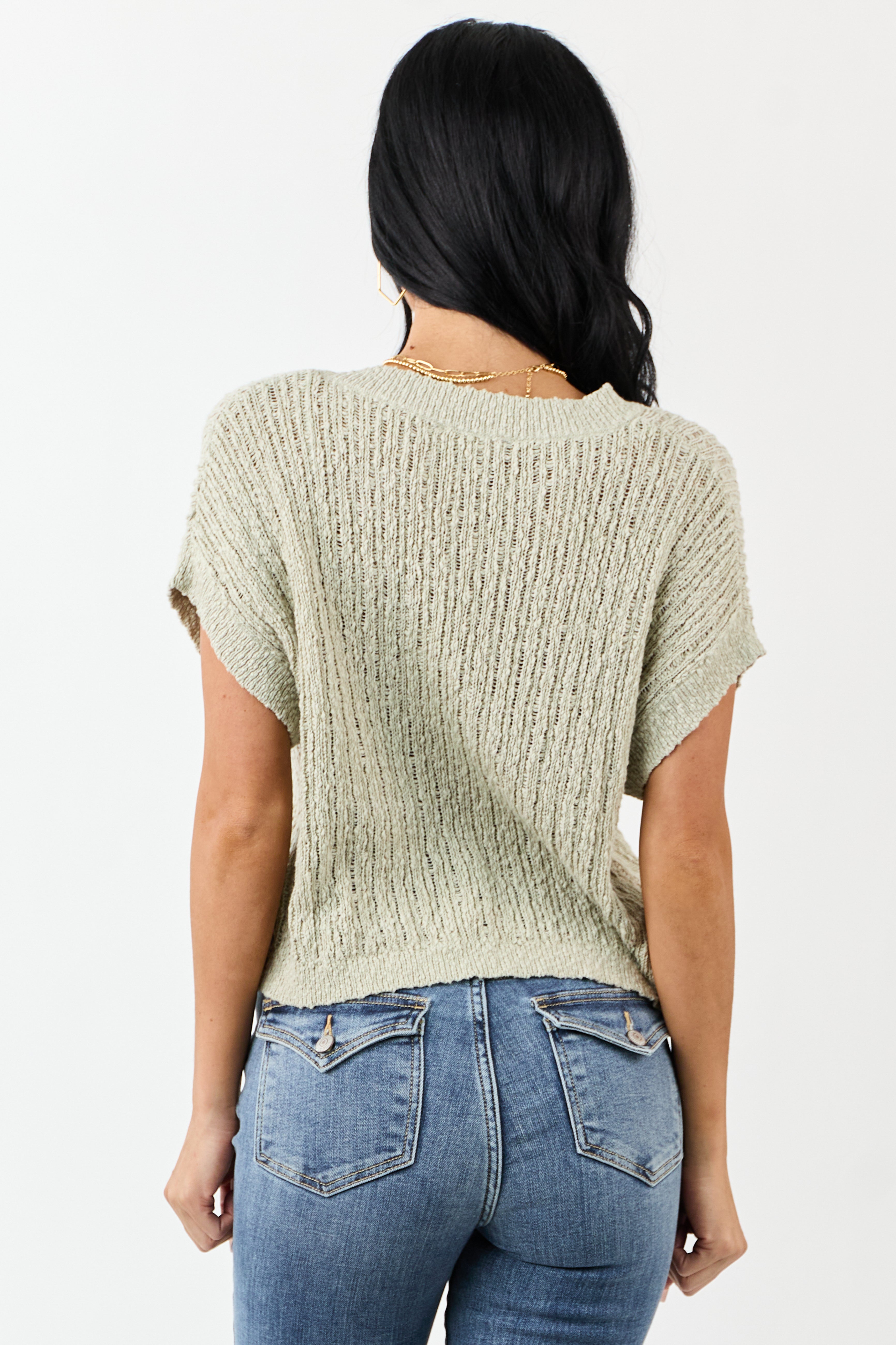 Experience everyday charm with this light and airy green cotton sweater top featuring an open knit design, textured finish, and oversized, relaxed fit. Made of soft and stretchy lightweight cotton for ultimate comfort. Perfect for any casual occasion. Available in sizes S, M, and L. Bust: 44-48 inches, Length: 19-20 inches, Sleeve Length: 4.5-5.5 inches. Imported.