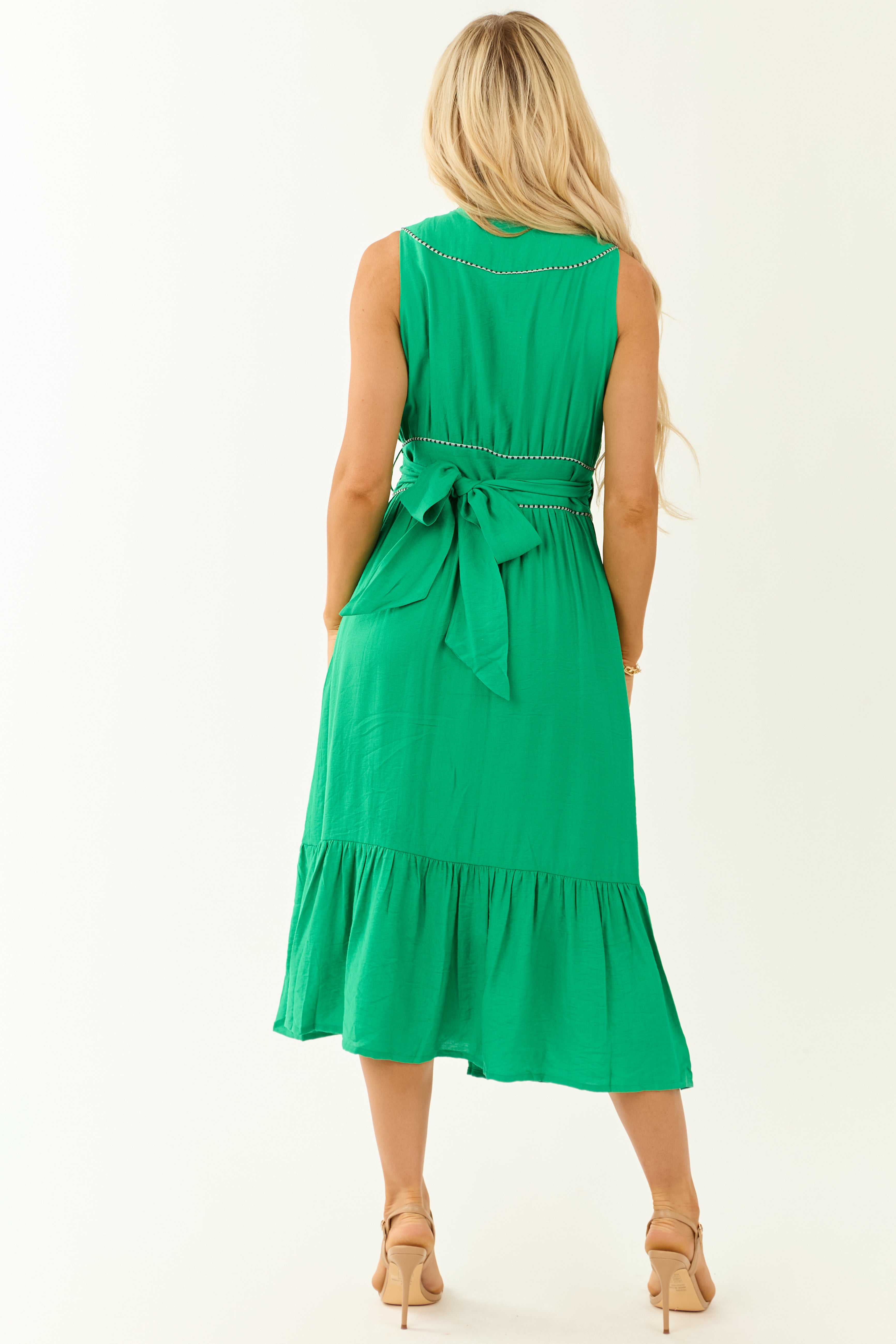 Elevate your style with our elegant green V-neck sleeveless wrap midi dress for women available in sizes Small, Medium, and Large. This comfortable and adjustable dress features bold hunter green contrast trim, adjustable waist with tie closure, and a flattering tiered design. Made of 100% polyester with a lining for added comfort. Perfect for spring and summer occasions. Size down for the perfect fit!
