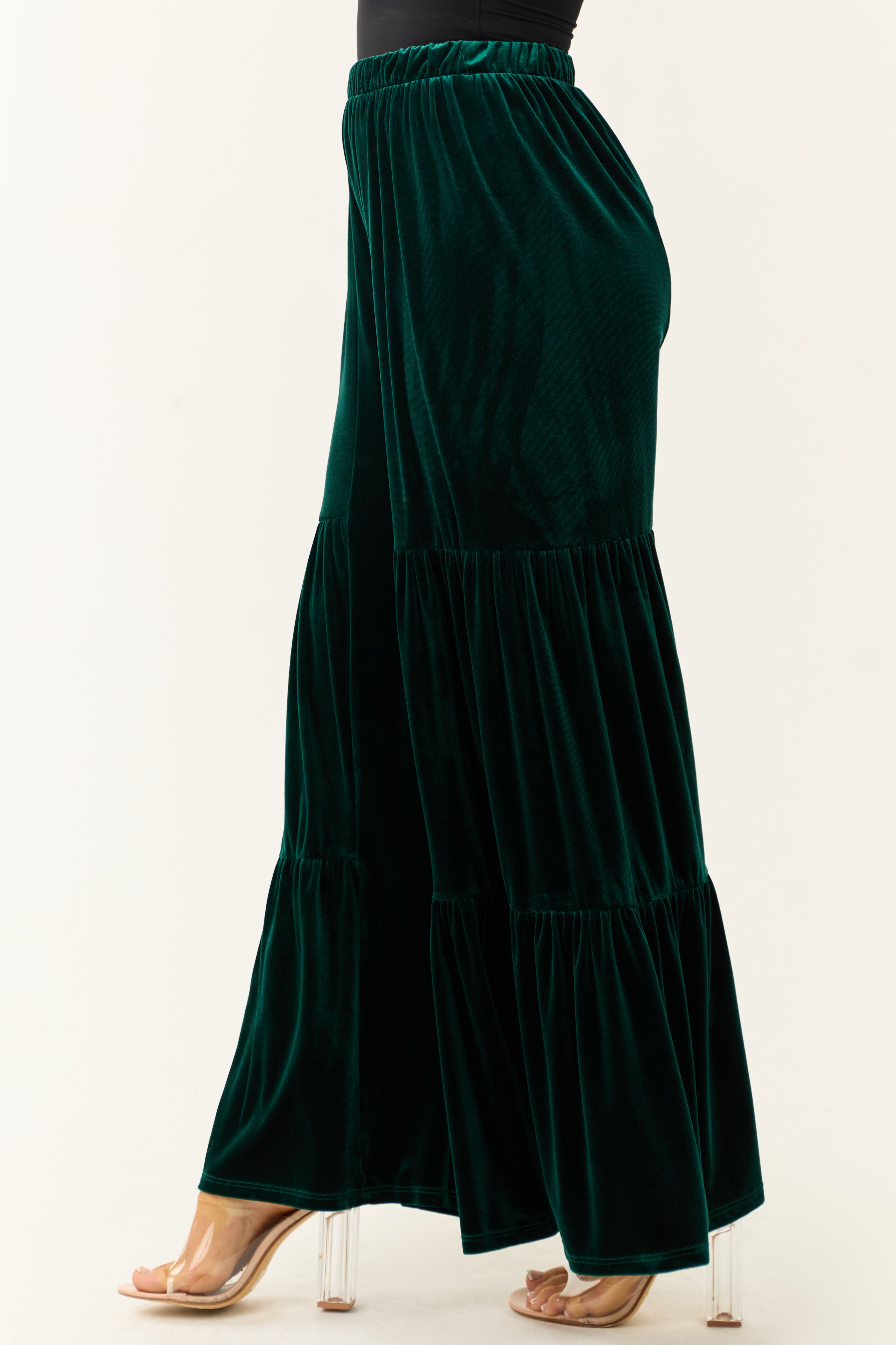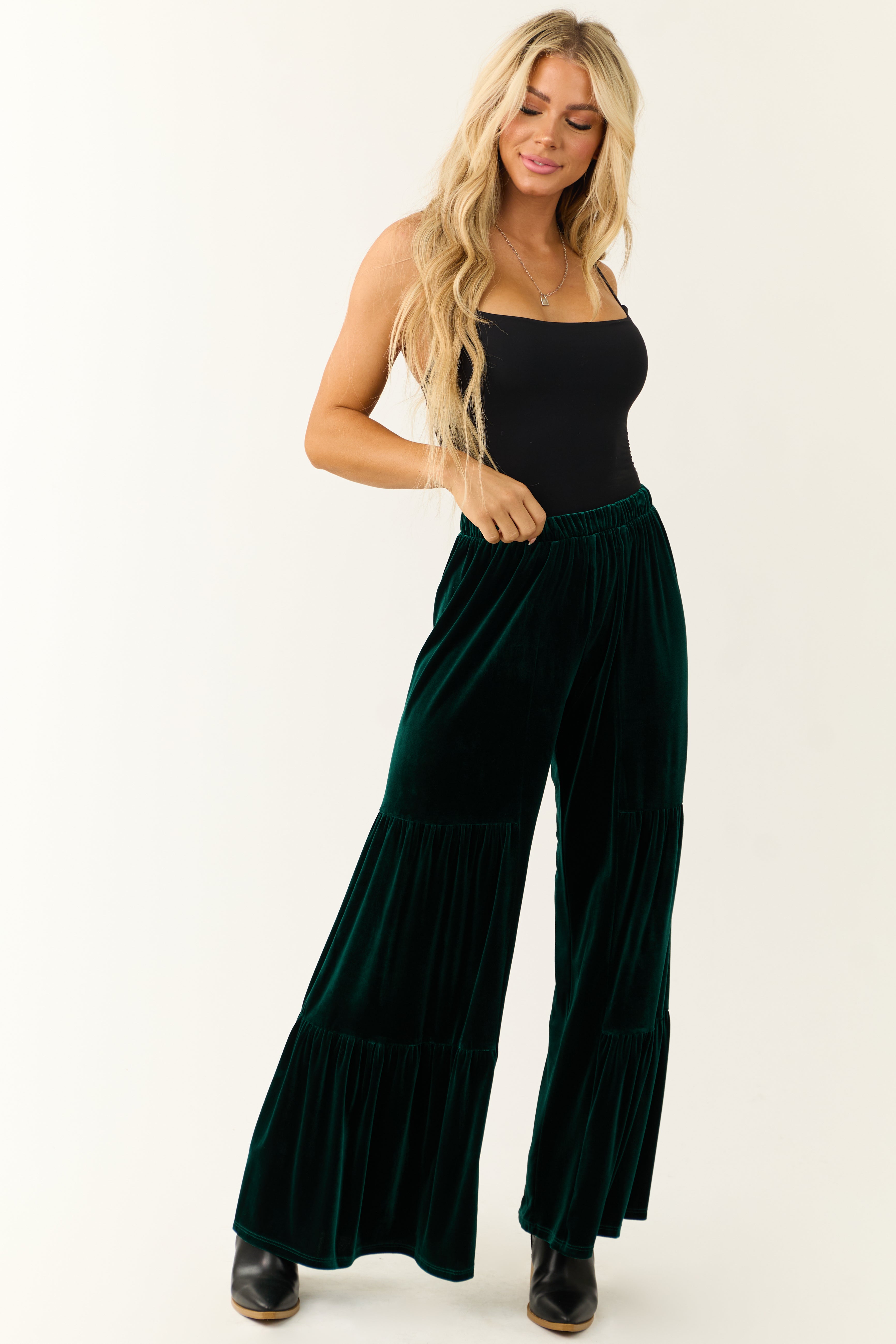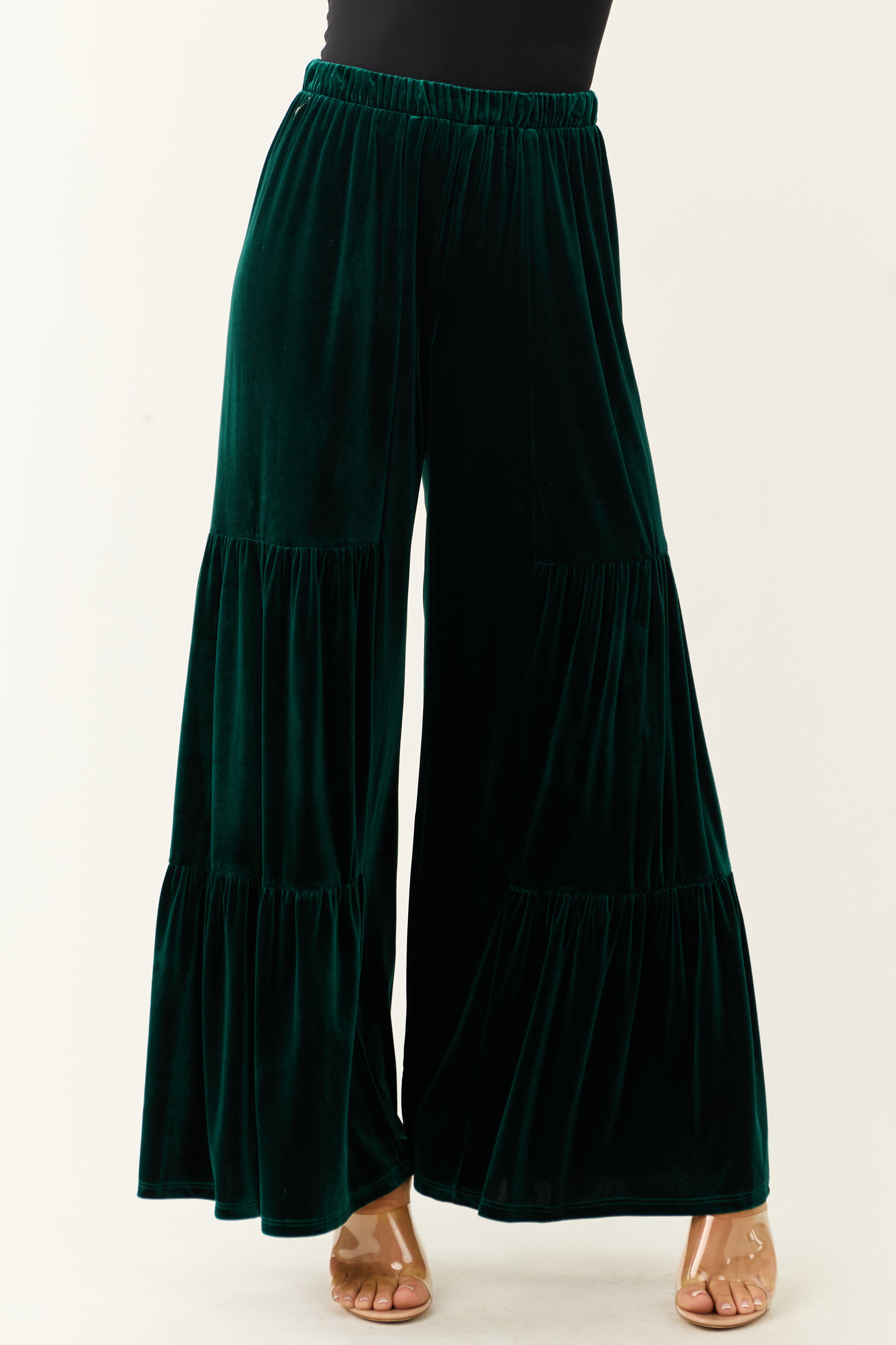 Indulge in the luxurious comfort and style of these Forest Green Velvet Tiered Wide Leg Pants . Crafted from semi-stretchy velvet, these pants feature an elastic waistband for a perfect fit and extra room. The rich forest green color adds a vibrant touch to your outfit. Available in sizes S, M, and L with inseam lengths of 30″, 31.5″, and 33″ respectively. Hand wash cold, line dry. Model is wearing a size Small. Elevate your wardrobe with these elegant velvet pants!