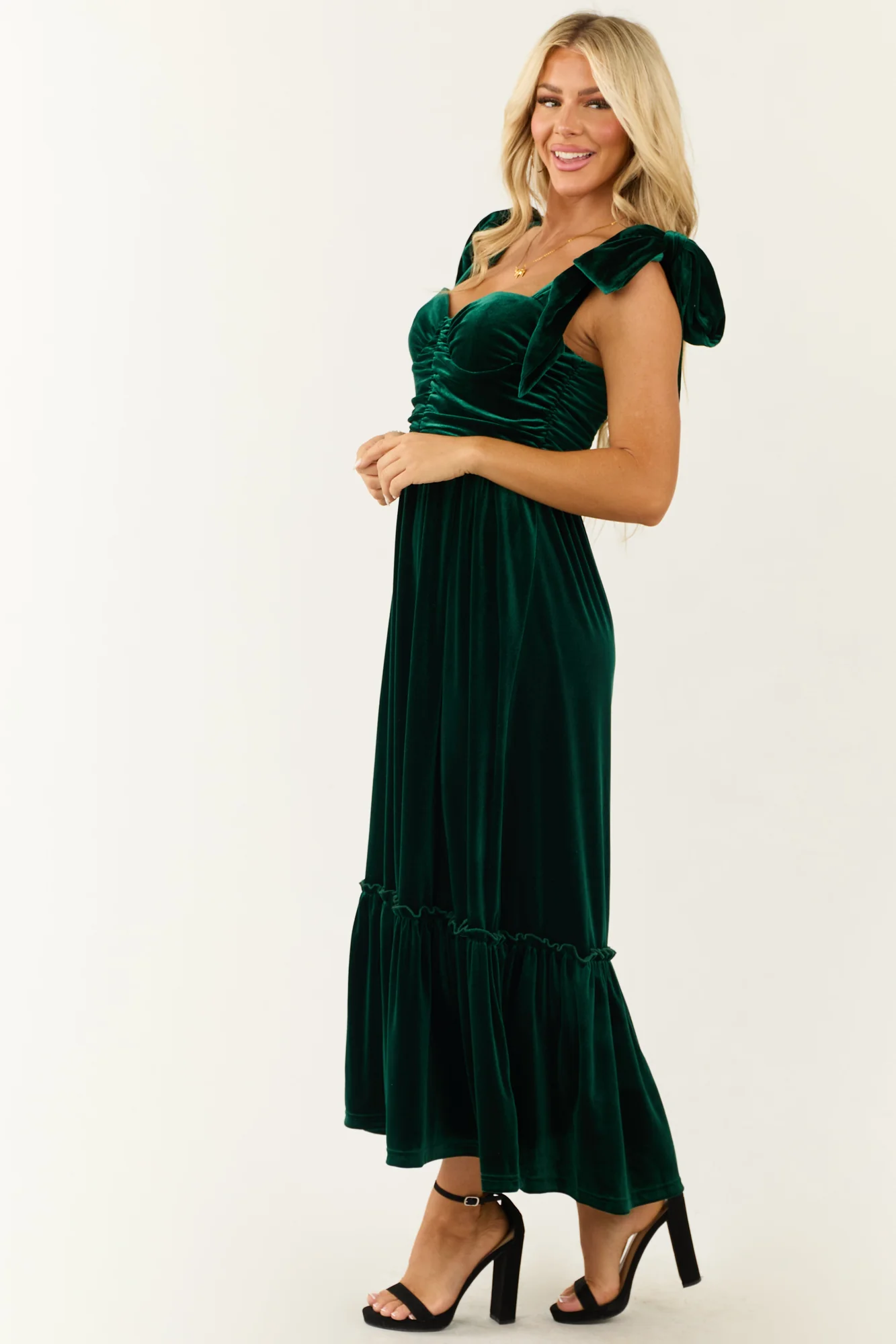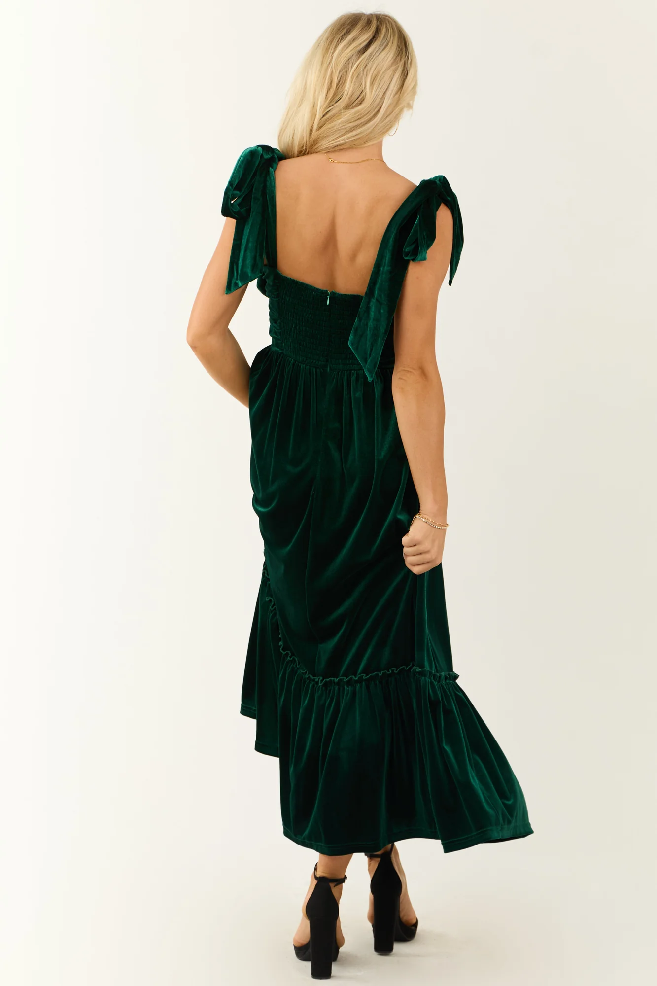 This gorgeous Green Velvet Ruched Maxi Dress with Adjustable Shoulder Ties is designed to make you stand out in style. Crafted from stretchy velvet with a smocked back for a perfect fit, this dress features a sleeveless sweetheart neckline, ruched torso, and a feminine ruffle hem. The adjustable shoulder ties add a touch of elegance while the back zipper ensures easy wear. Perfect for date nights or holiday events. Hand wash cold, hang to dry. Available in sizes S, M, L, and XL.