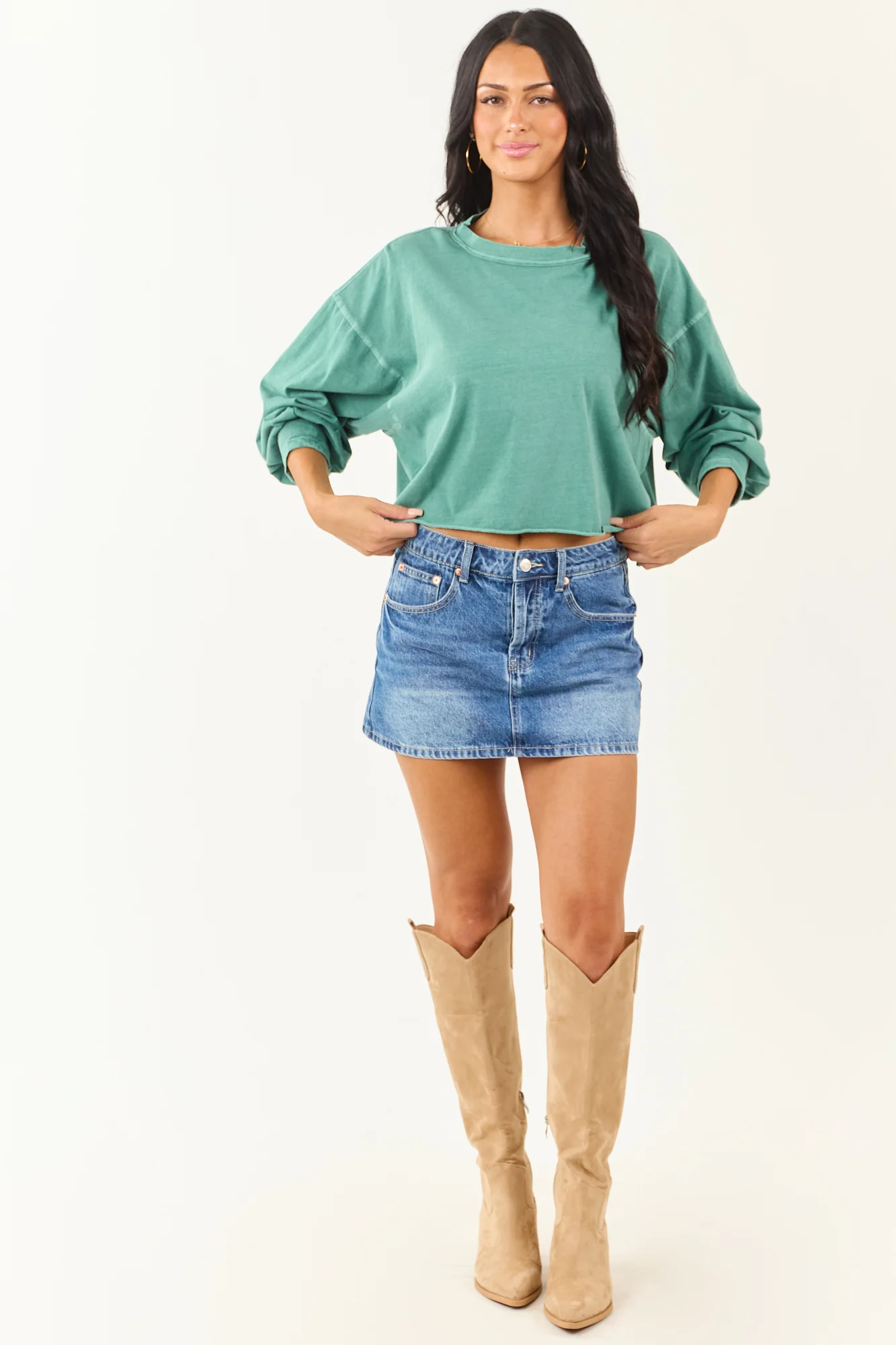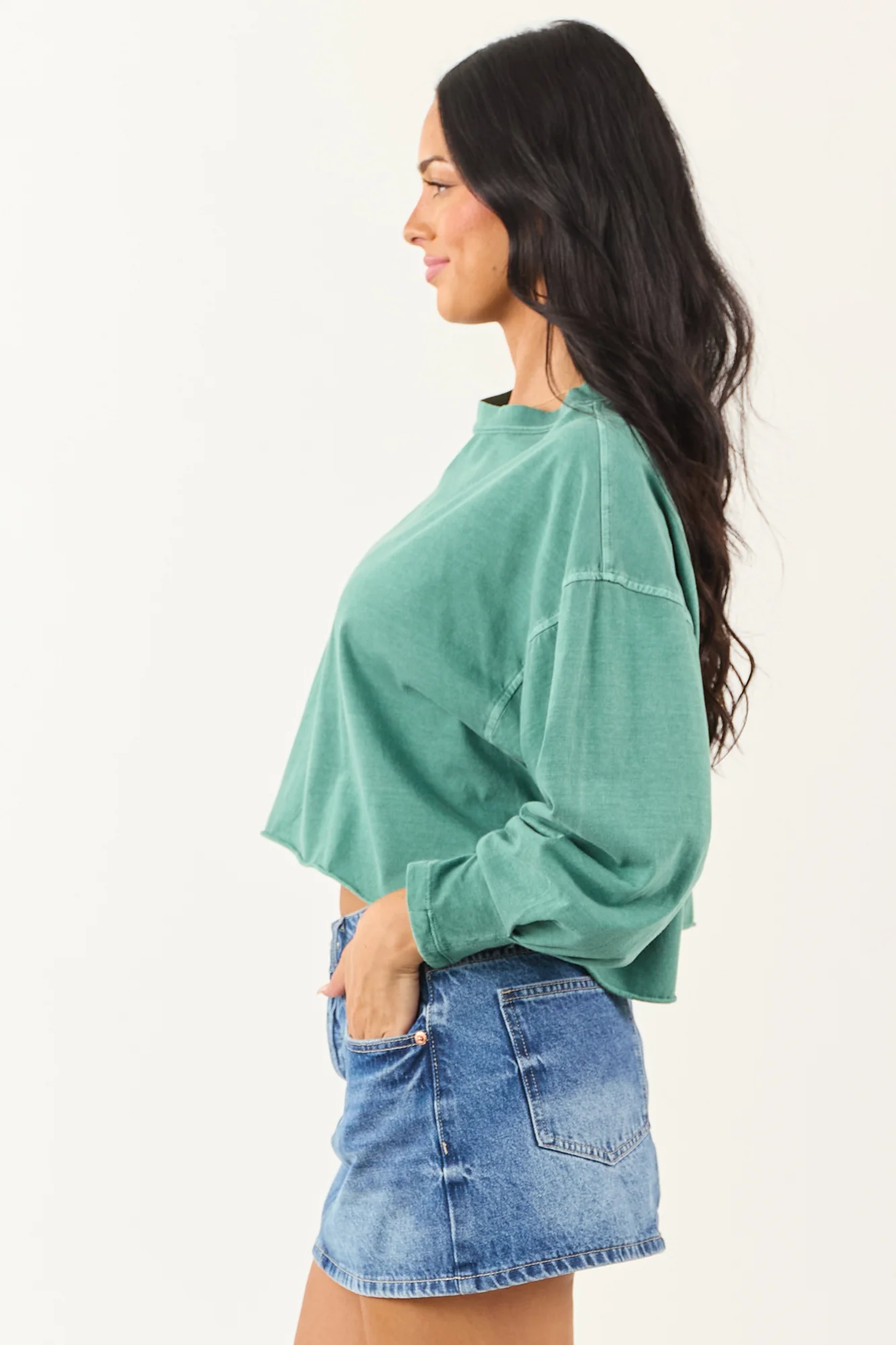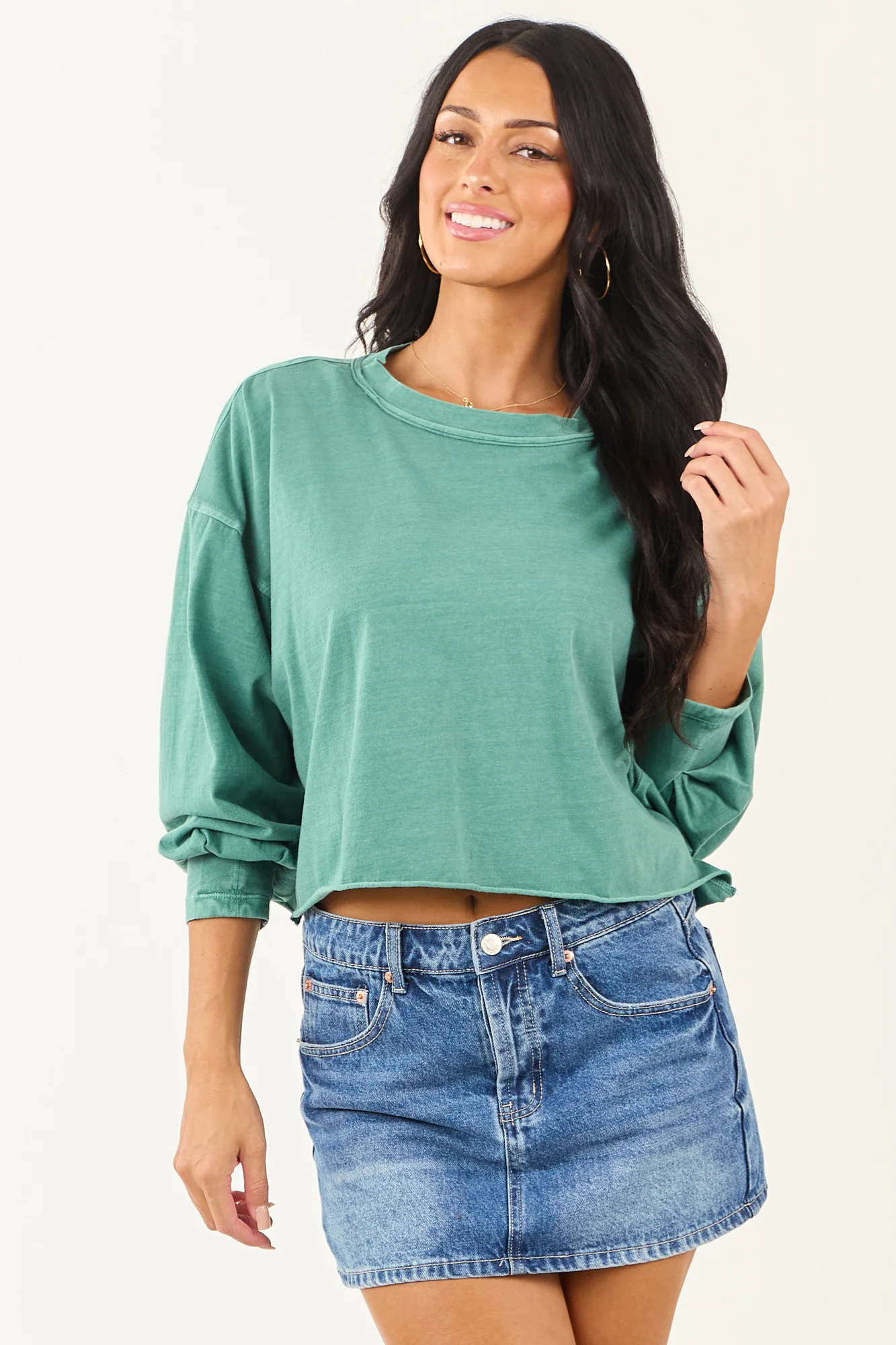 Experience comfort and style with our Green Washed Long Sleeve Cotton Top featuring a cozy, pleated cuff detail, raw hem, and a boxy fit for a fashionable look. This top is crafted from breathable cotton fabric, ensuring a stretchy knit and drop shoulder. Stay uniquely chic with this imported 100% Cotton top that offers versatility suitable for various occasions. Note: Each piece is exclusive due to the dying and washing process. Model wears size Small. Model’s Profile: Size 1, Height 59″, Bust 34″, Waist 26″.