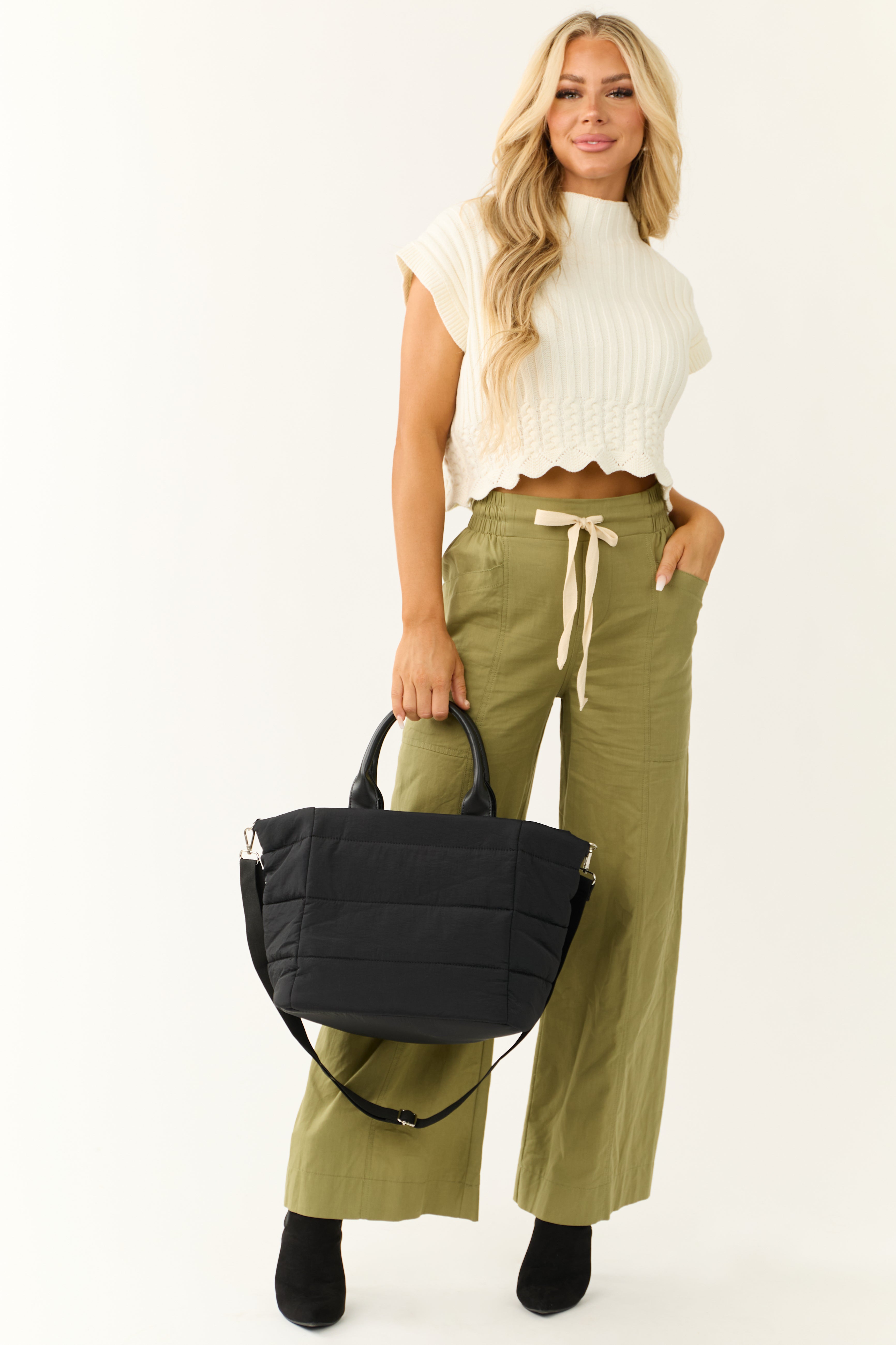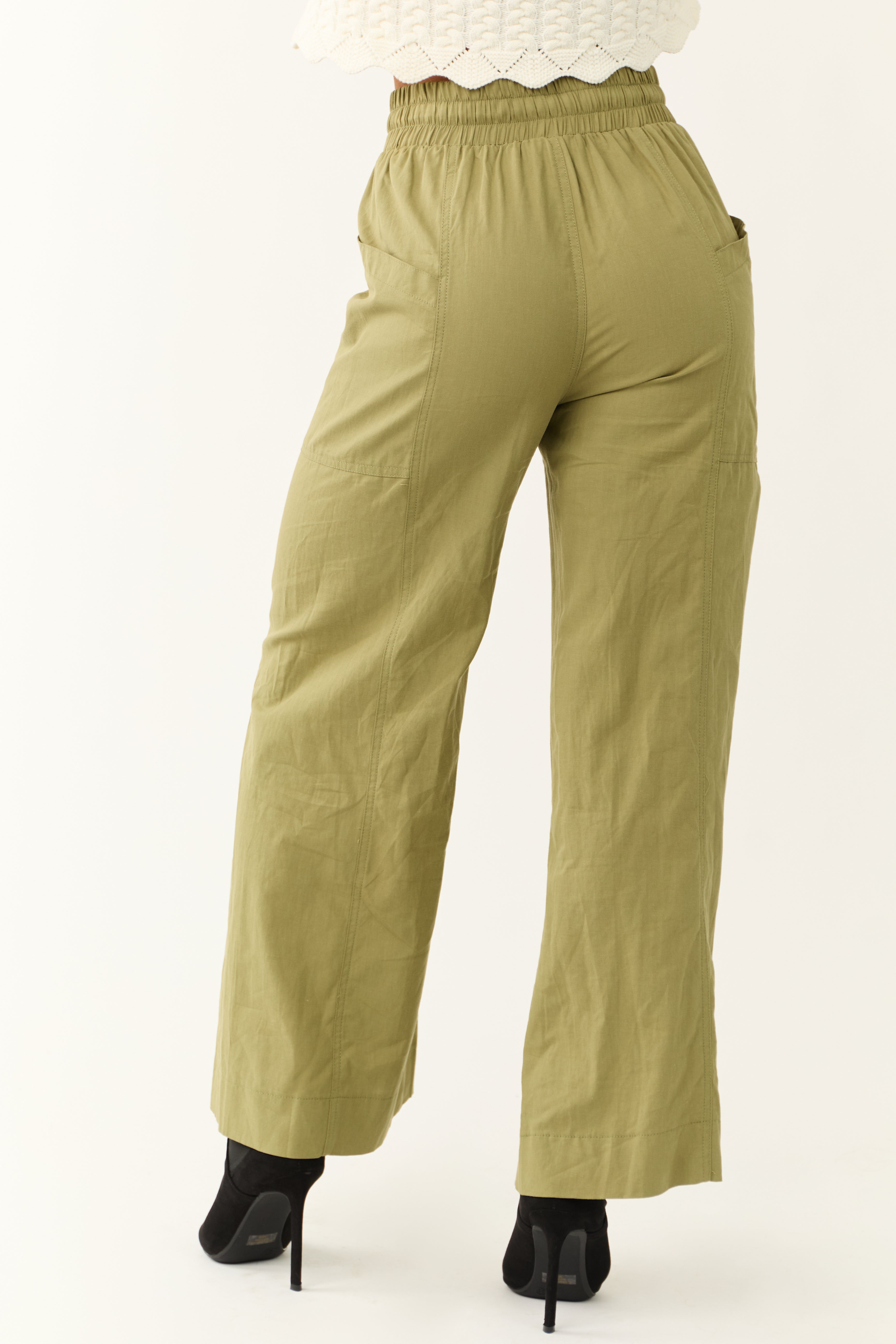 Stay comfortable all day with our Green Wide Leg Cotton Pants. Crafted from 100% cotton, these pants feature a smocked high waist with a drawstring for adjustable fit. Designed with side pockets and a non-stretchy woven fabric, these pants offer both style and convenience. The high waist design with a front rise of 12.5″ and a back rise of 14.5″ elongates your silhouette, making them perfect for any occasion. Available in sizes Small, Medium, and Large.