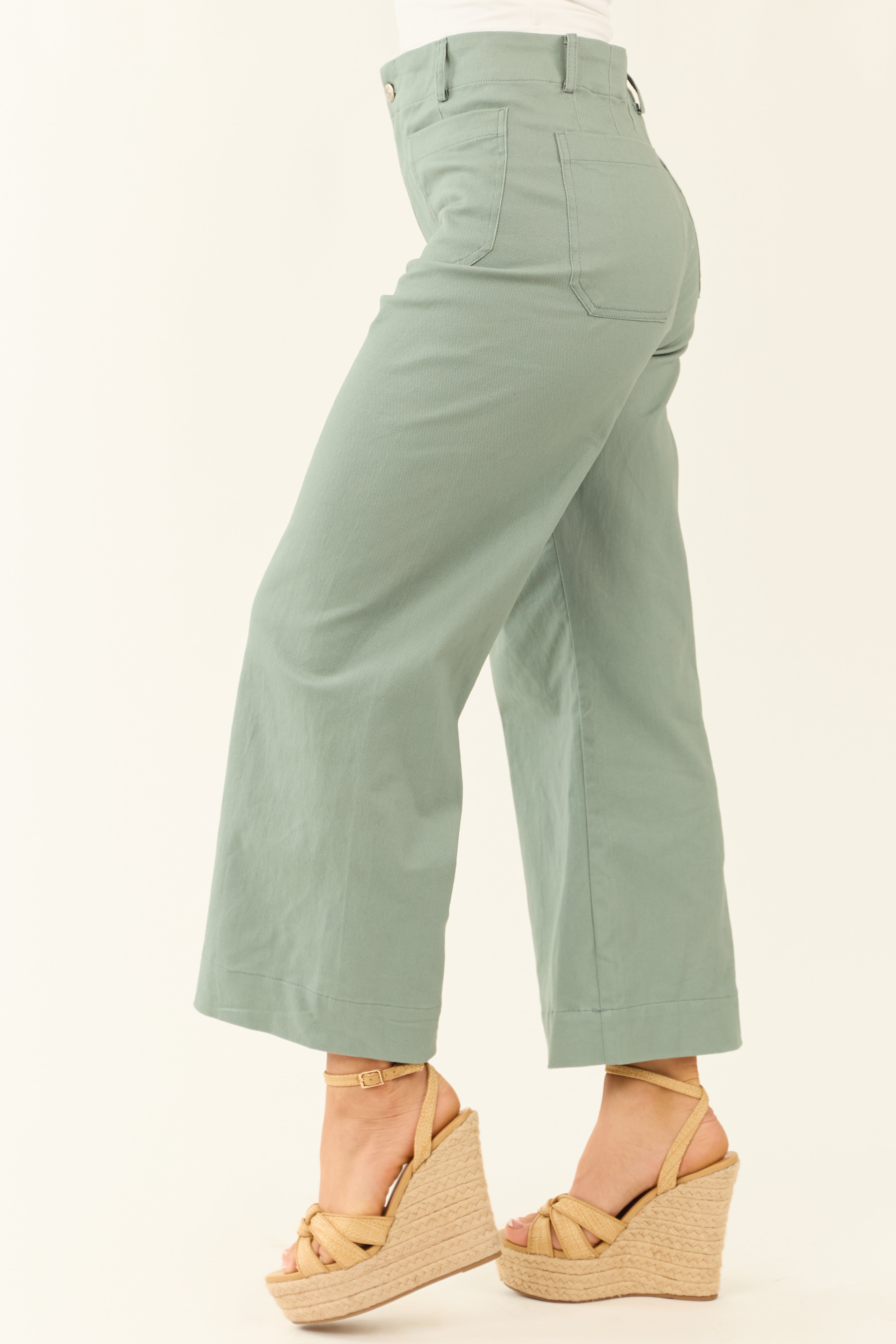 Experience style and comfort with our Green Wide Leg Cropped Cotton Denim Jeans. These jeans feature a high rise, pleated waist detail, and back pockets. Made of semi-stretchy denim, they offer a perfect fit. The zipper fly with button closure adds convenience, while the hidden inside waist button closure ensures a sleek look. Elevate your wardrobe with these fashionable jeans that blend style and functionality effortlessly.