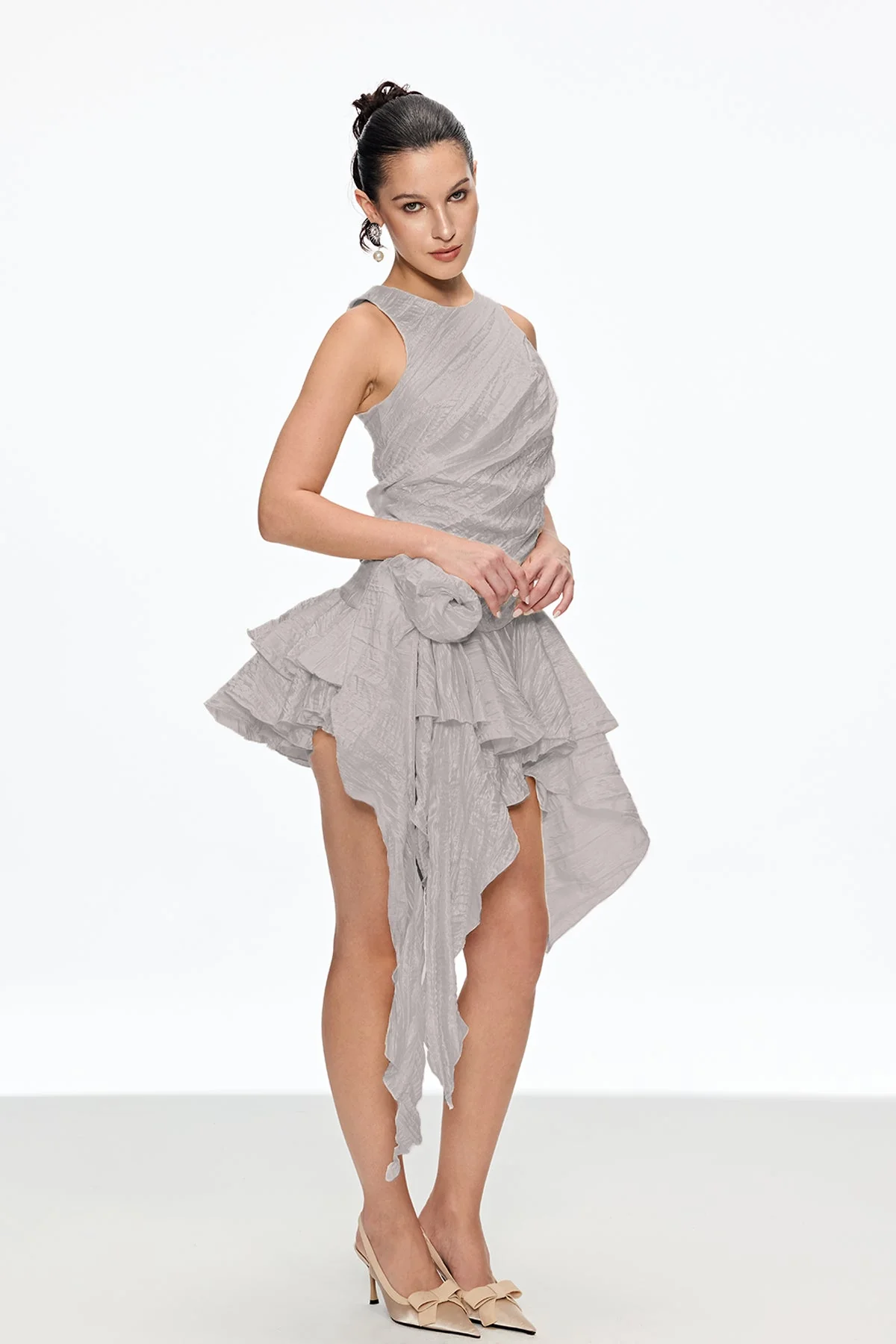 Elevate your style with our Grey Asymmetric Ruch Flower Mini Dress. This sophisticated piece features expertly crafted ruching and an asymmetric hemline for a modern silhouette that flatters the figure. Perfect for upscale events or stylish evenings, the versatile grey color allows for easy accessorizing. The unique cut adds a contemporary touch to your wardrobe, ensuring you stand out elegantly. Non-Stretch fabric. Care: Gentle machine wash. Lighting may affect color variations.