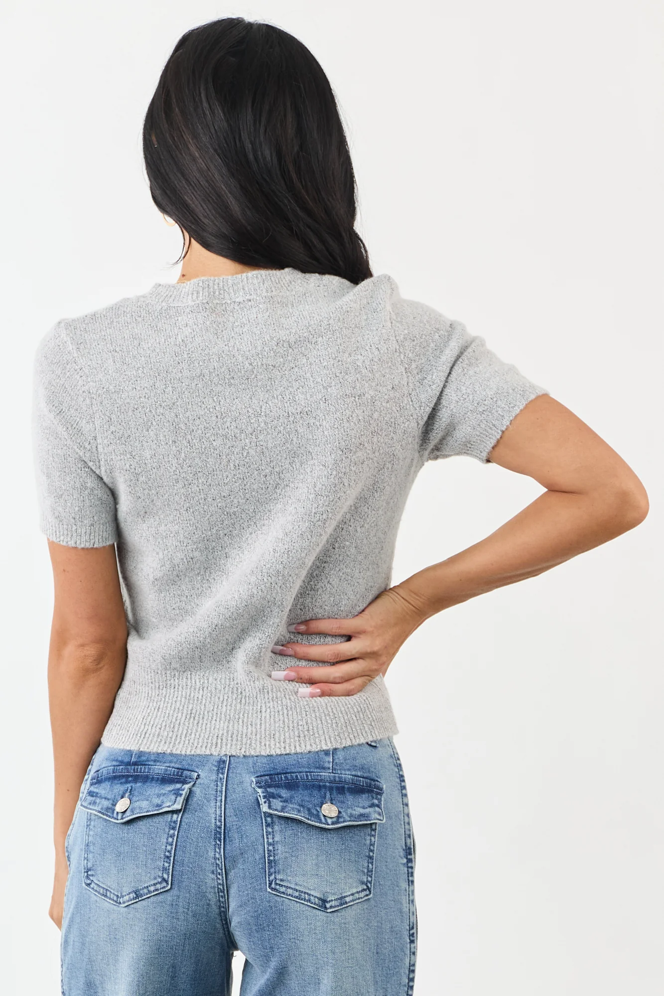 Stay cozy and chic with our Dove Grey Short Sleeve Mid Length Knit Sweater Top. Effortlessly stylish, this top features a stretchy soft knit material with banded trim for a perfect fit. Made of 72% Acrylic, 25% Polyester, and 3% Spandex, its timeless and versatile, ideal for layering or wearing solo. Available in sizes S, M, and L, with bust measurements of 34″, 36″, and 38″, and lengths of 21″, 21.5″, and 22″. Sleeve lengths include 9″, 9.25″, and 9.5″. Elevate your wardrobe with this cozy essential .