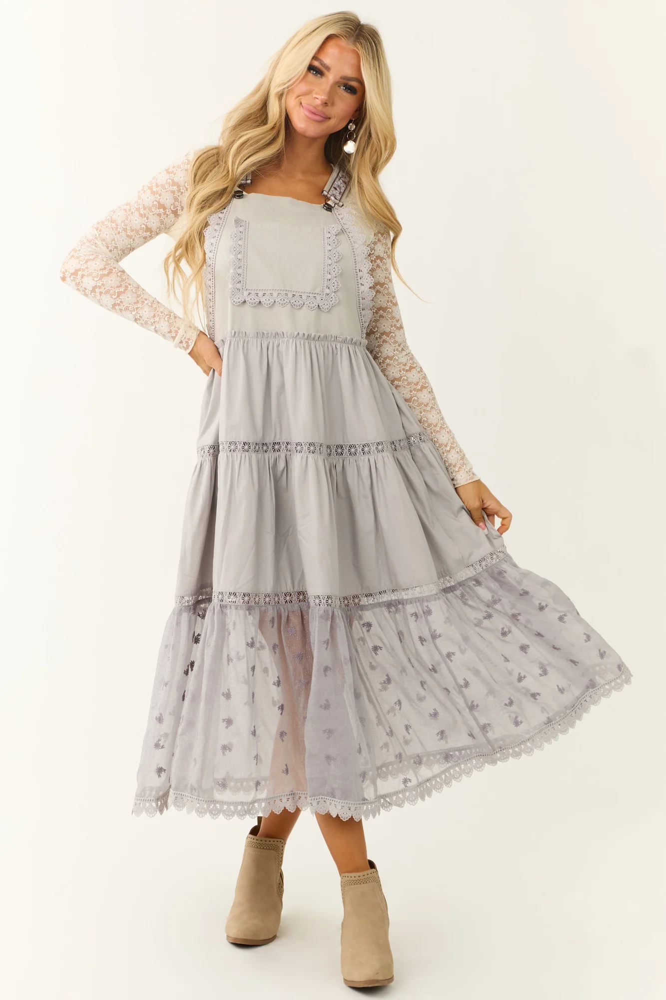 Elevate your style with our Grey Lace Tiered Maxi Dress. Featuring a flowy fit, abstract strap print in Vanilla and Black, adjustable straps, lace trim, and embroidered mesh bottom tier skirt. Stay comfortable all day with side pockets, square neckline, and sleeveless design. Crafted from 100% Cotton with Polyester lining for a luxurious feel. Perfect for date night or wedding guest attire. Hand wash only. Model is wearing a size Small.