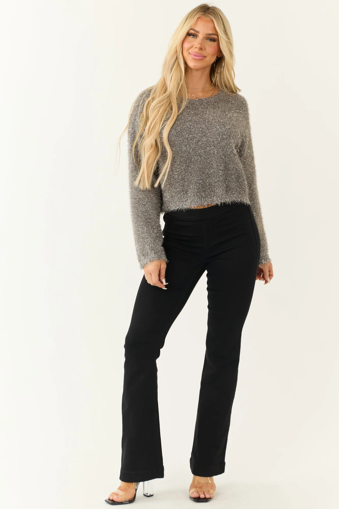 Stay cozy and stylish with our Grey Metallic Knit Cropped Sweater. Crafted from a stretchy metallic eyelash tinsel knit, this sweater features long wide sleeves, a drop shoulder design, and a crew neckline for a laid-back vibe. The slightly cropped length adds a modern touch to your outfit. Made of 50% Polyester and 50% Nylon, this sweater offers comfort and style in one. Available in sizes S, M, and L. Hand wash cold, lay flat to dry. Ideal for casual outings or cozy nights in. Model is wearing a size Small. Size chart: Size 1, Height 57, Bust 34, Waist 26.
