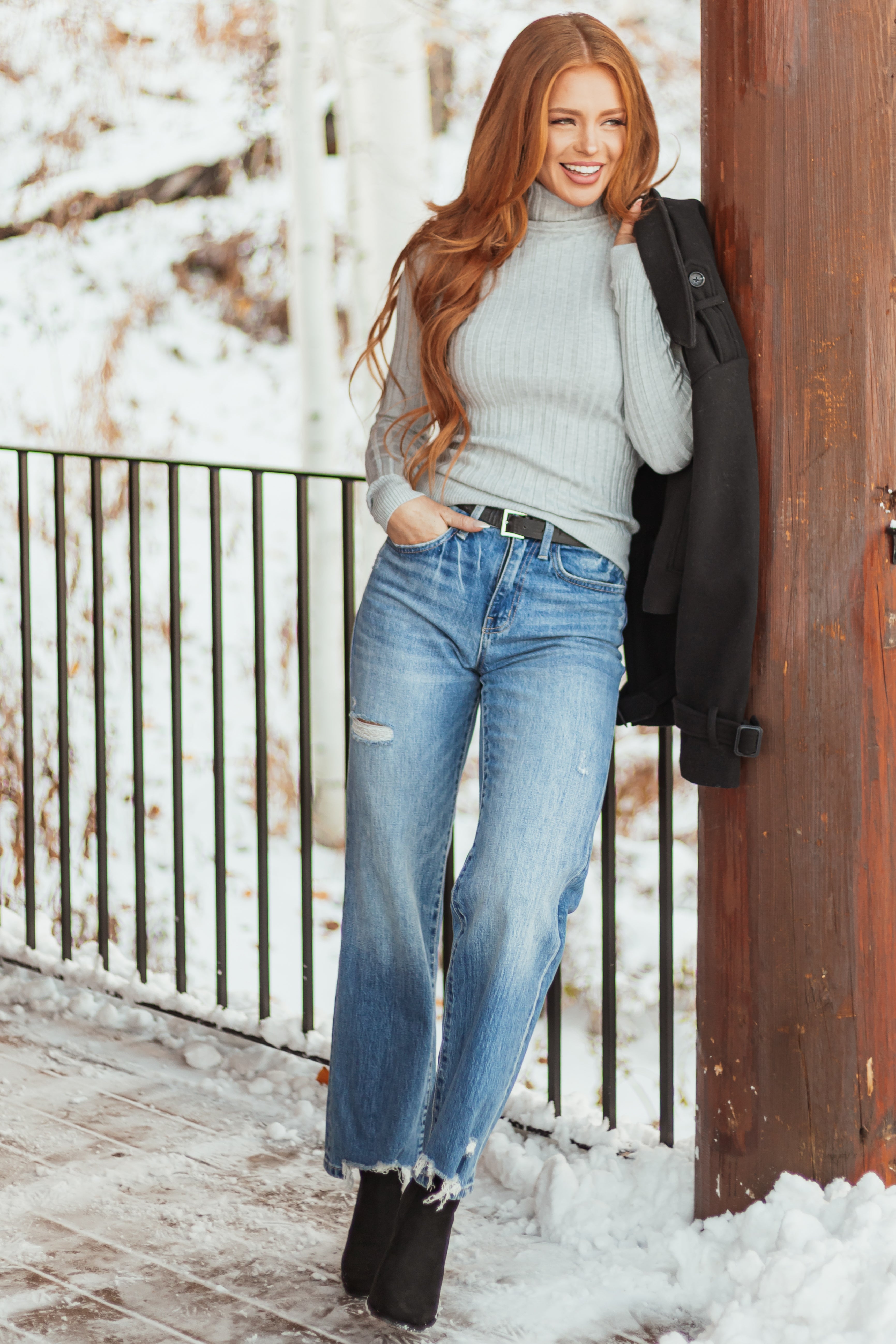 Stay cozy and stylish in this Grey Ribbed Knit Turtleneck Sweater . Crafted from a blend of 50% Viscose, 22% Nylon, and 28% PBT, this long sleeve knit sweater features a fitted design with stretchy ribbed texture. The banded cuffs and hem add a touch of elegance. Perfect for winter, pair it with your favorite bottoms for a chic look. Care Instructions: Hand wash cold, iron low. Model is wearing size Small – Height: 55″ | Bust: 31″ | Waist: 24″