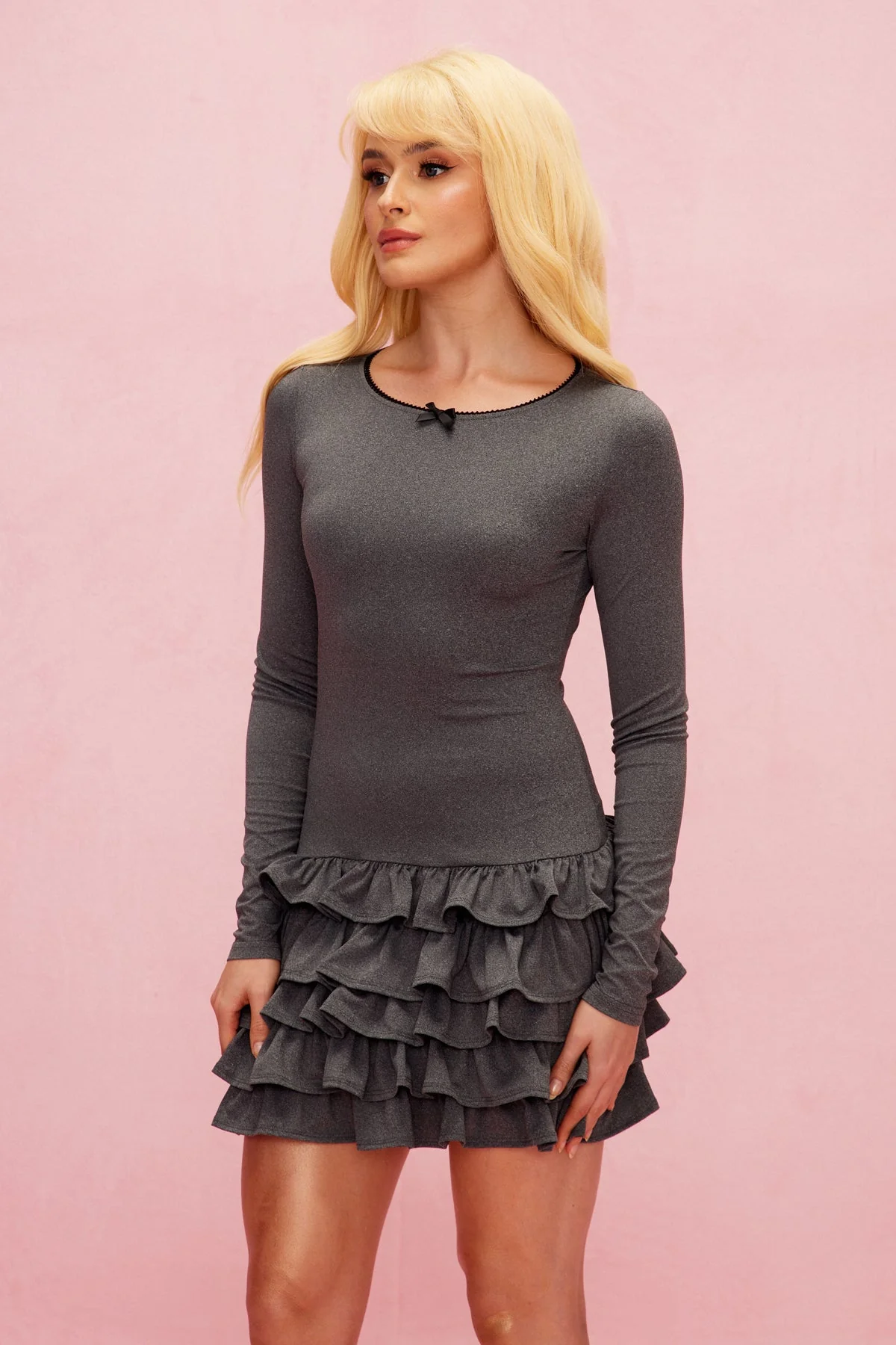 Elevate your style with the Grey Ruffle Mini Dress featuring a chic crew neck design. Crafted from high-quality materials for comfort and versatility. This modern and feminine dress is perfect for any occasion. Add a touch of sophistication to your wardrobe effortlessly. Material: 50% Polyester, 50% Cotton. Experience a slight stretch for added comfort. Care Instructions: Gentle machine wash. Please note, color may vary due to lighting discrepancies in images.