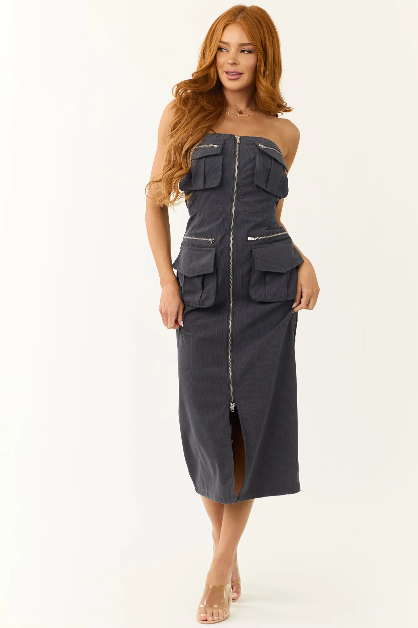 Indulge in effortless style with our Grey Strapless Cargo Front Zip Midi Dress. Crafted from non-stretchy textured woven polyester, this dress features four cargo pockets, a front slit, double front zipper, and faux zipper pockets. Stay comfortable in sizes S, M, and L for waist 28-30 inches, length 40-41 inches, bust 28-32 inches. Ideal for casual or daytime wear, this dress offers a slightly loose fit and is perfect for fall fashion. Hand wash cold for best results. Model is 55″ wearing a size Small.