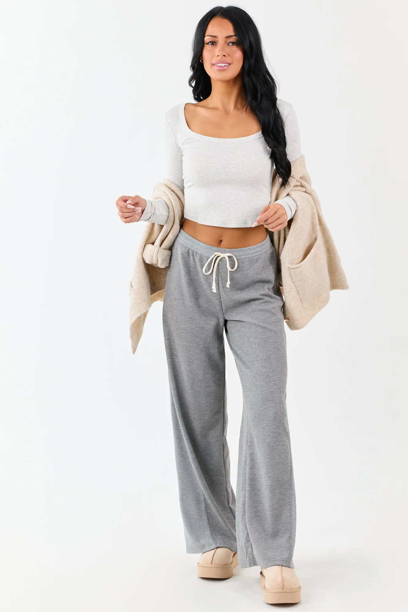 Embrace both style and comfort with these trendy grey waffle knit drawstring pants. Ideal for casual days in the city or travel, the relaxed wide leg silhouette and high-waisted design create a fashionable look. Made with a stretchy smocked waistband and featuring a 74% Polyester, 26% Cotton blend for a perfect fit. With a front rise of 12 inches, a back rise of 13 inches, and an inseam length of 30 inches, these pants are both chic and practical.