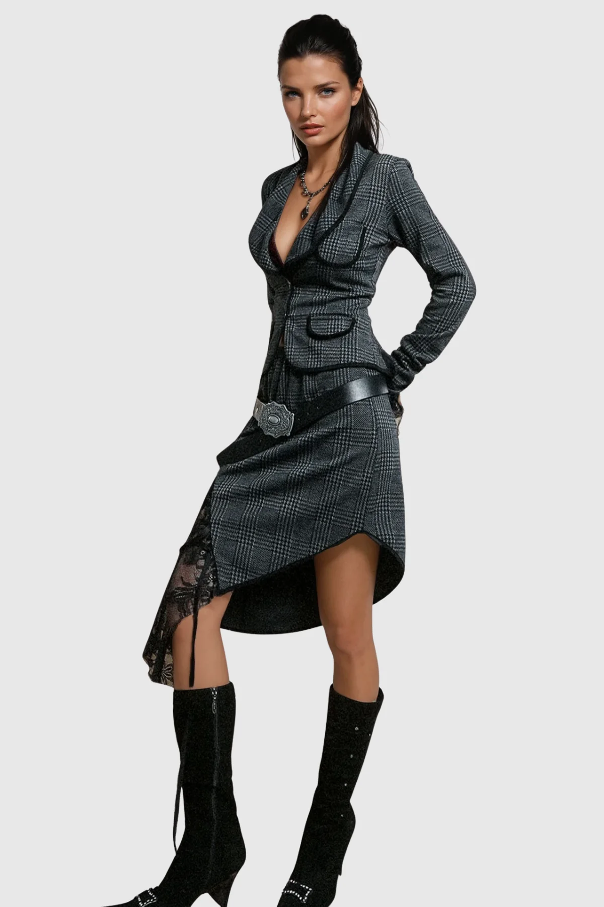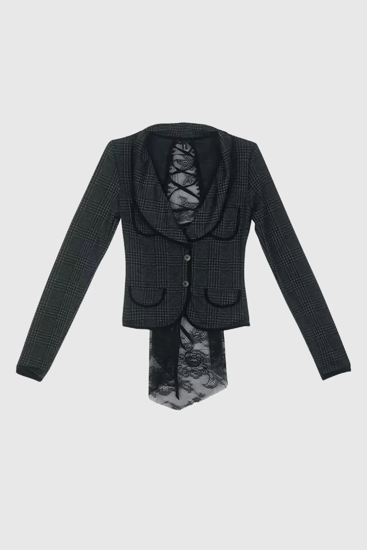 Enjoy refined sophistication with the Grid Lace Backless Lapel Skirt Set. This set combines delicate lace detailing, a structured lapel, and a contemporary grid pattern for a modern yet elegant ensemble. The backless design adds a touch of allure, while the skirt enhances your silhouette. Perfect for formal or stylish events, exude confidence with this polished outfit that strikes the perfect balance between elegance and trendiness. Due to lighting, actual color may vary from images shown. Machine wash gently for best care.